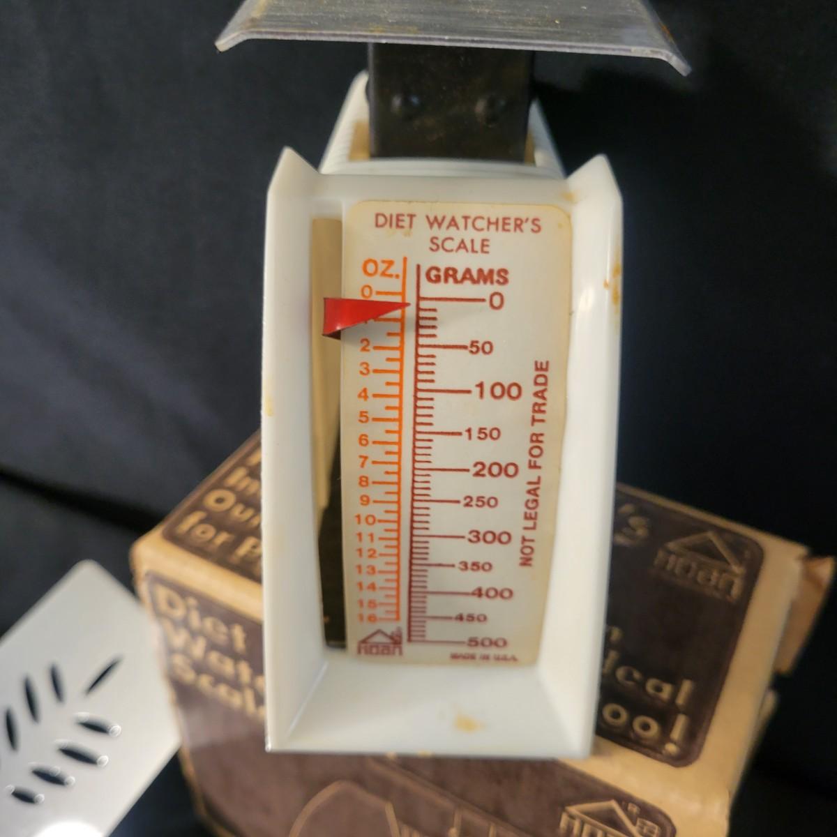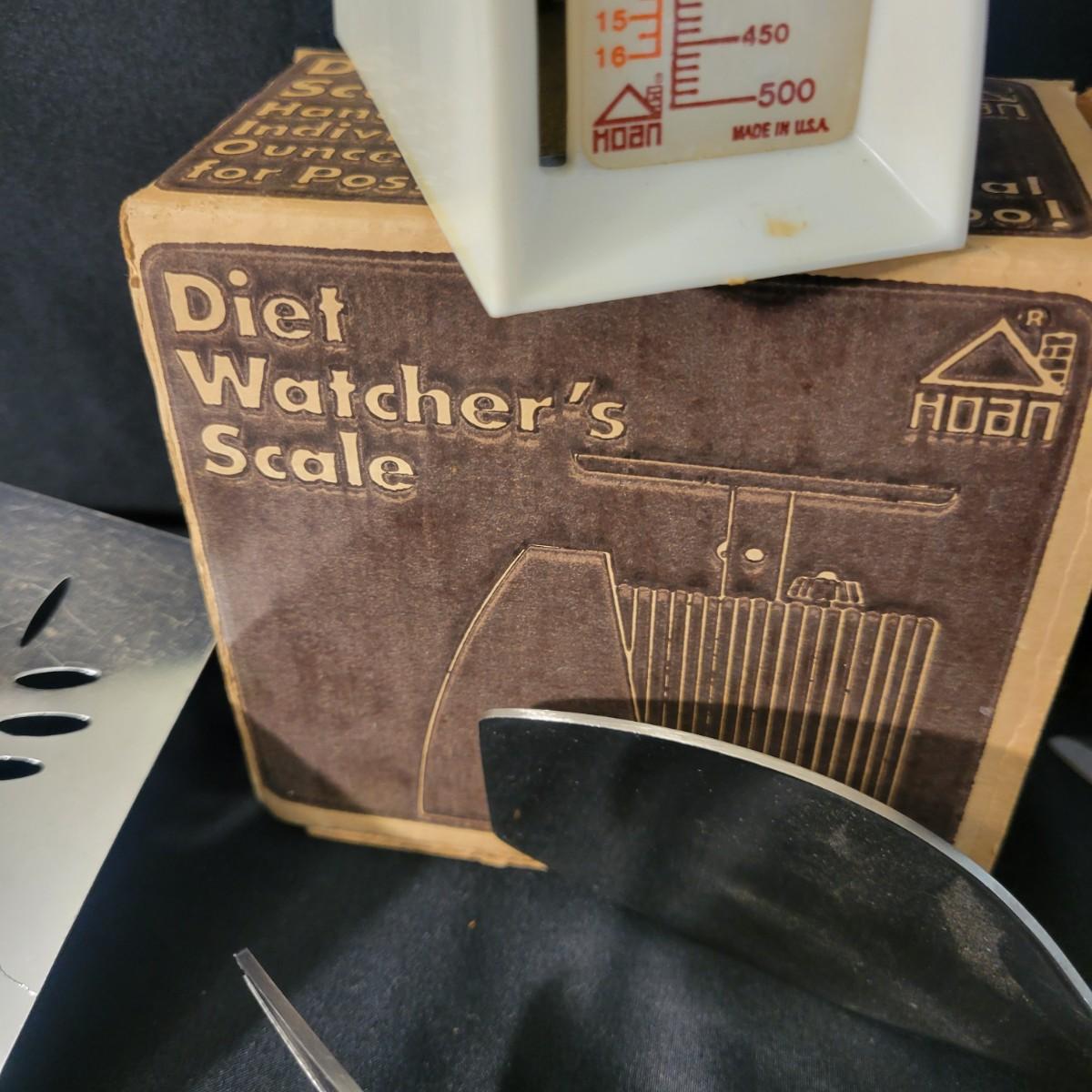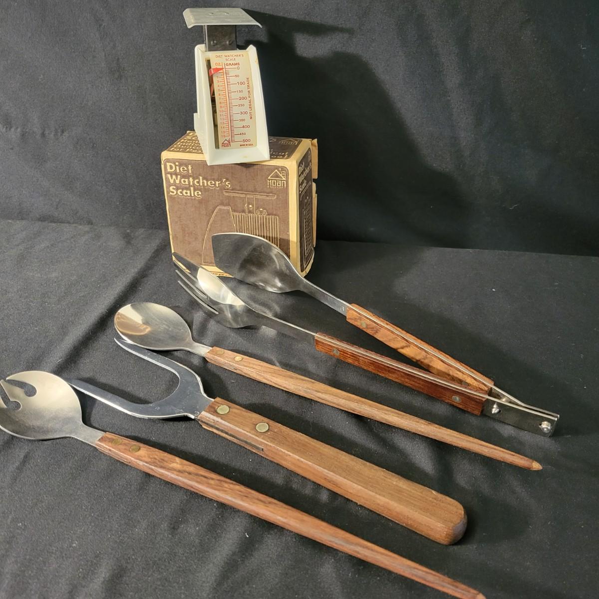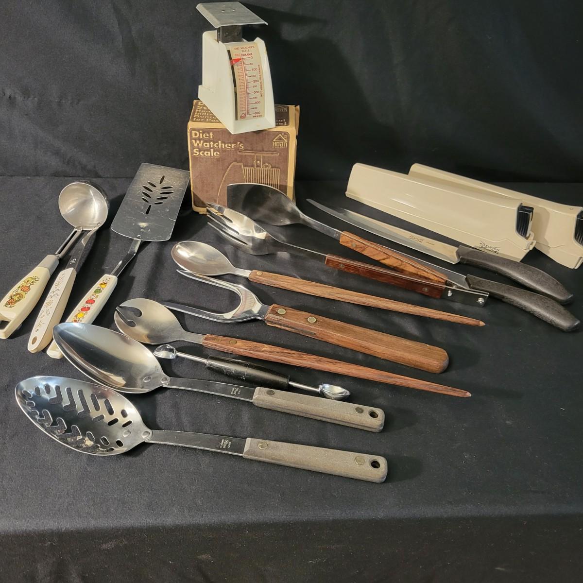 An assortment of retro kitchen utensils in good condition with no notable damage. Includes diet watchers scale with original box, multiple wooden handled utensils, three plastic handled utensils with vintage designs and Wilkinson Sword knives and sharpeners. Shipping available