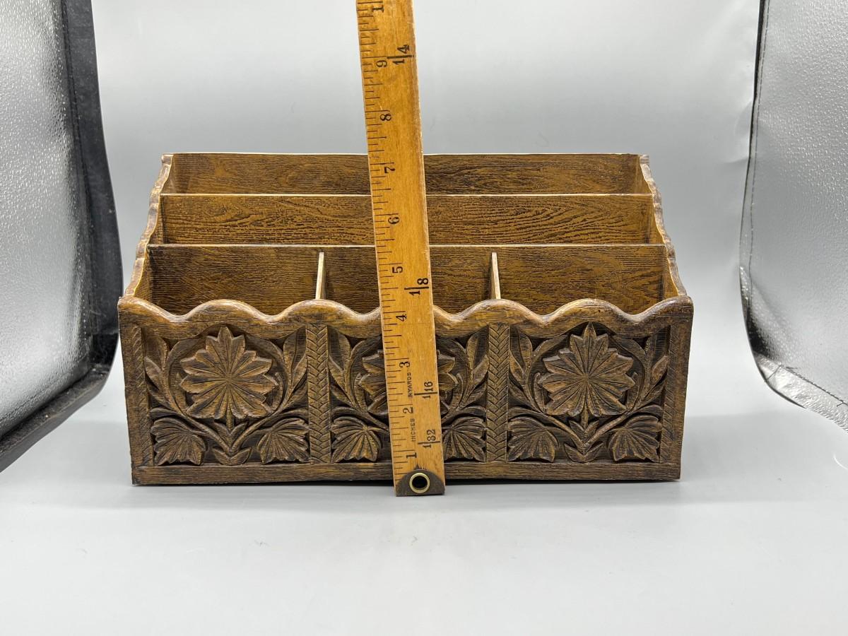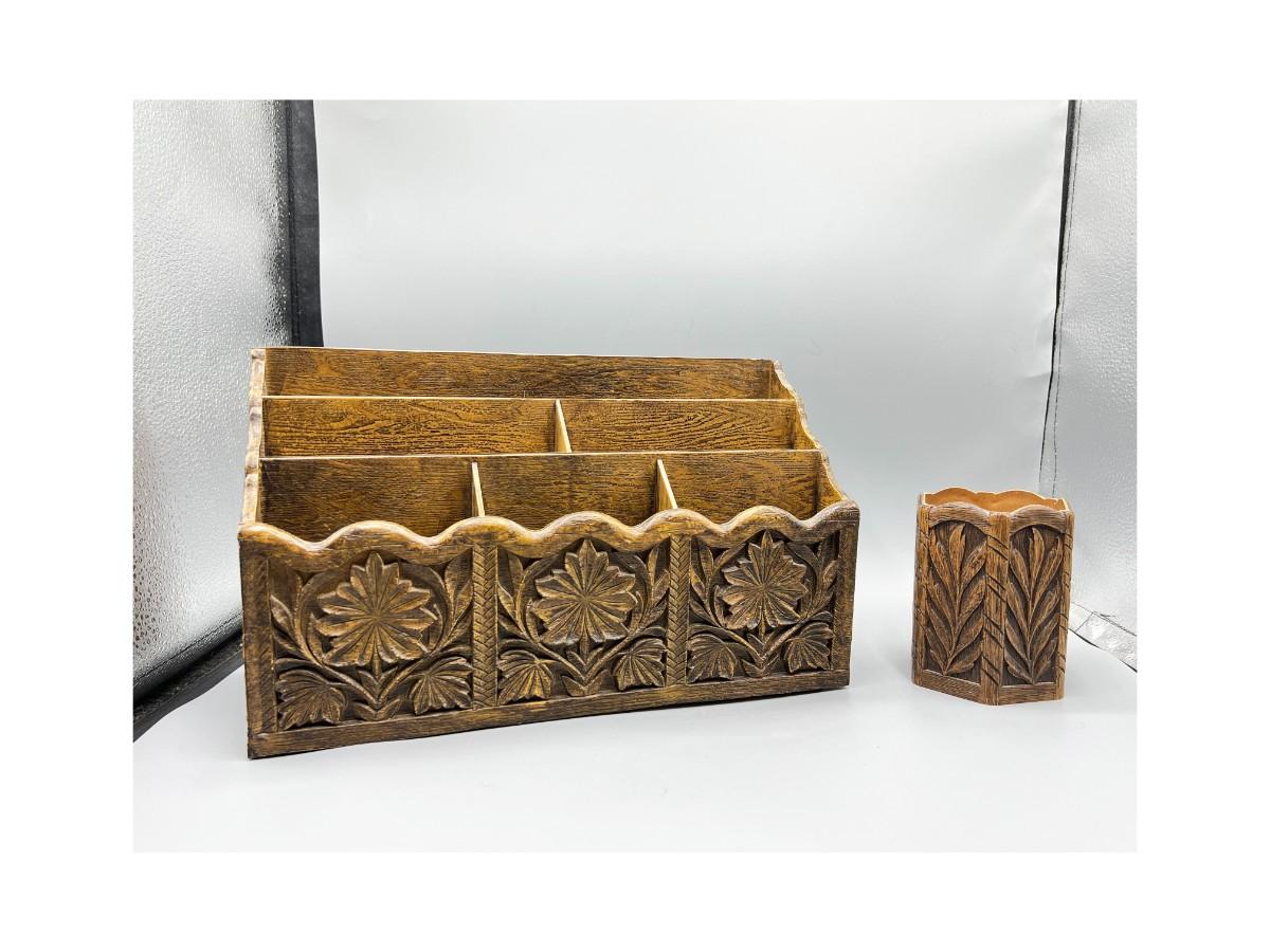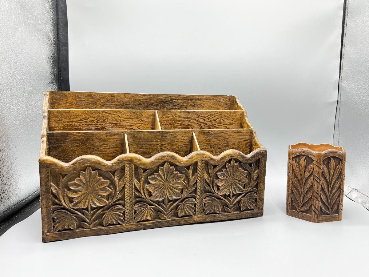 Retro Lerner Desktop Letter Holder Caddy Organizer Carved Faux Wood Plastic & Pencil Cup Holder