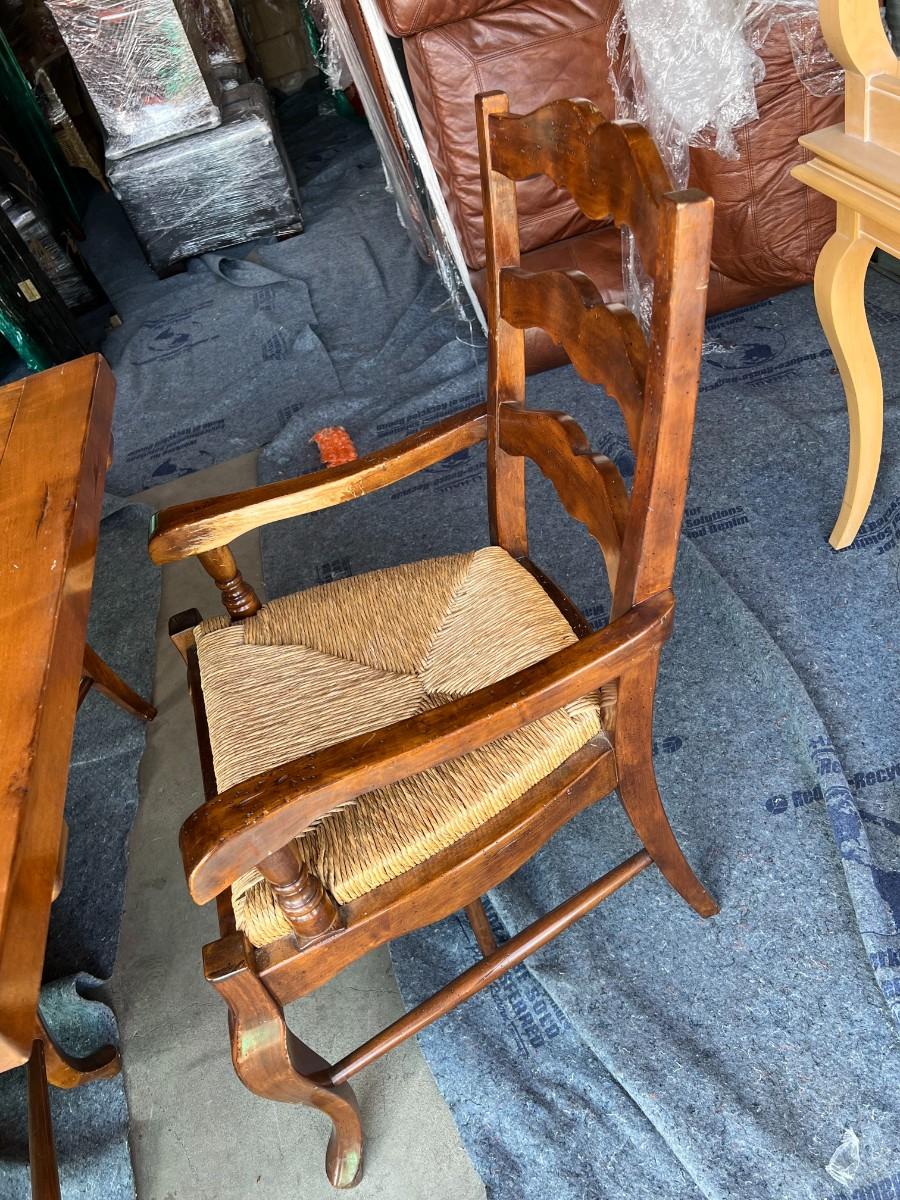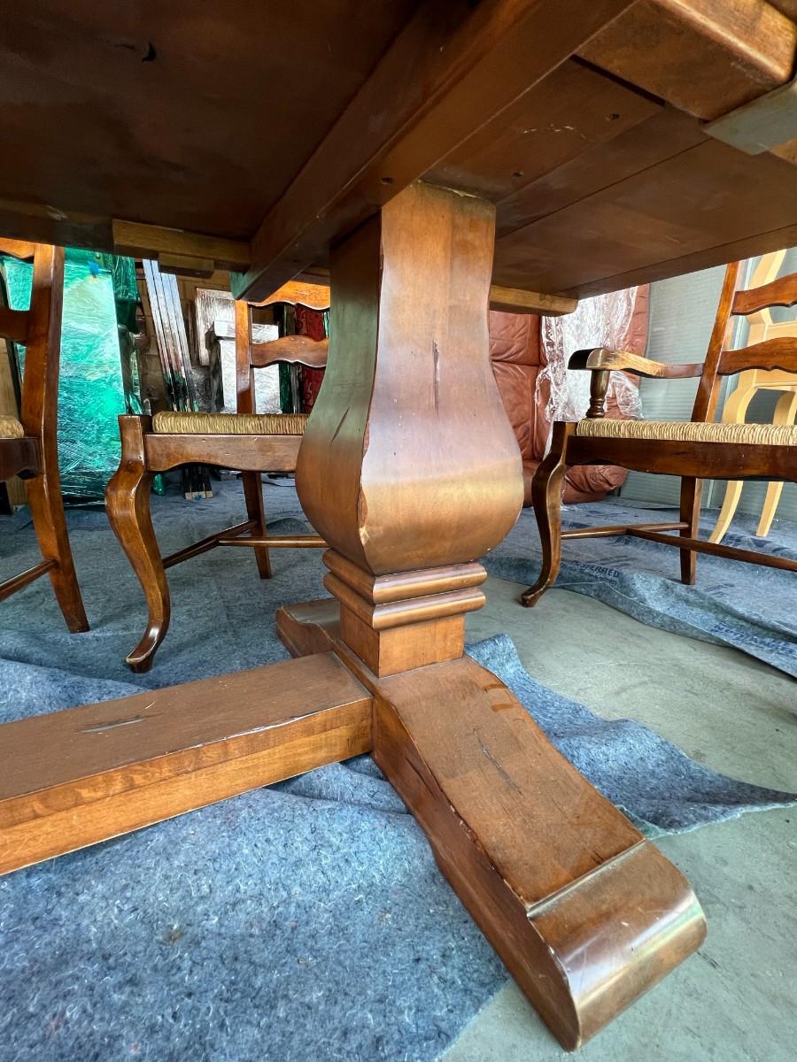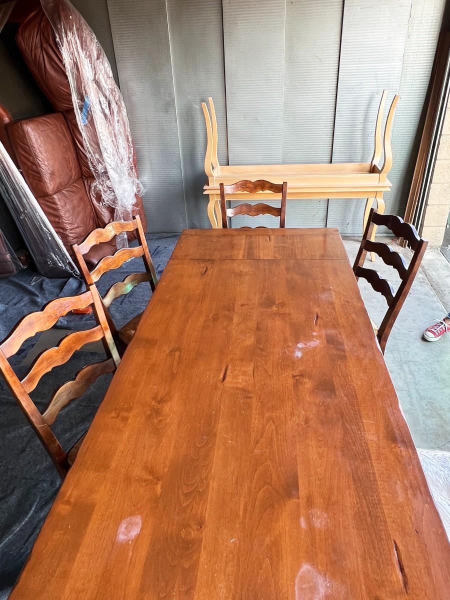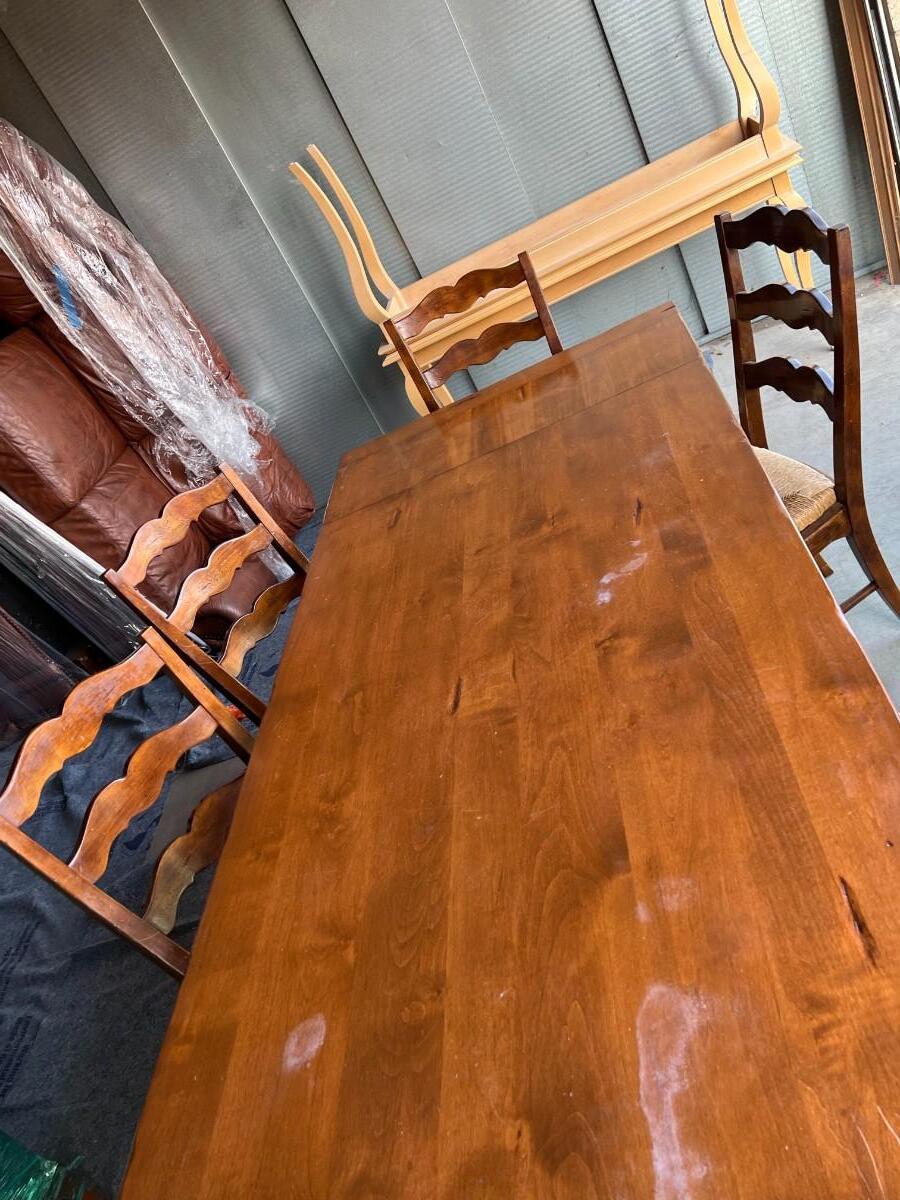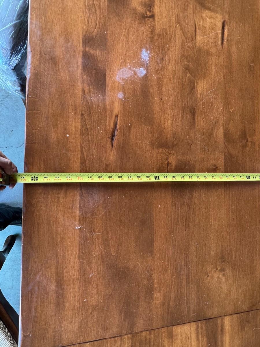 There is some light wear to the table, but there is no significant damage to any of the pieces and is in overall good useable condition. Comes with 5 regular chairs and 1 captain's chair, check pictures for more details and for sizing. Table measures around 97 inches with leaves and about 73 inches without the leaves.