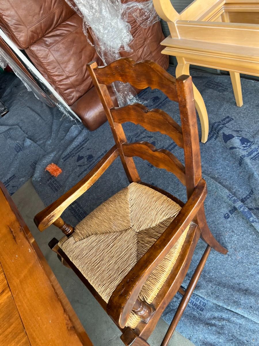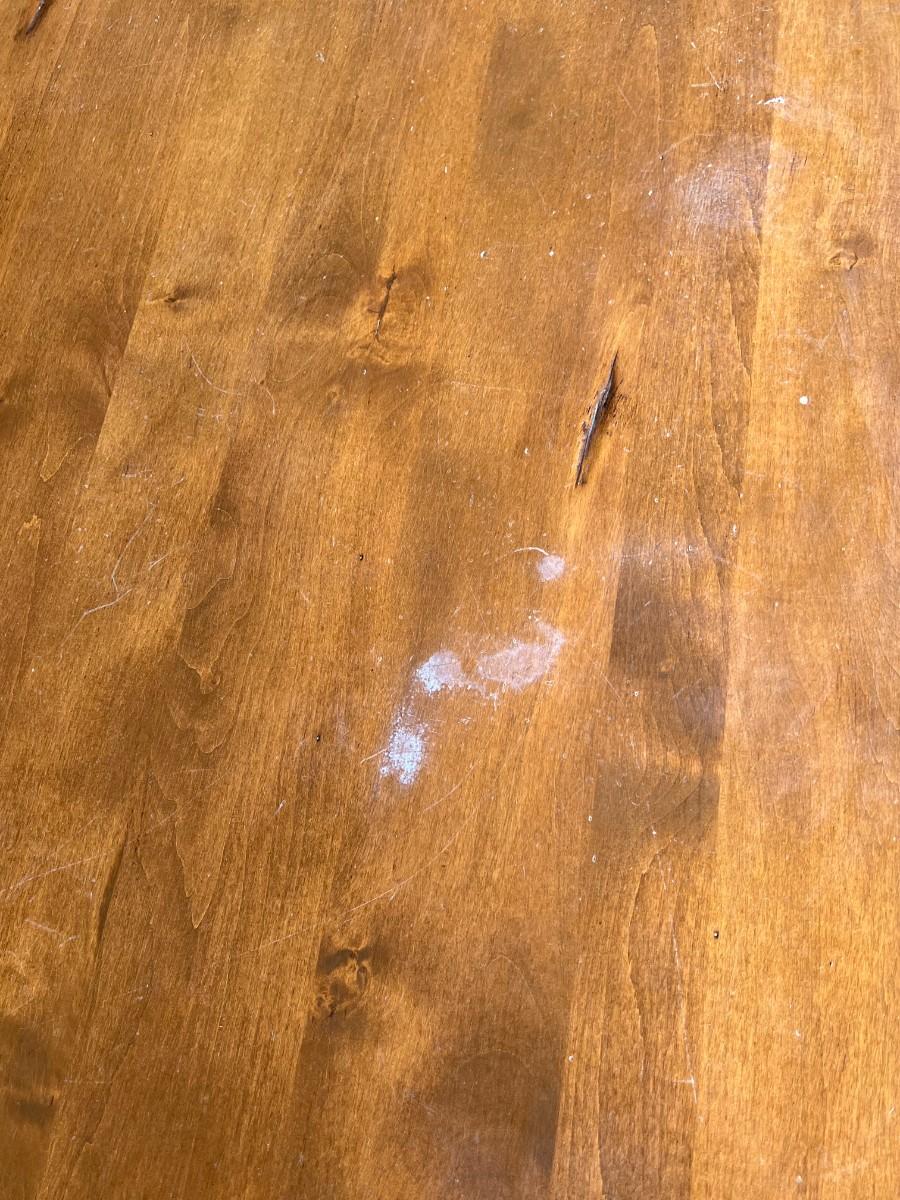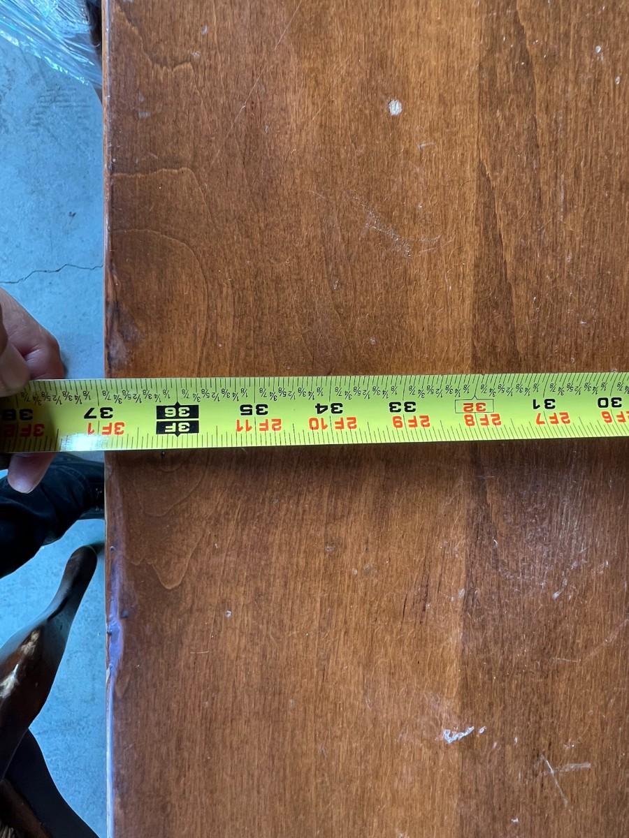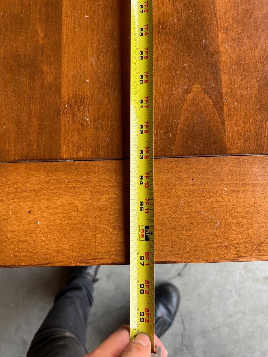 There is some light wear to the table, but there is no significant damage to any of the pieces and is in overall good useable condition. Comes with 5 regular chairs and 1 captain's chair, check pictures for more details and for sizing. Table measures around 97 inches with leaves and about 73 inches without the leaves.