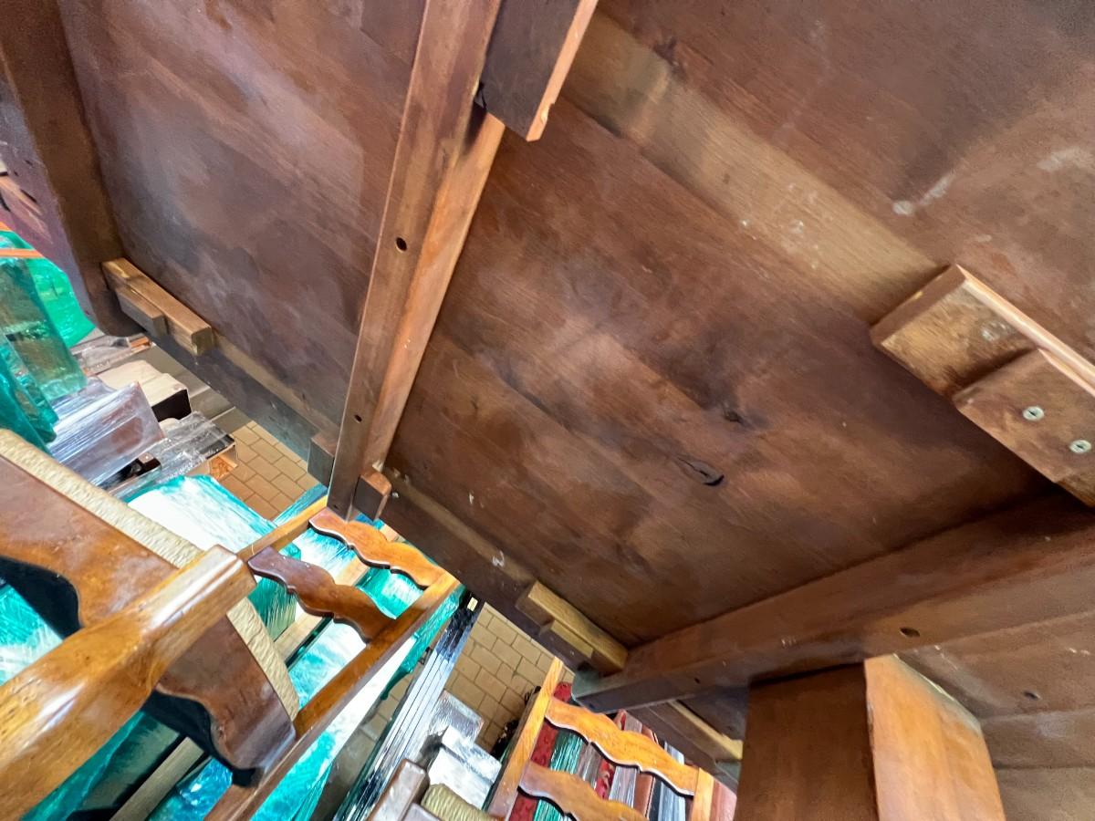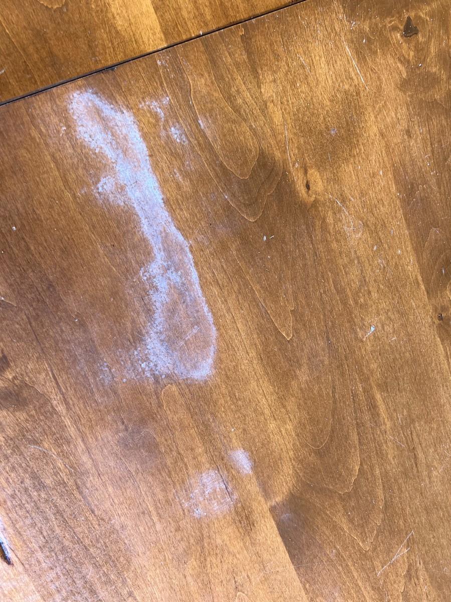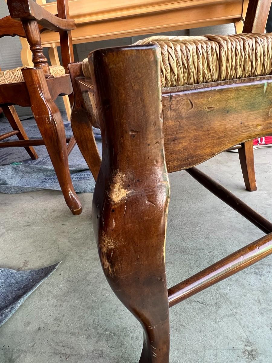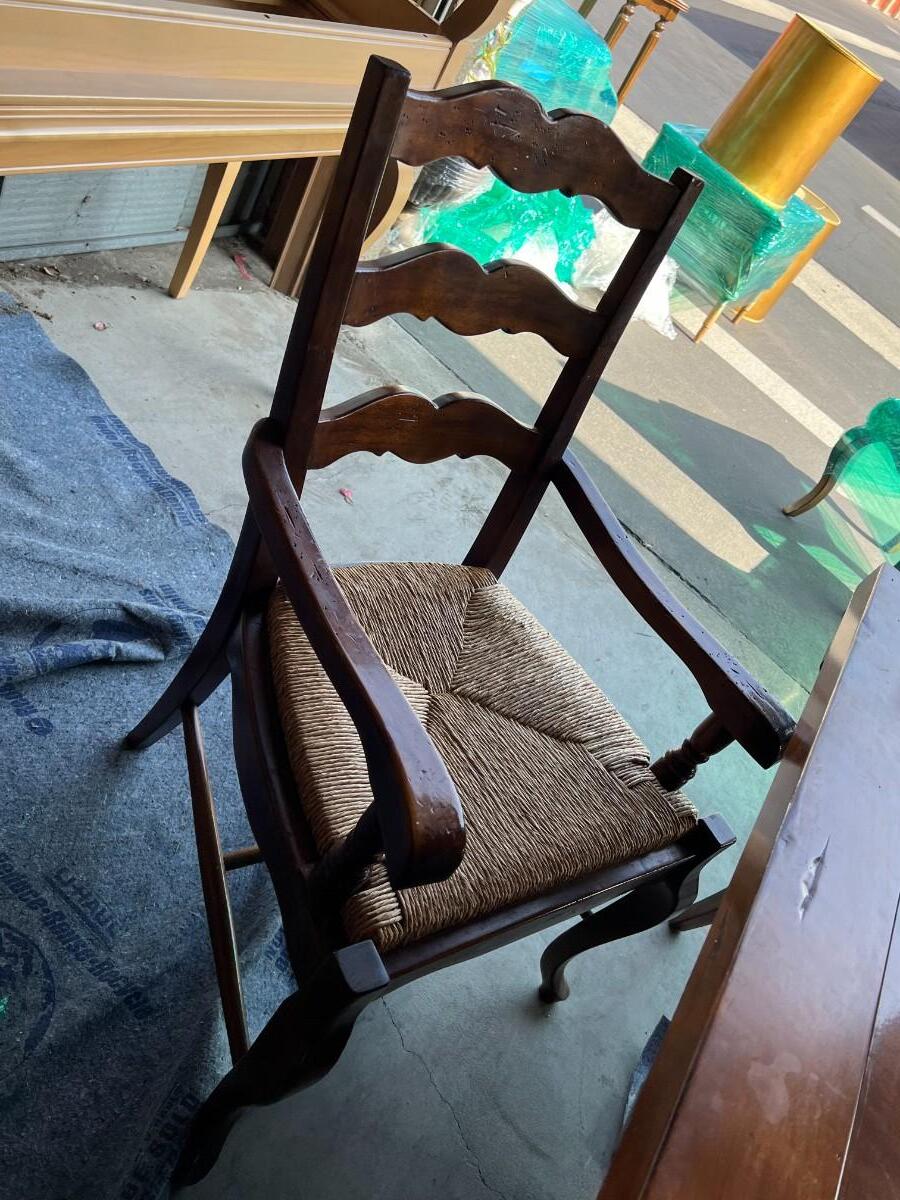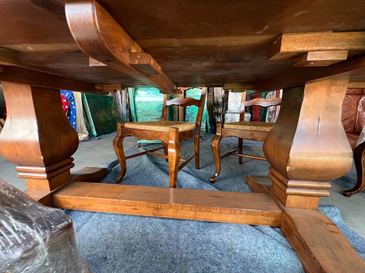 There is some light wear to the table, but there is no significant damage to any of the pieces and is in overall good useable condition. Comes with 5 regular chairs and 1 captain's chair, check pictures for more details and for sizing. Table measures around 97 inches with leaves and about 73 inches without the leaves.