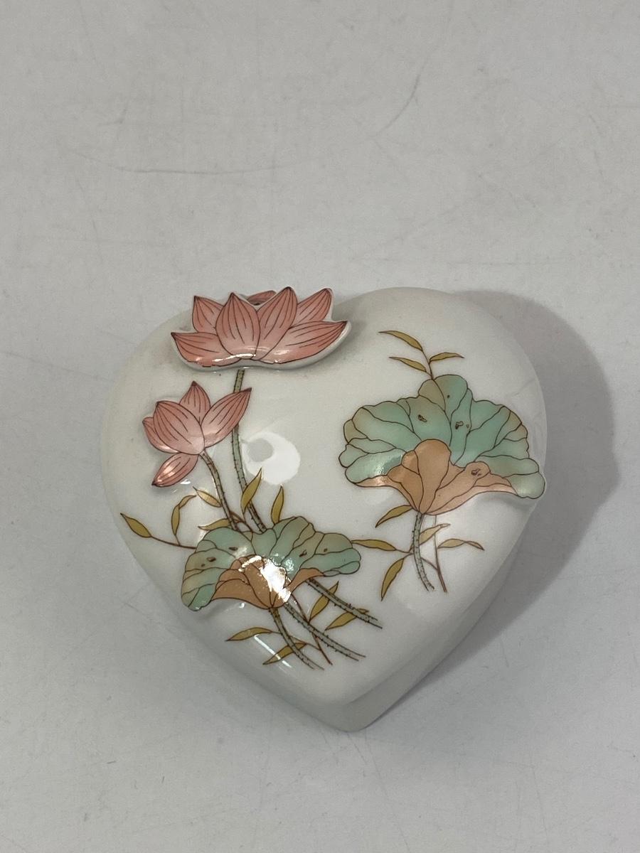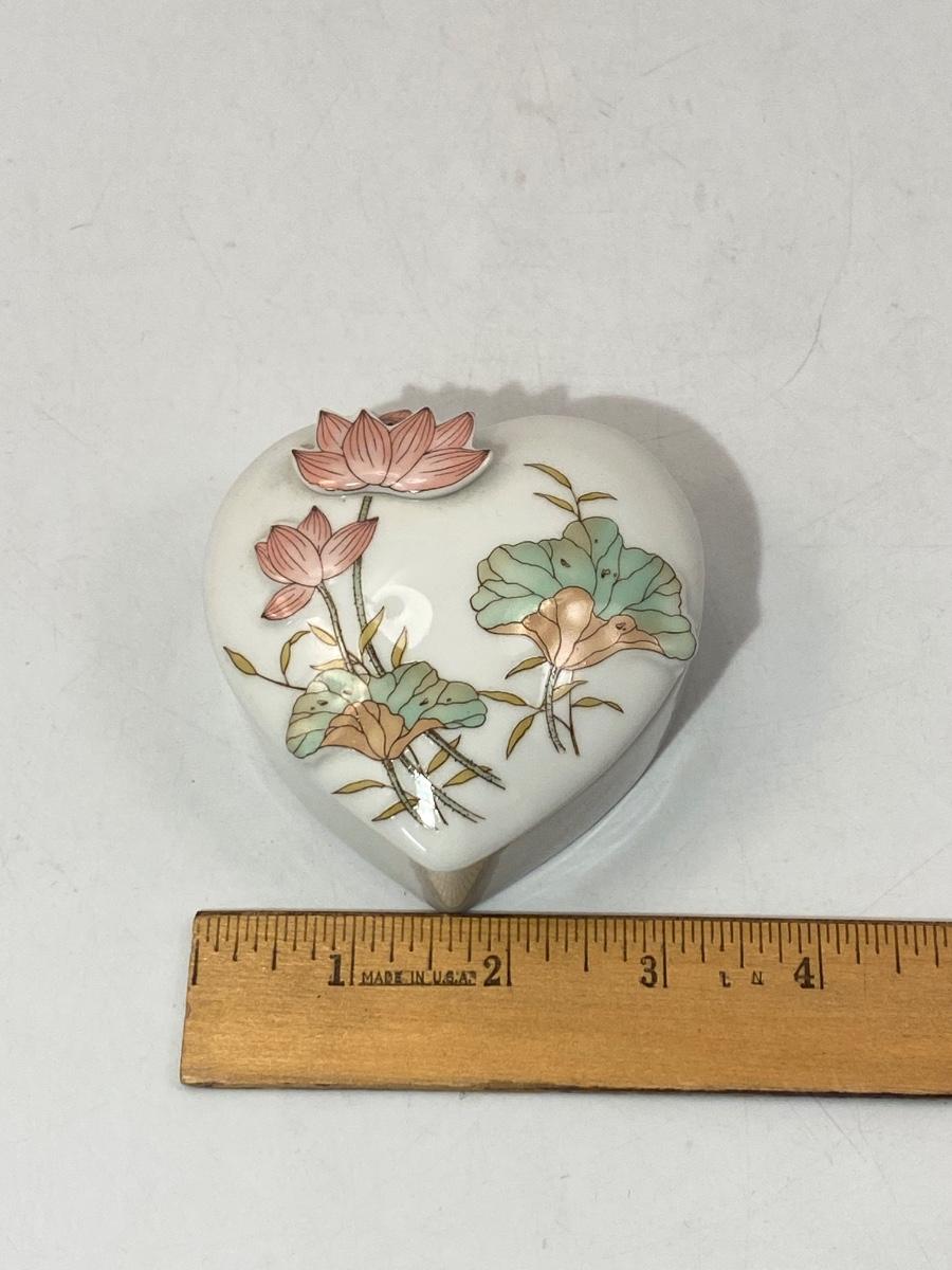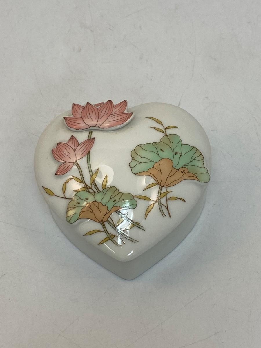 Retro Lotus Flower & Ginkgo Leaf Patterned Heart Shaped Trinket Box. In good condition. Unbranded.