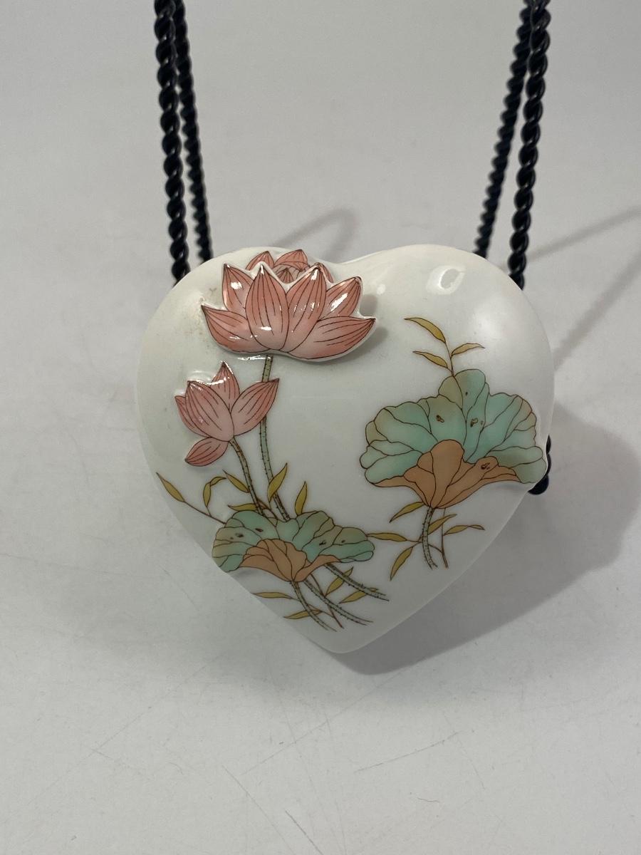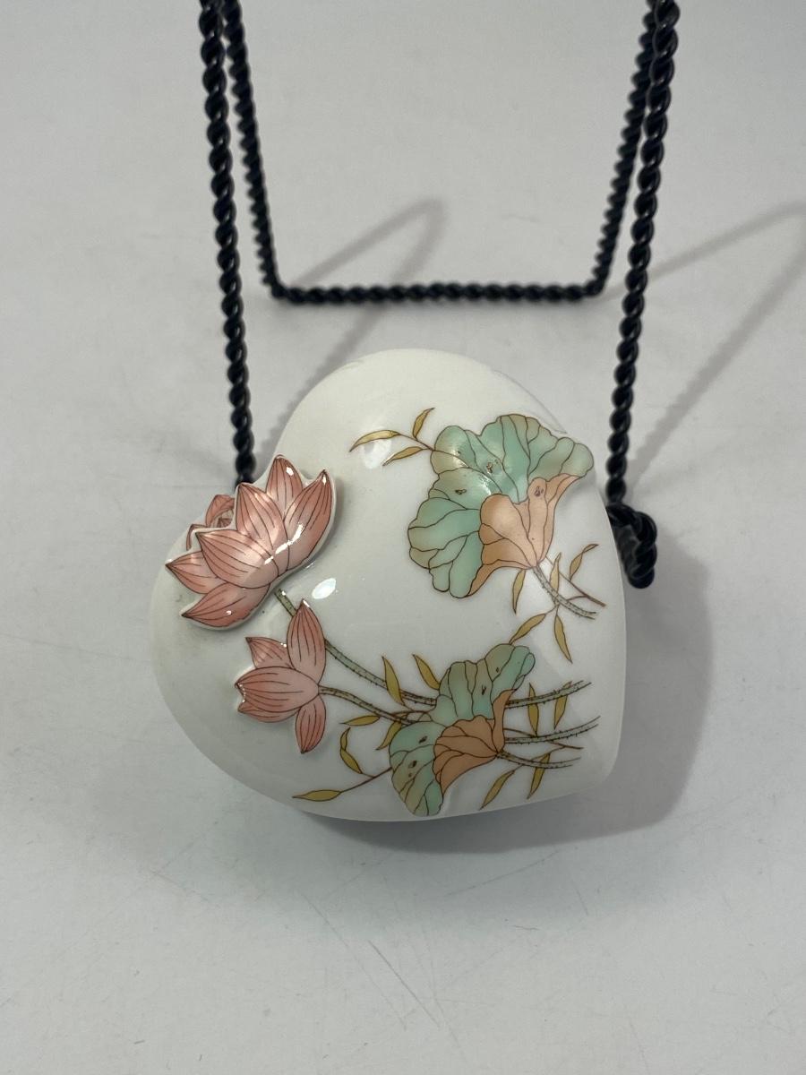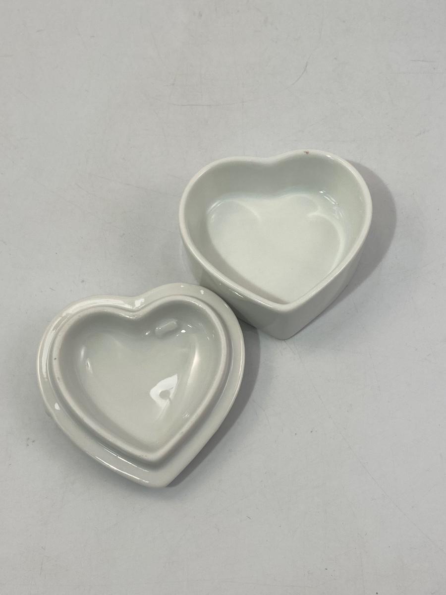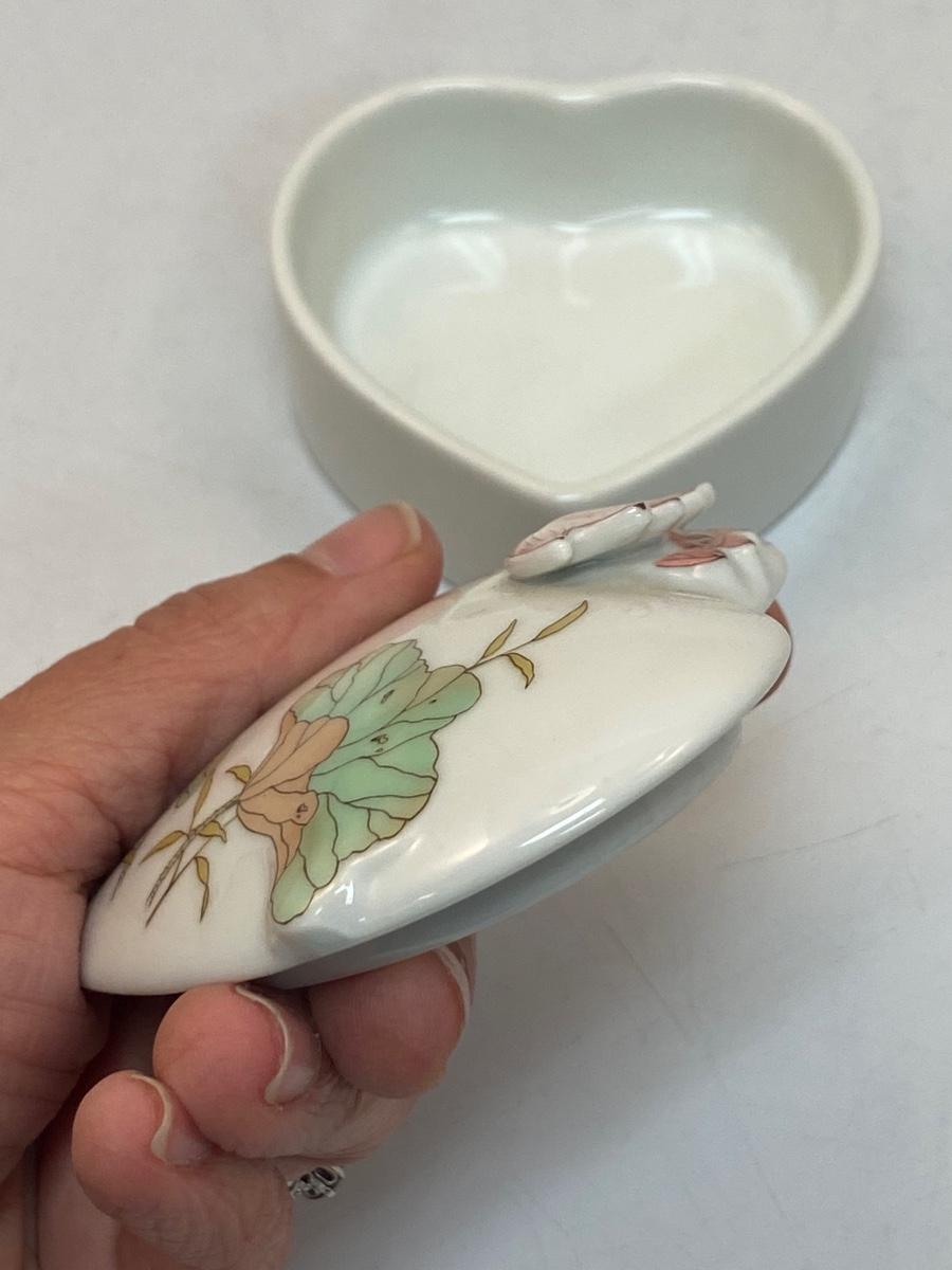 Retro Lotus Flower & Ginkgo Leaf Patterned Heart Shaped Trinket Box. In good condition. Unbranded.