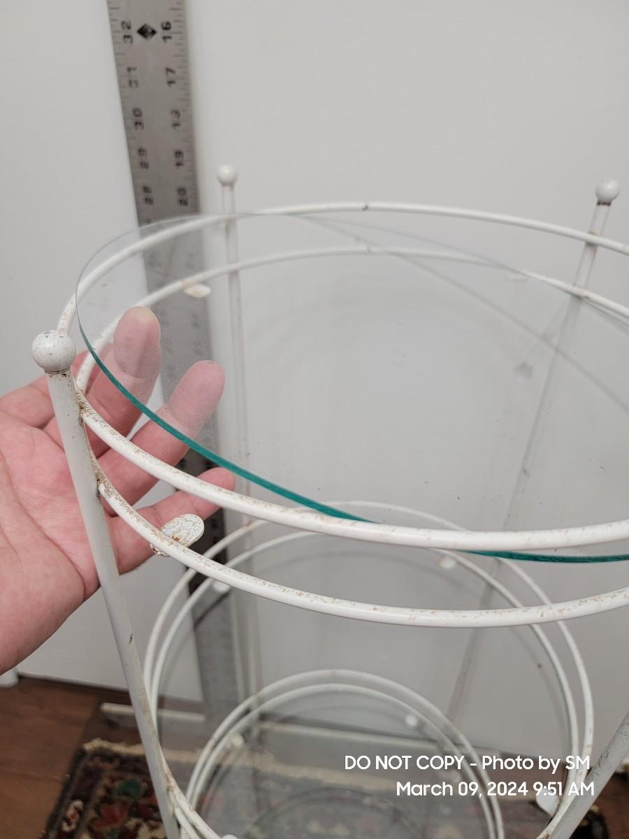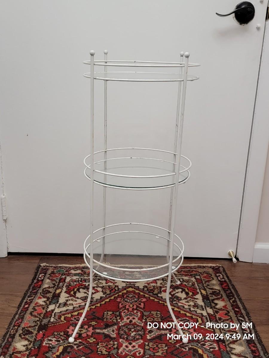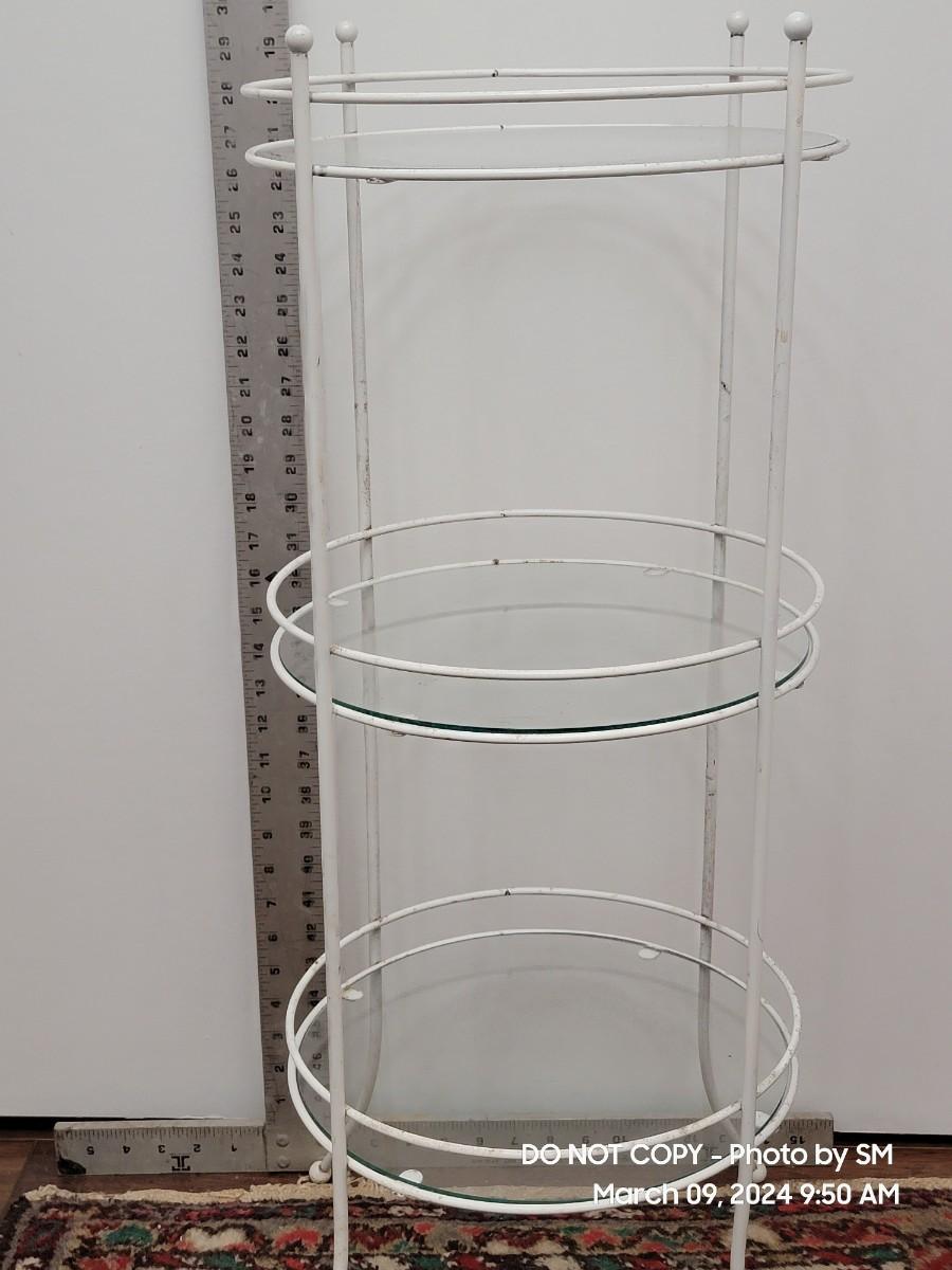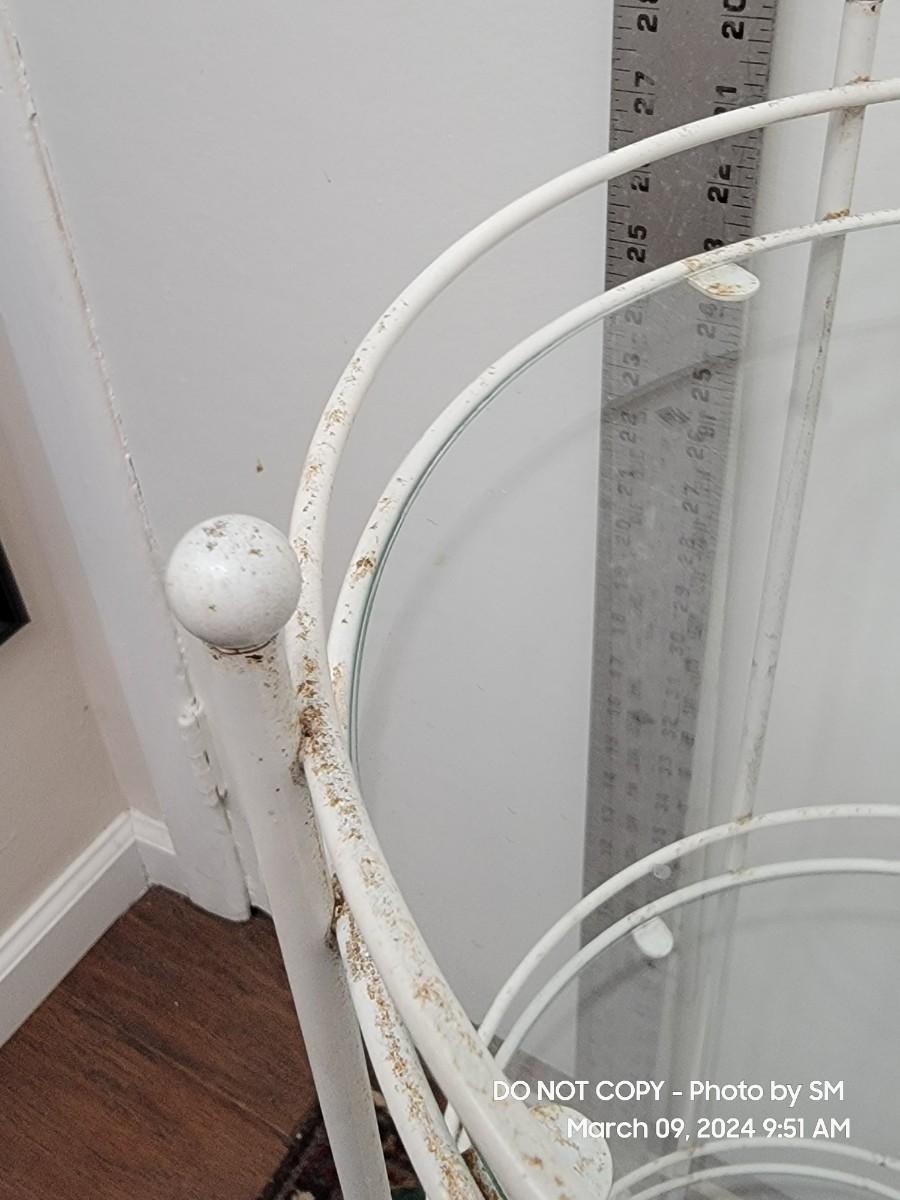 Here is a lovely retro white metal and glass shelves retro plant stand. 1970s, and its a tiny bit out of alignment- no big deal. It has a barley noticeable wobble, also depends on your floors. The bottom shelf seems off level to me. The frame has discoloration all over, you may need a scrubbing or repaint. I find it charming as is with the crud because it shows off her age. Shelves are good and present, the edges may be a little rough but its a shelf who cares.