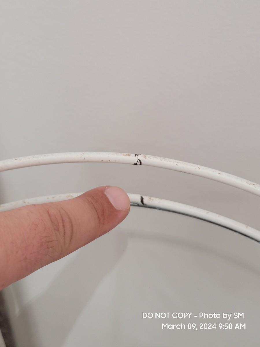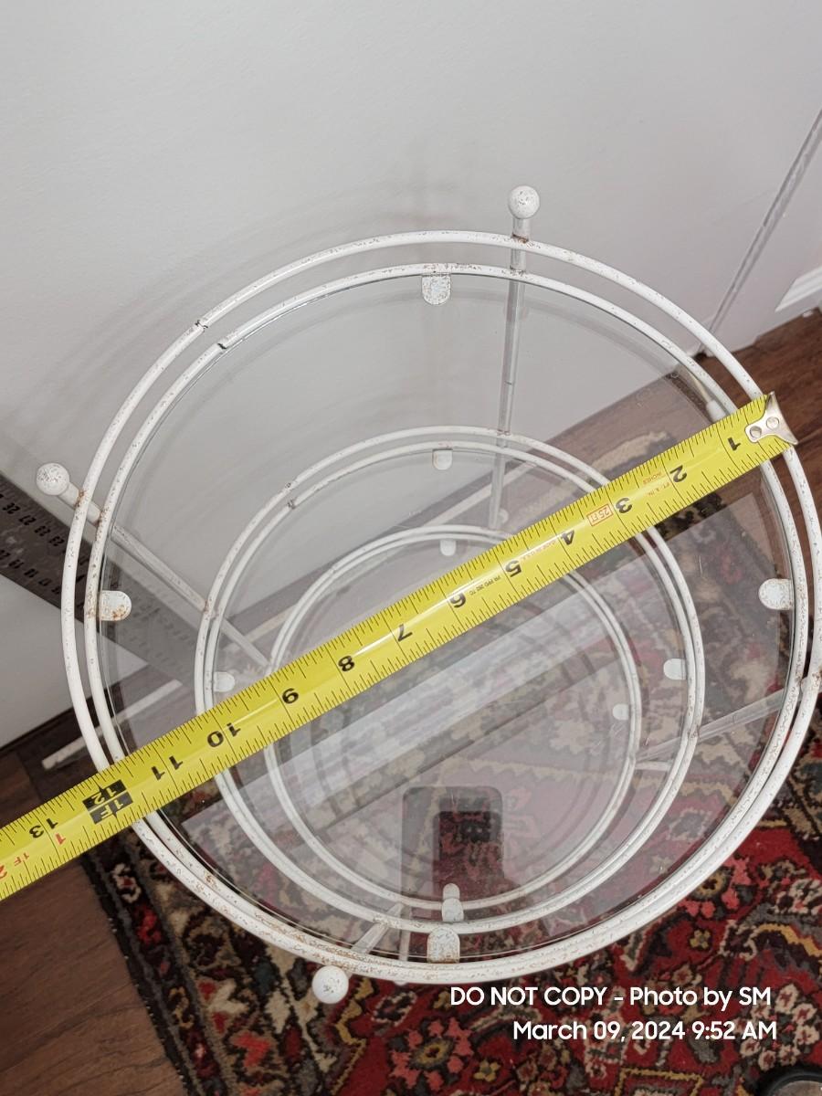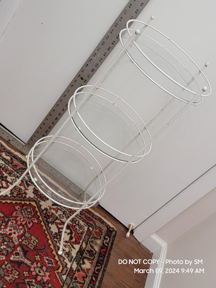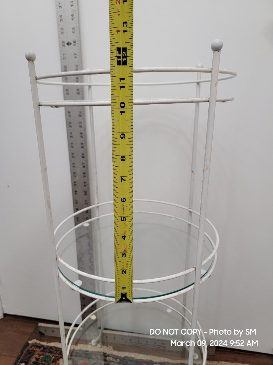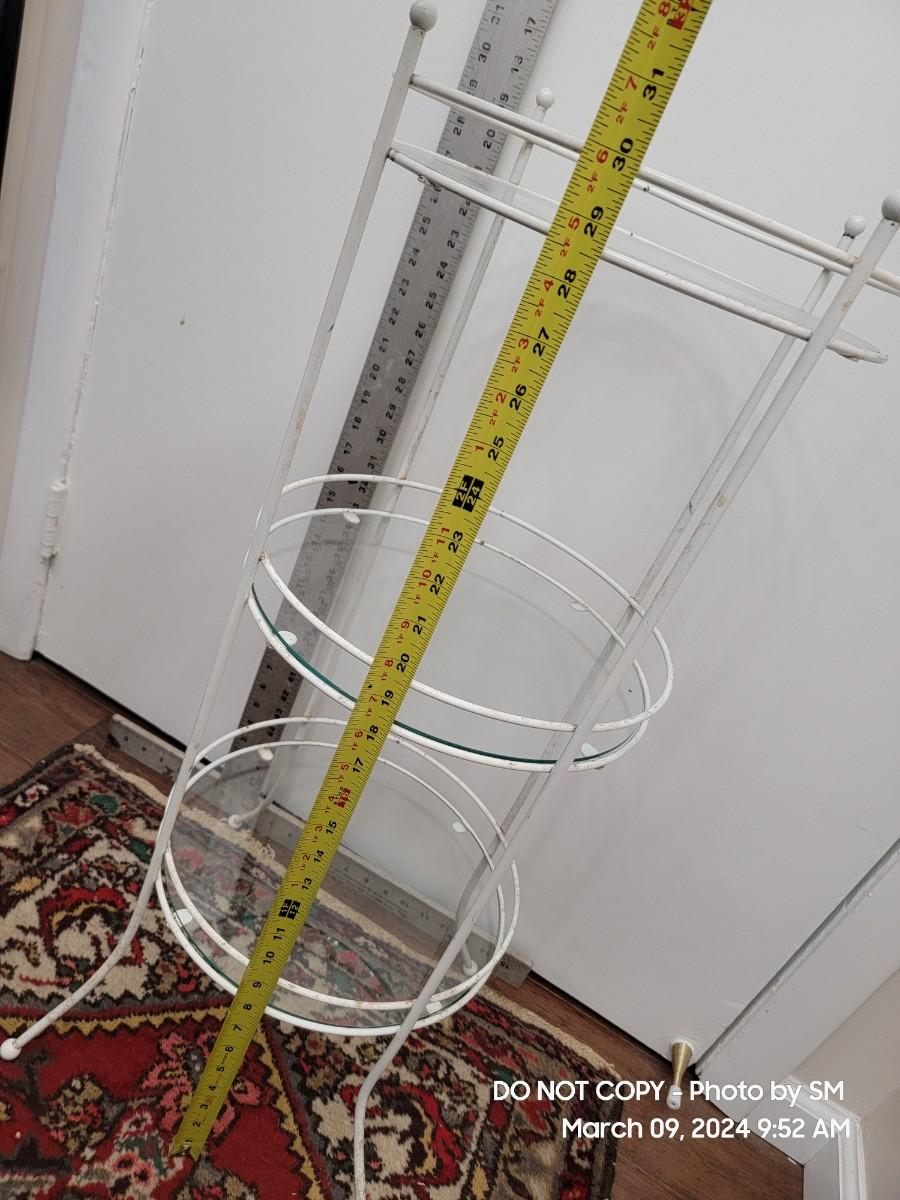 Here is a lovely retro white metal and glass shelves retro plant stand. 1970s, and its a tiny bit out of alignment- no big deal. It has a barley noticeable wobble, also depends on your floors. The bottom shelf seems off level to me. The frame has discoloration all over, you may need a scrubbing or repaint. I find it charming as is with the crud because it shows off her age. Shelves are good and present, the edges may be a little rough but its a shelf who cares.