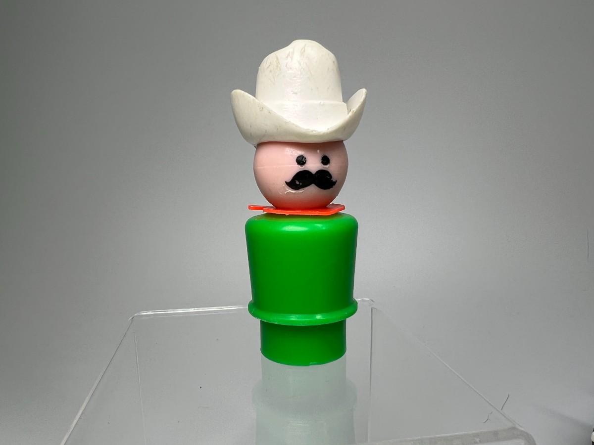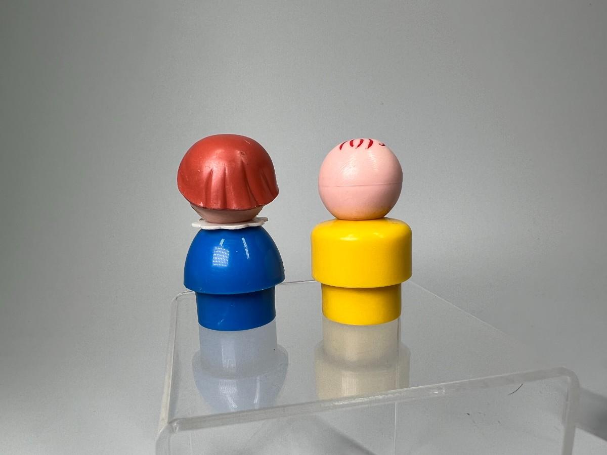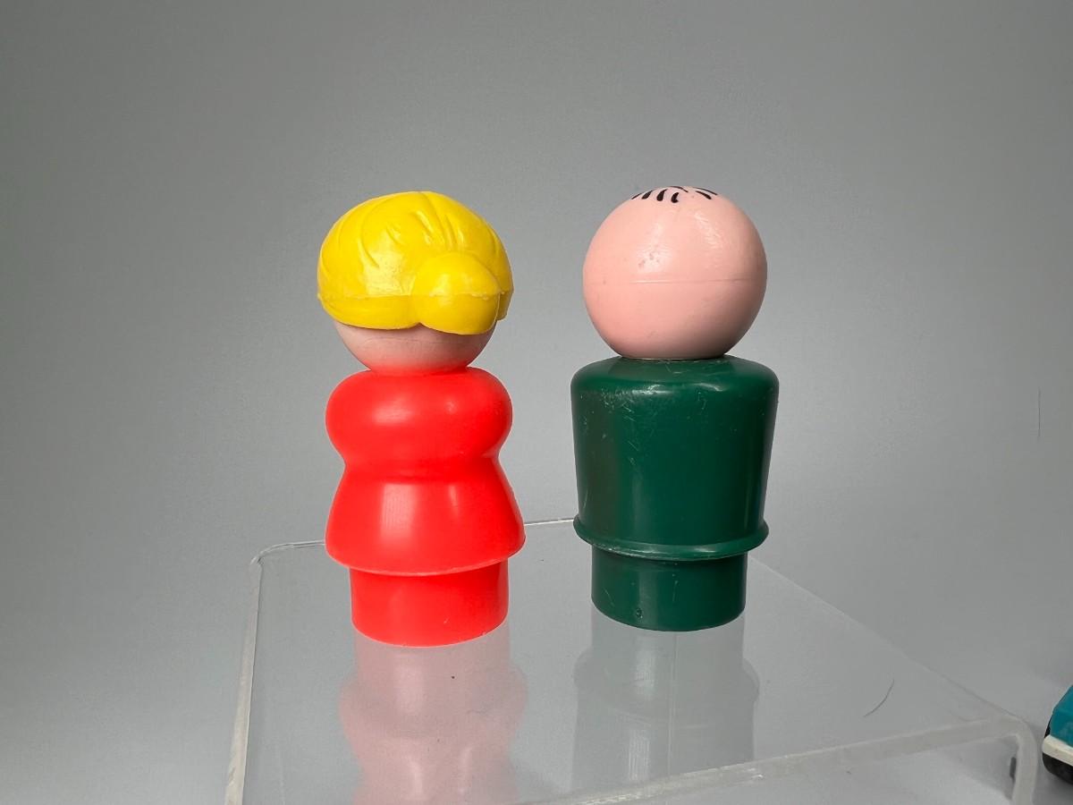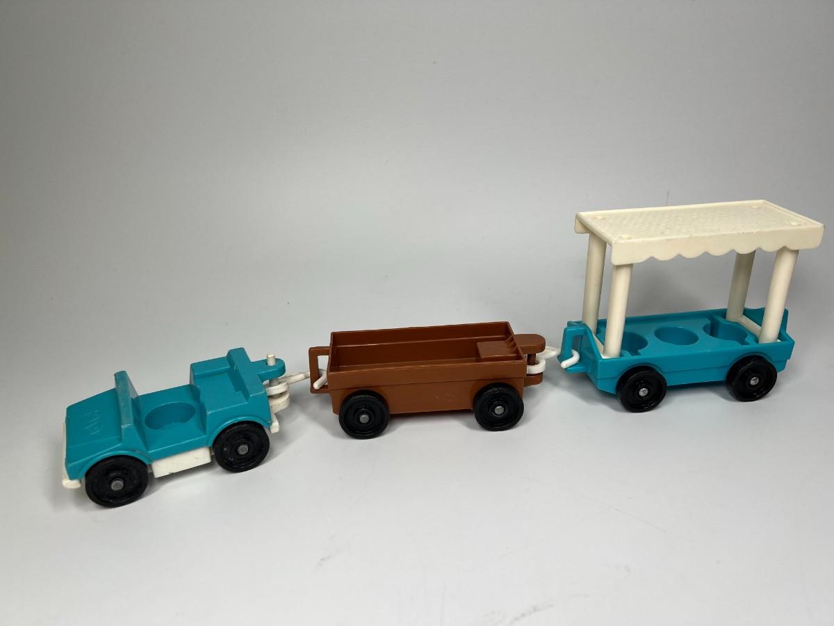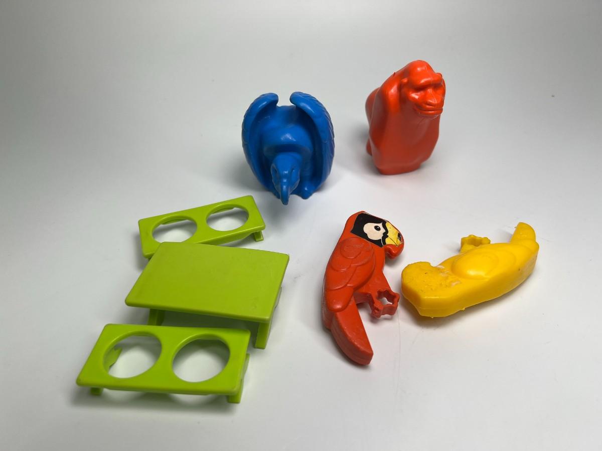 Classic Fisher Price Little People play set ZOO. Released mid 1980s. Good played with condition, set is incomplete. Included with the Zoo base is the orange aviary, 3-piece zoo tram, green picnic table, 2 green picnic benches, blue vulture, red parrot, yellow parrot, red gorilla, blue dad with black heat-stamped hair, red mom with fancy eyes and a blonde ponytail, yellow boy with red heat-stamped hair, blue girl with a light brown sculpted bob, dark green man/zookeeper with a hat, a red scarf, and a big black moustache.