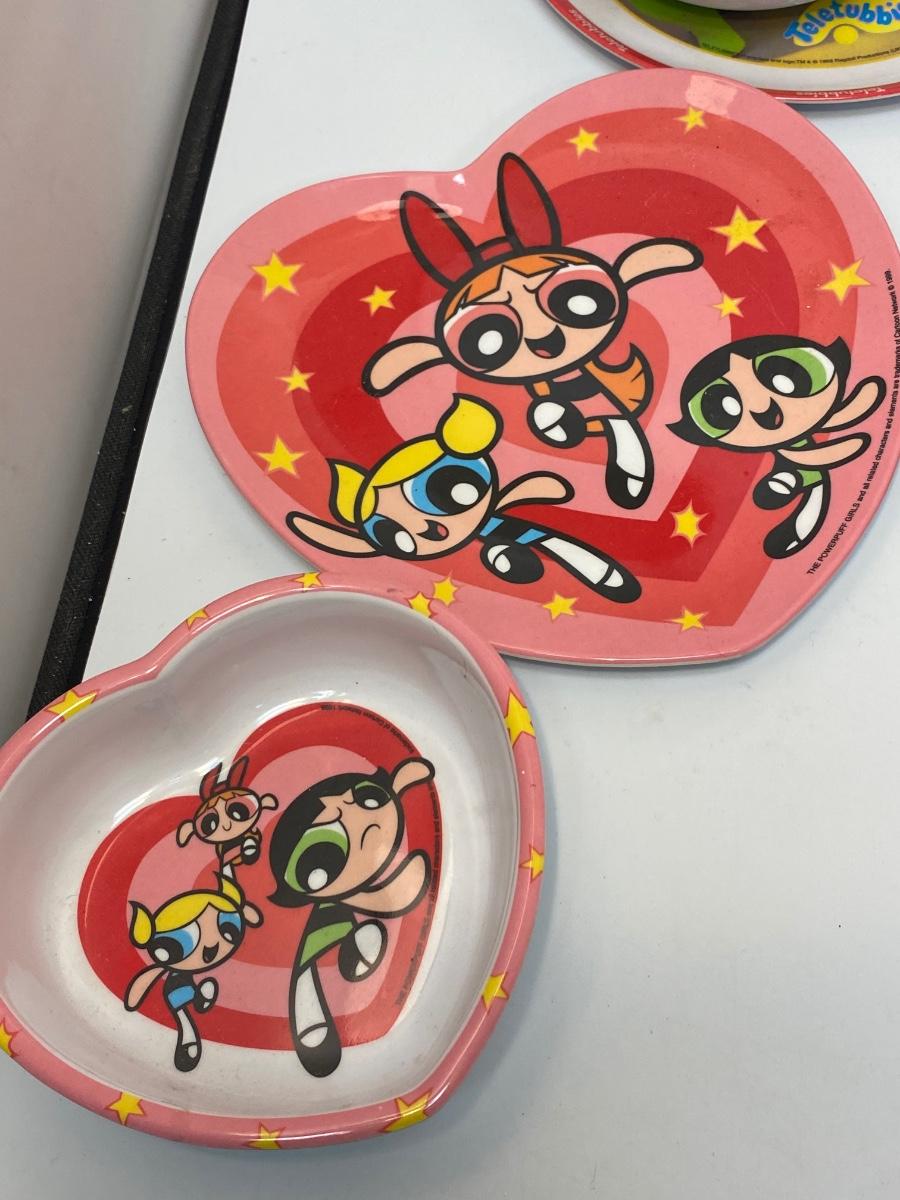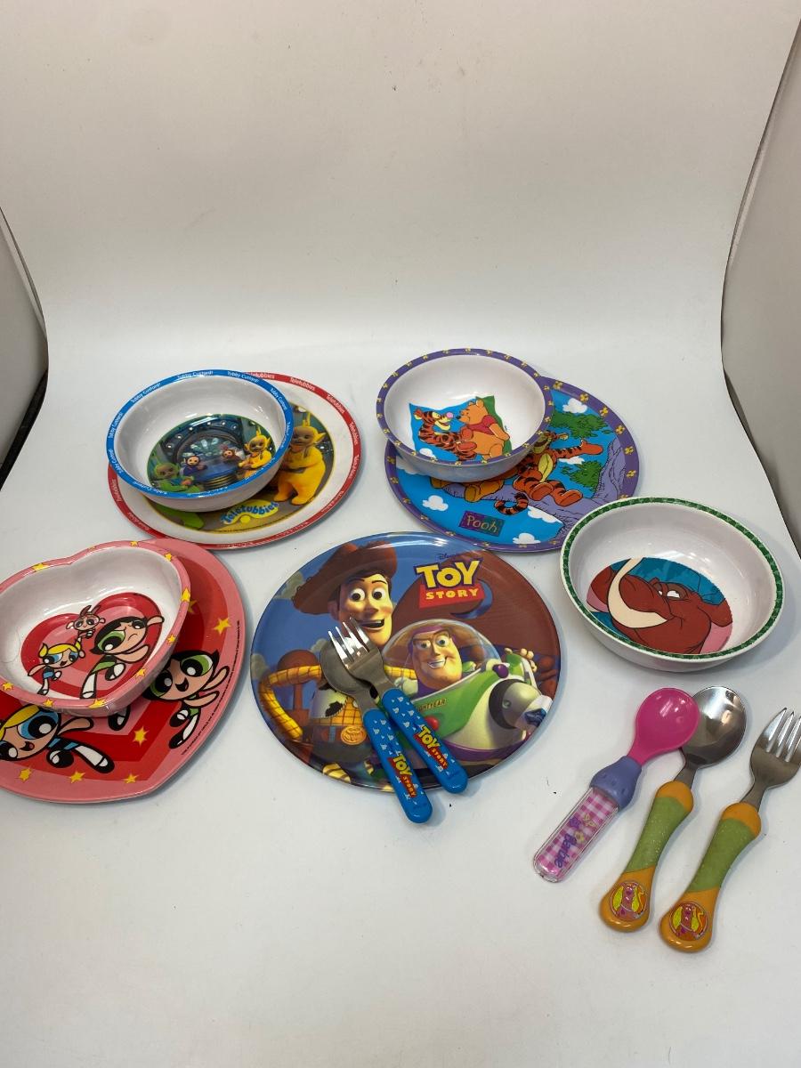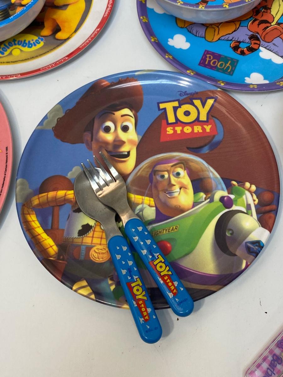 Retro Mixed Character Lot of Children's Plastic Dishware. Powerpuff Girls, Teletubbies, Winnie the Pooh, Toy Story, Tarzan, Scooby Doo, and Barbie.