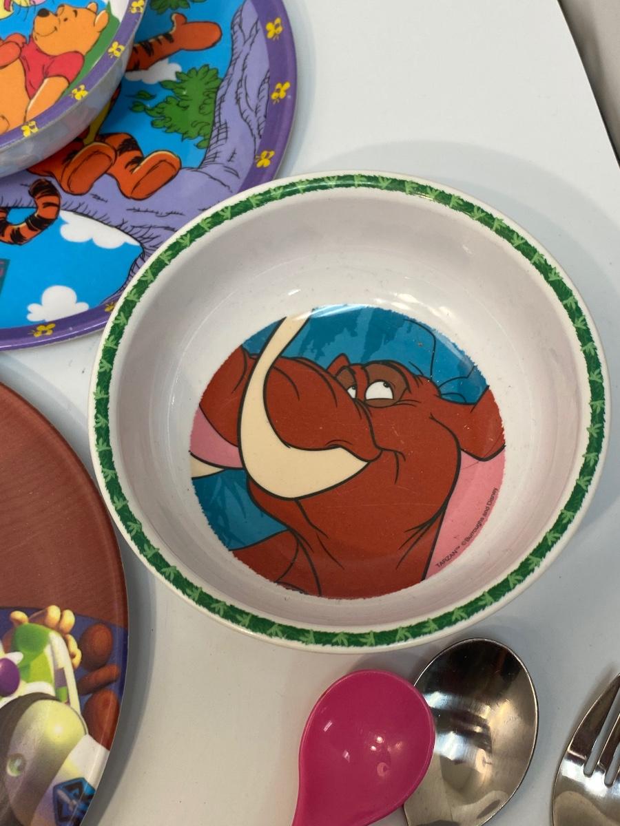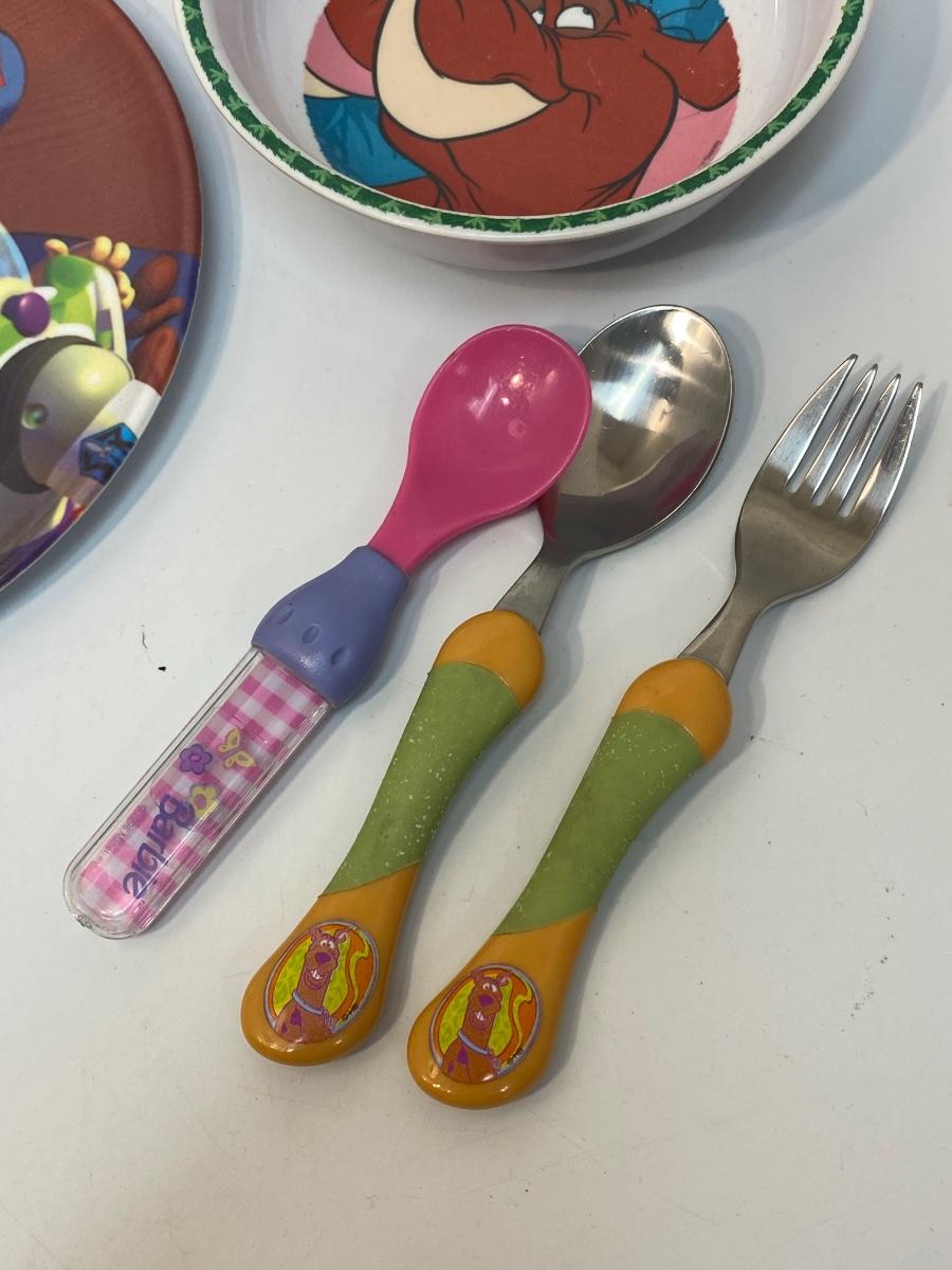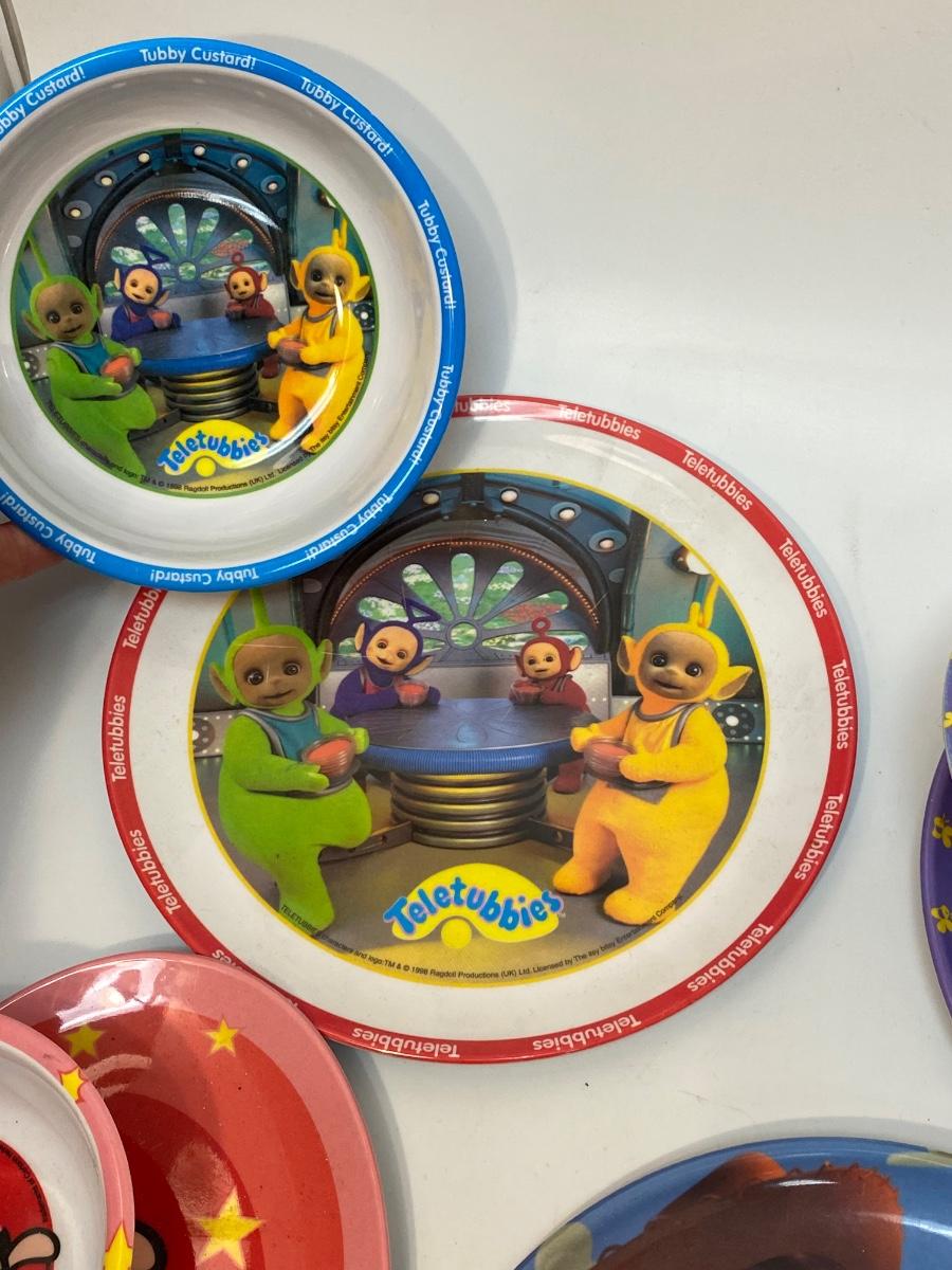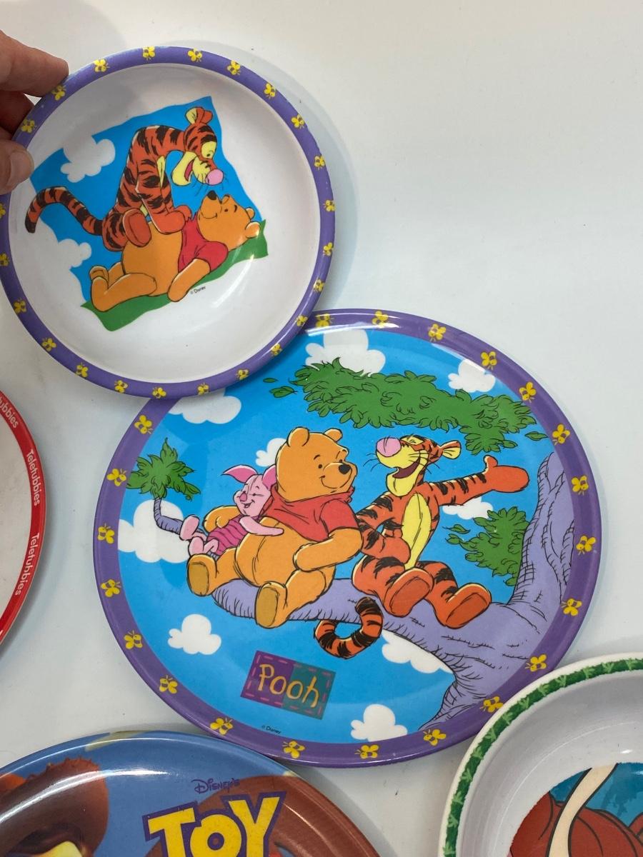 Retro Mixed Character Lot of Children's Plastic Dishware. Powerpuff Girls, Teletubbies, Winnie the Pooh, Toy Story, Tarzan, Scooby Doo, and Barbie.