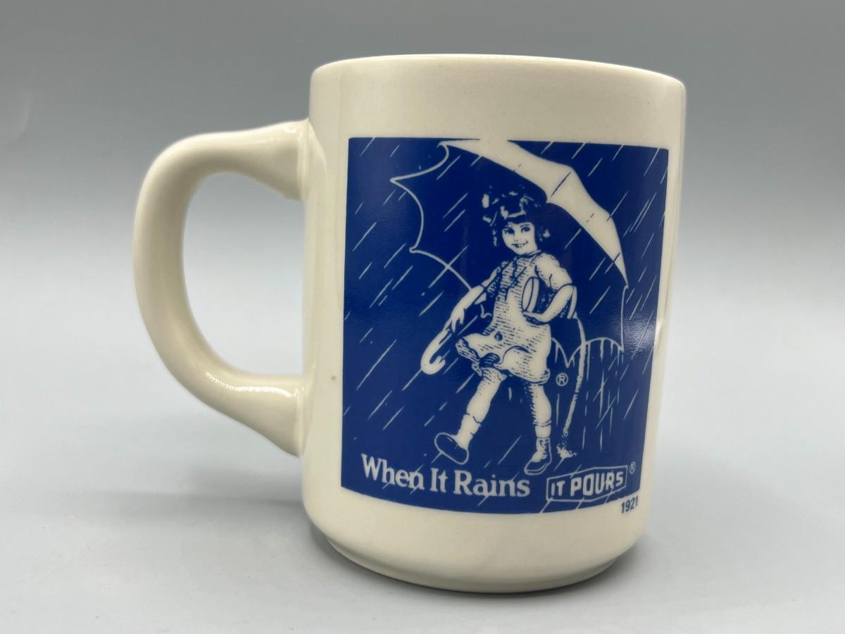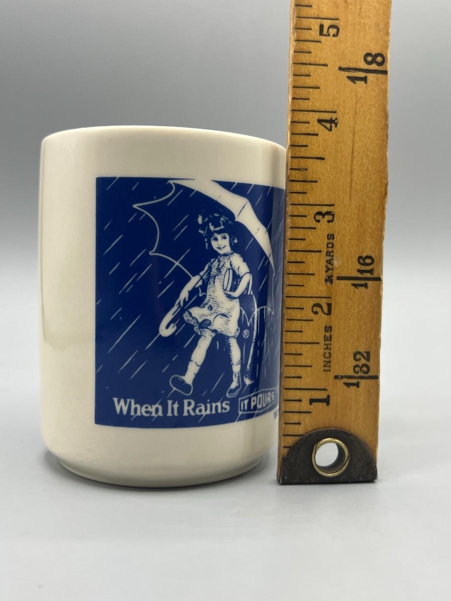 Retro Morton Salt When It Rains It Pours Coffee Mug, there are no signifncant cracks or chips to the mug and is in good useable condition Check pictures for more details and for sizing.