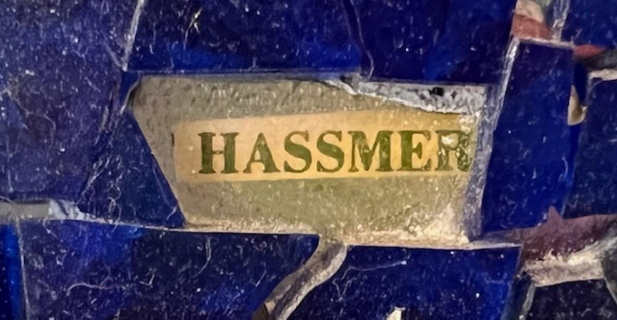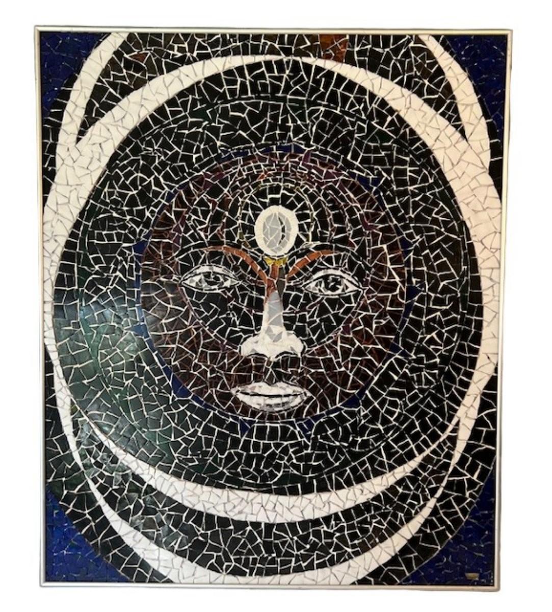 Depiction of a face surrounded by concentric circles of alternating tiles. No missing mosaic pieces. Measurement: 36" x 30".