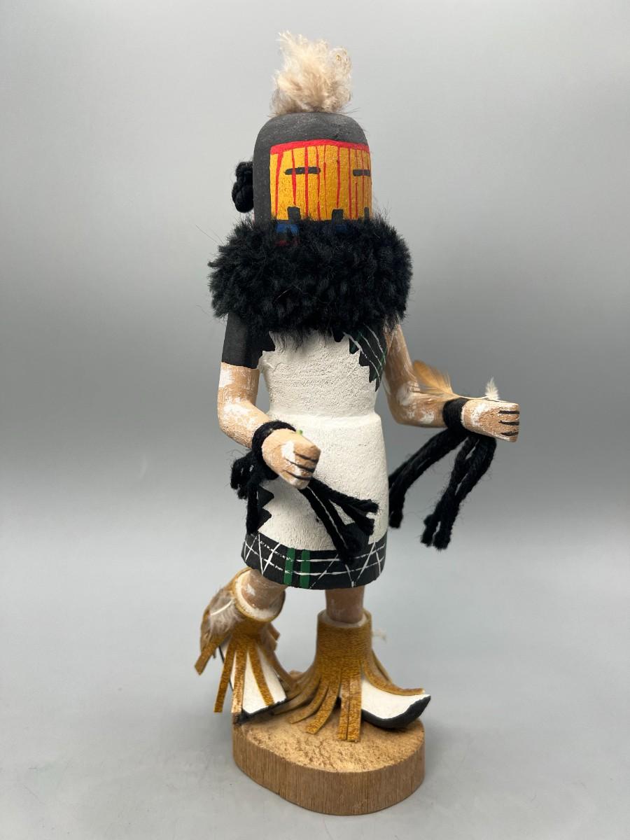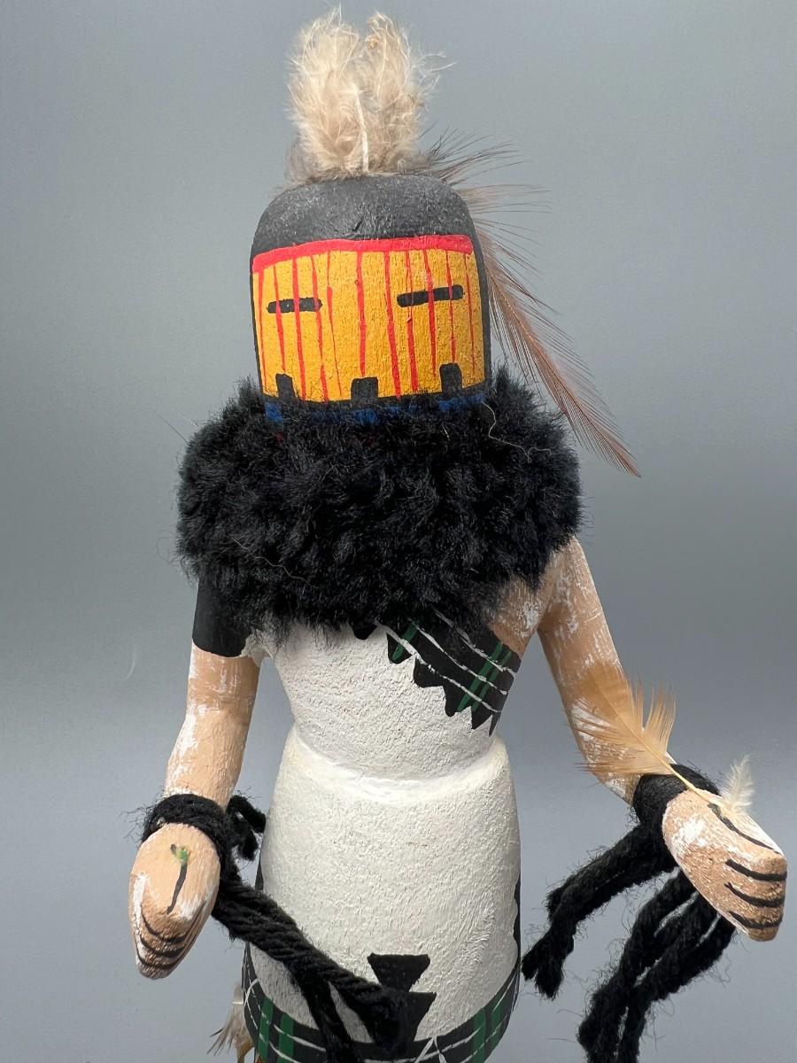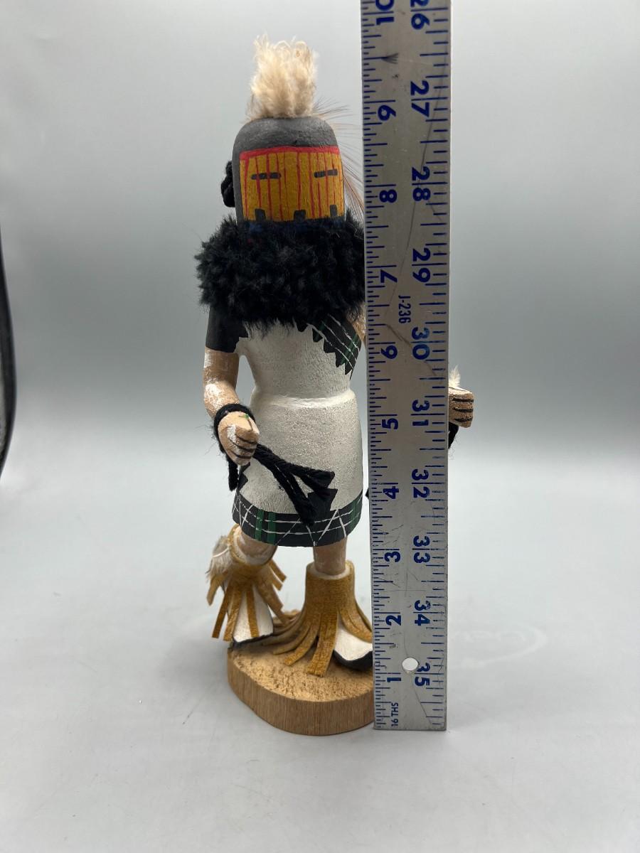 There is no significant damage to the kachina doll and is in overall good displayable or collectible condition. Check pictures for more details and for sizing.
