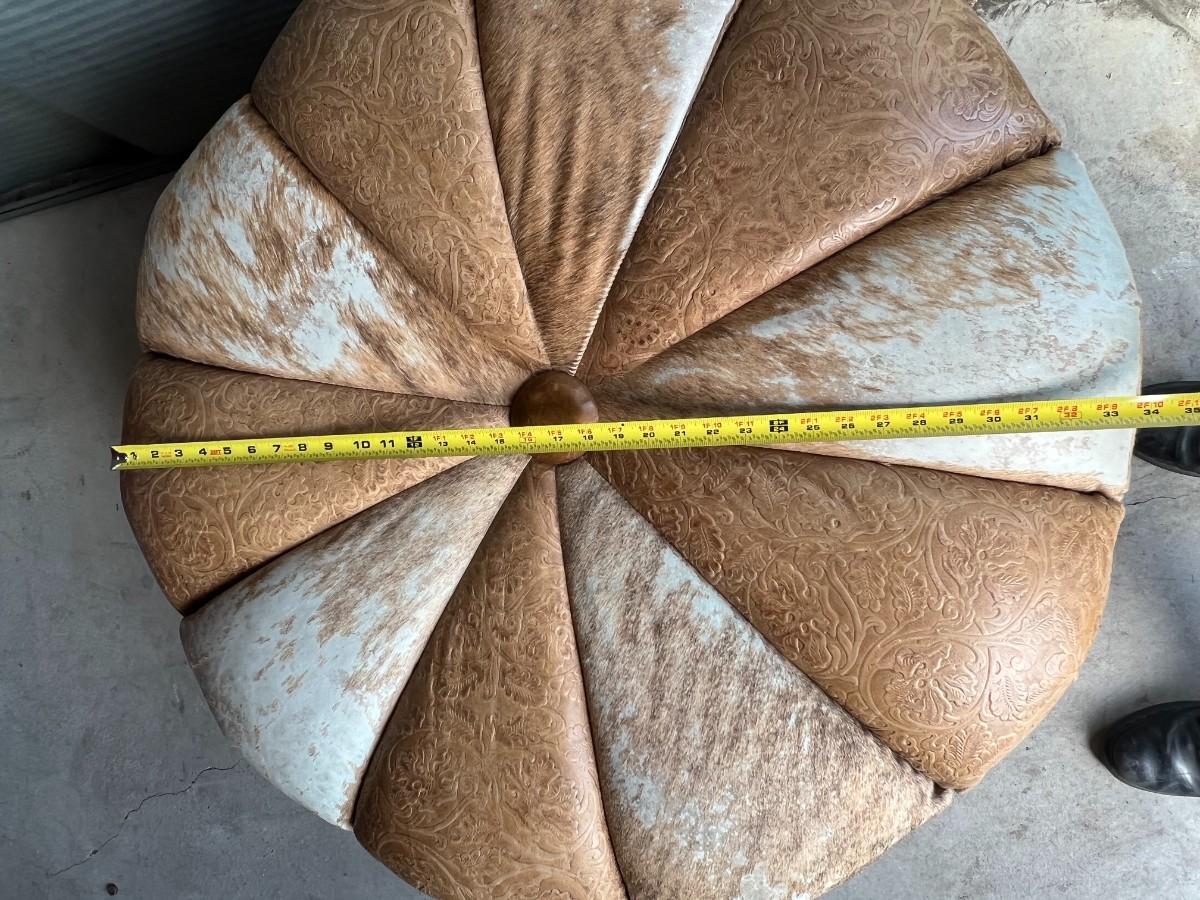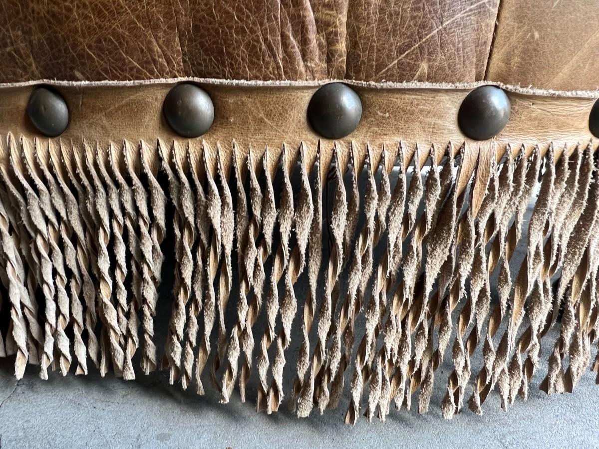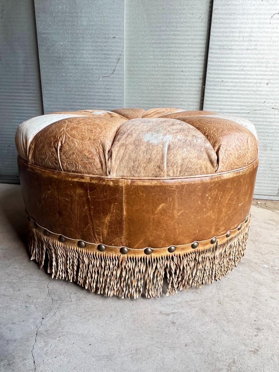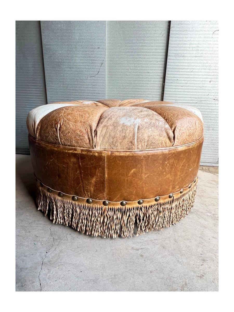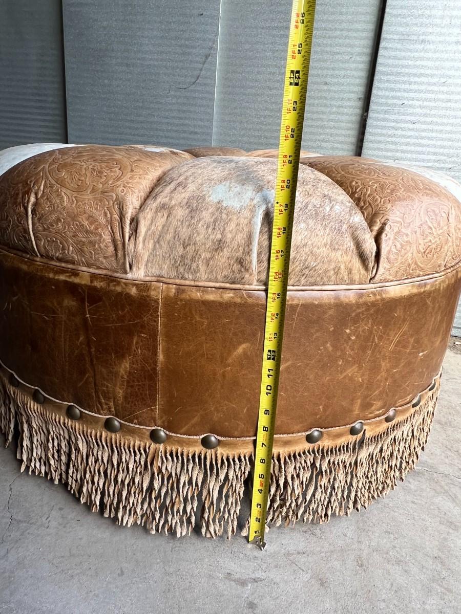 Retro Old Hickory Carolina Cowboy Saloon Round Fringed Leather Cowhide Ottoman