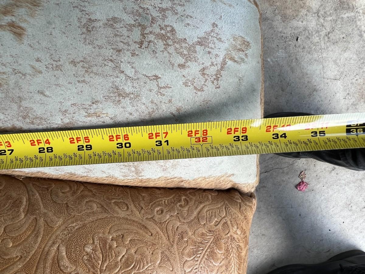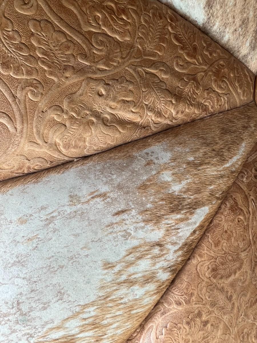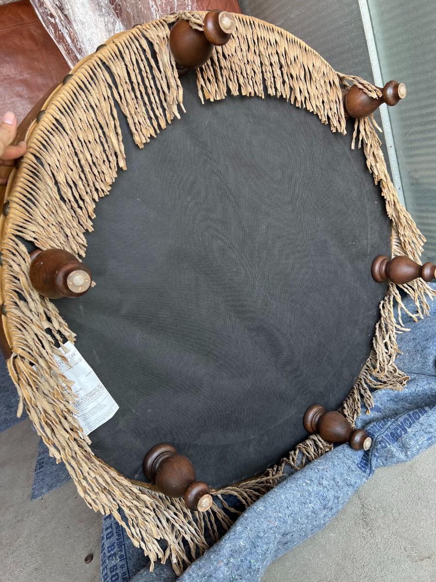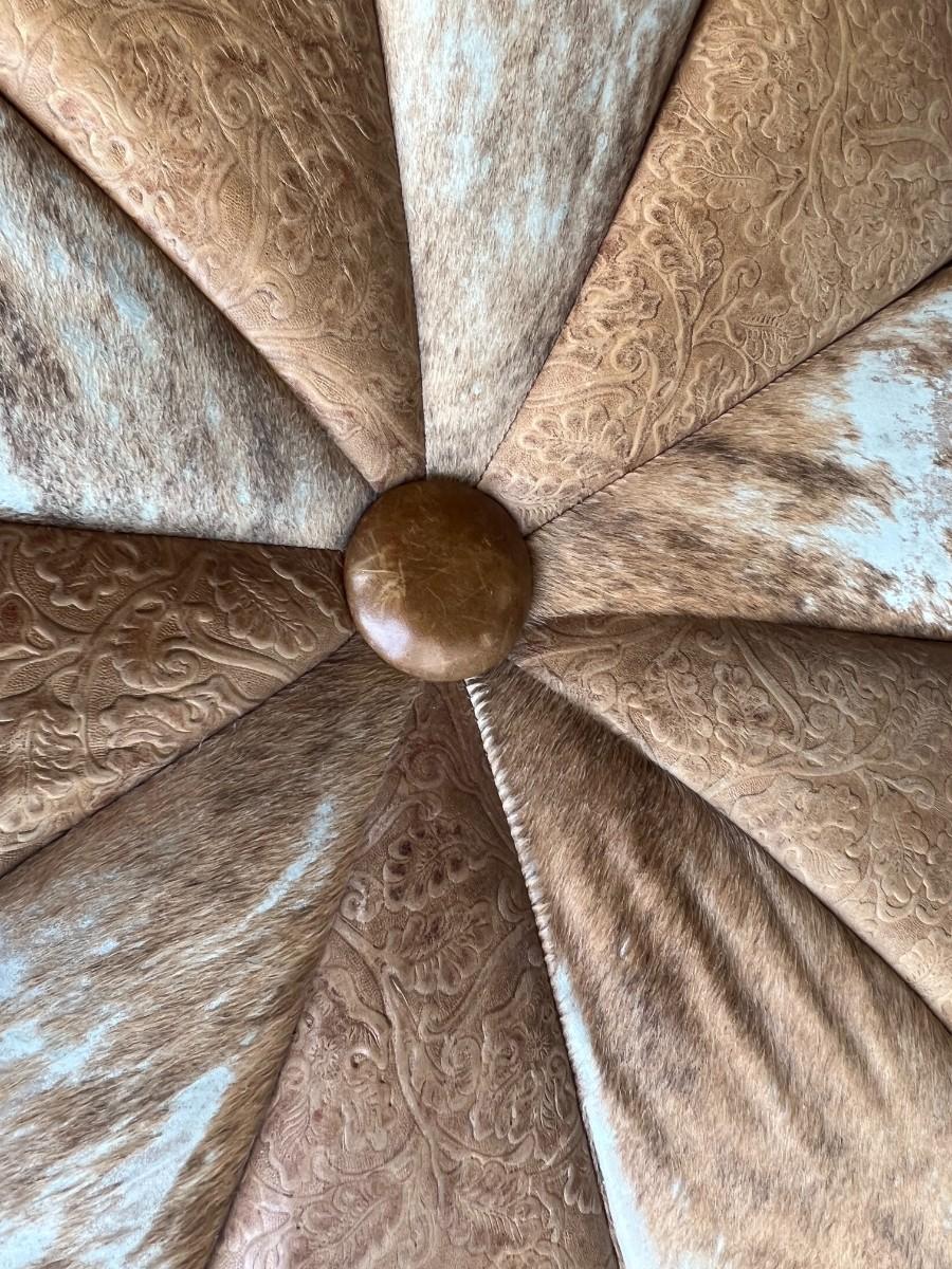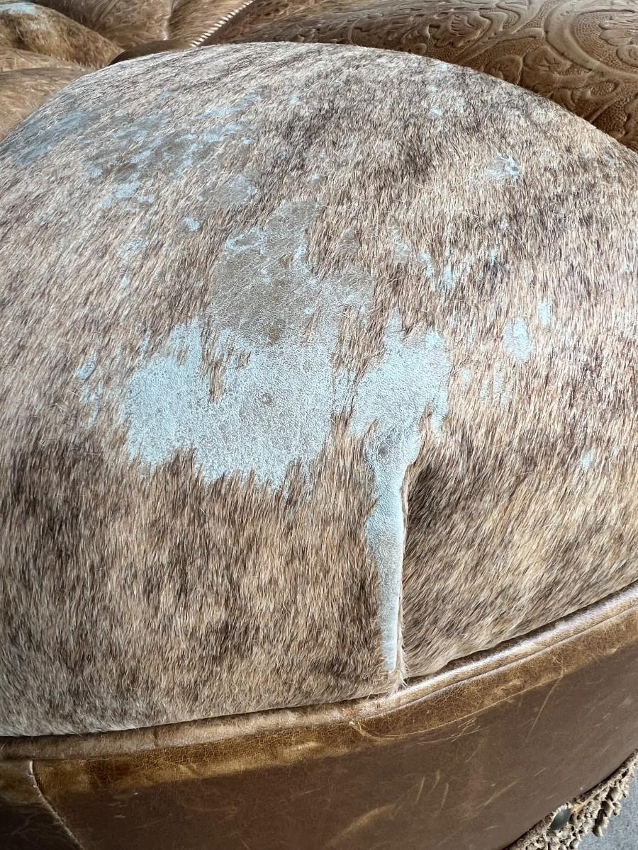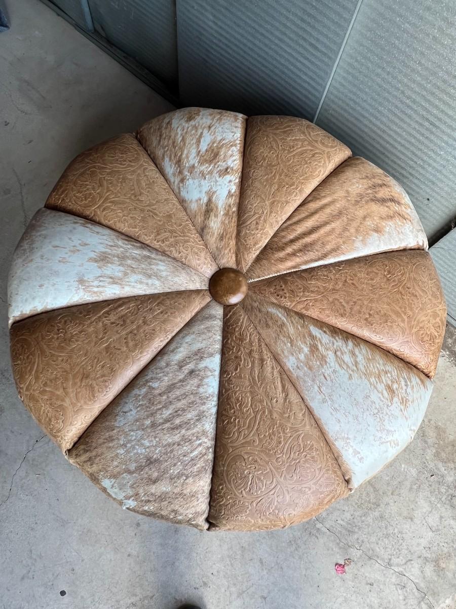 Retro Old Hickory Carolina Cowboy Saloon Round Fringed Leather Cowhide Ottoman