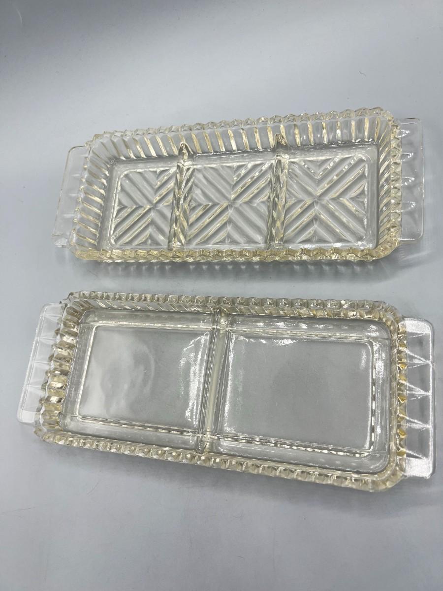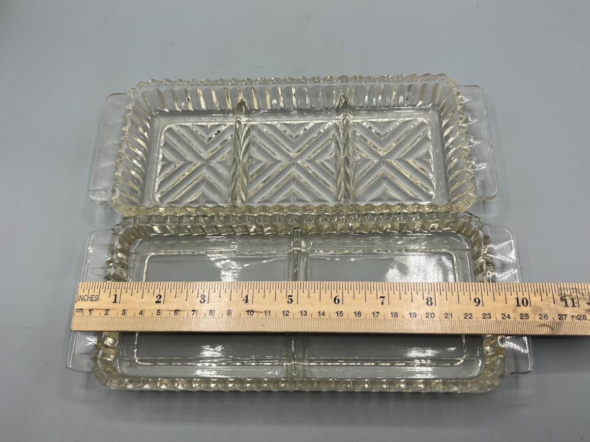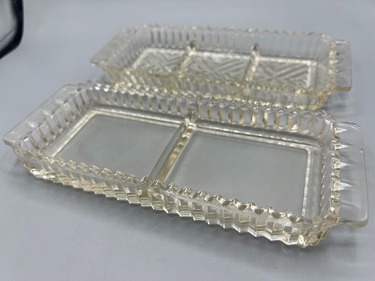 Retro Pair of Clear Glass & Textured Divided Relish Dishes