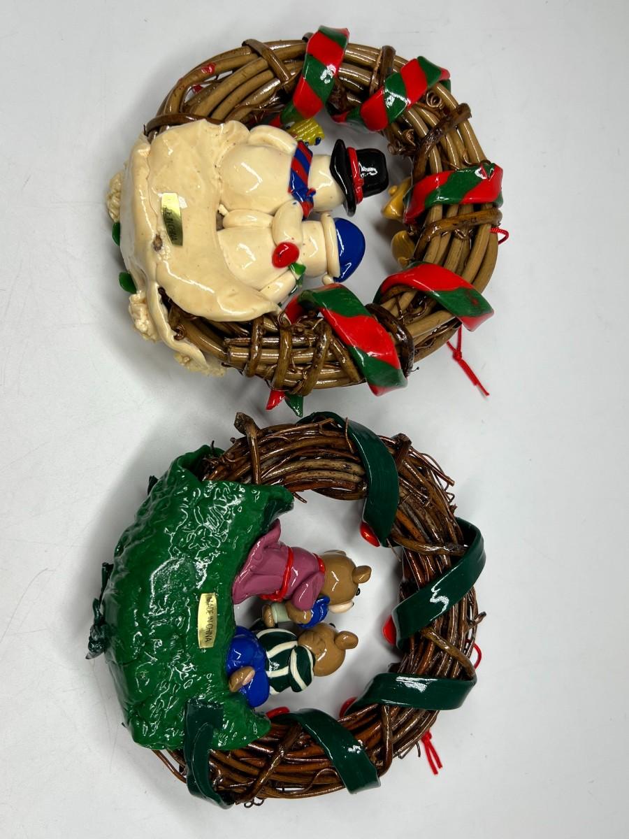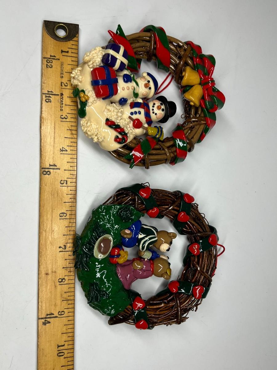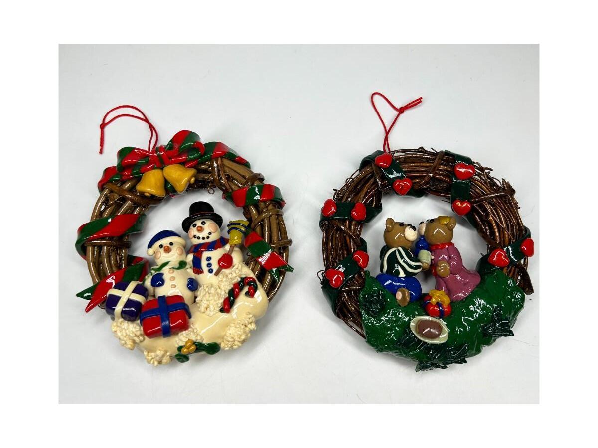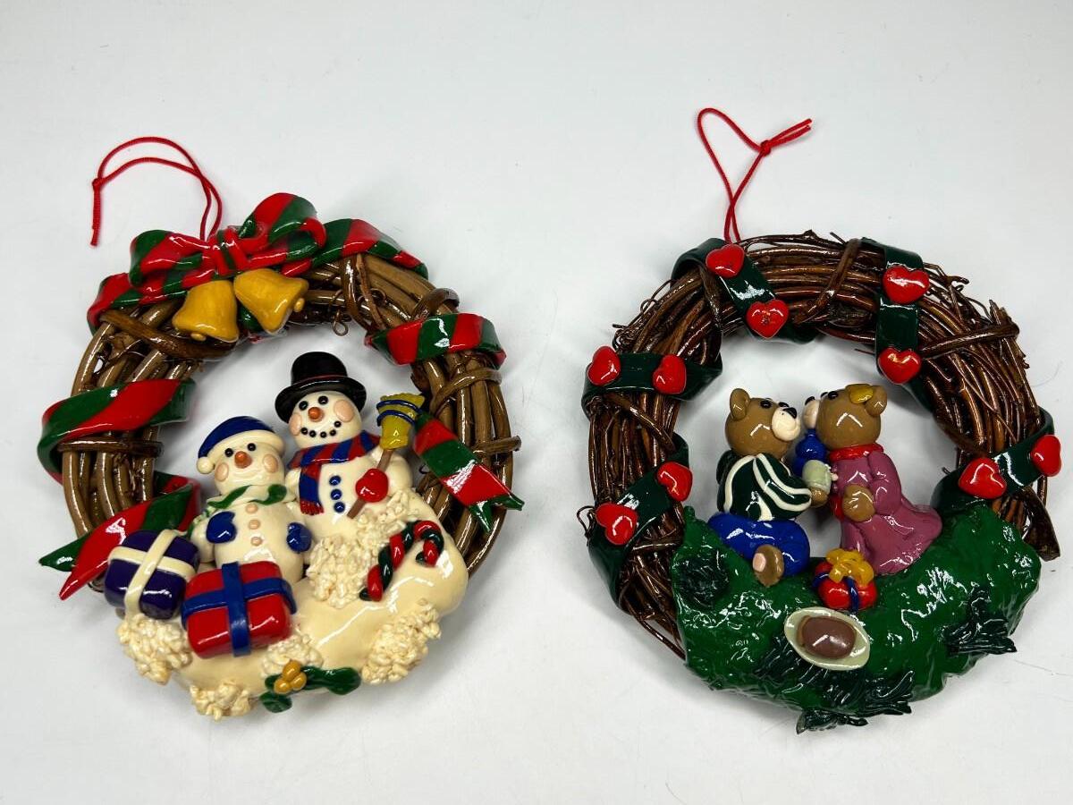Retro Pair of Glazed Soft Gummy Plastic Resin Snowmen & Bears Holiday Wreath Ornaments