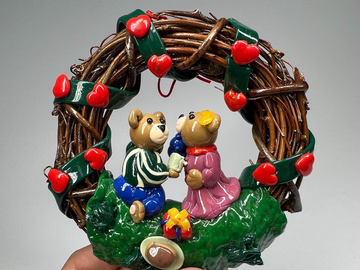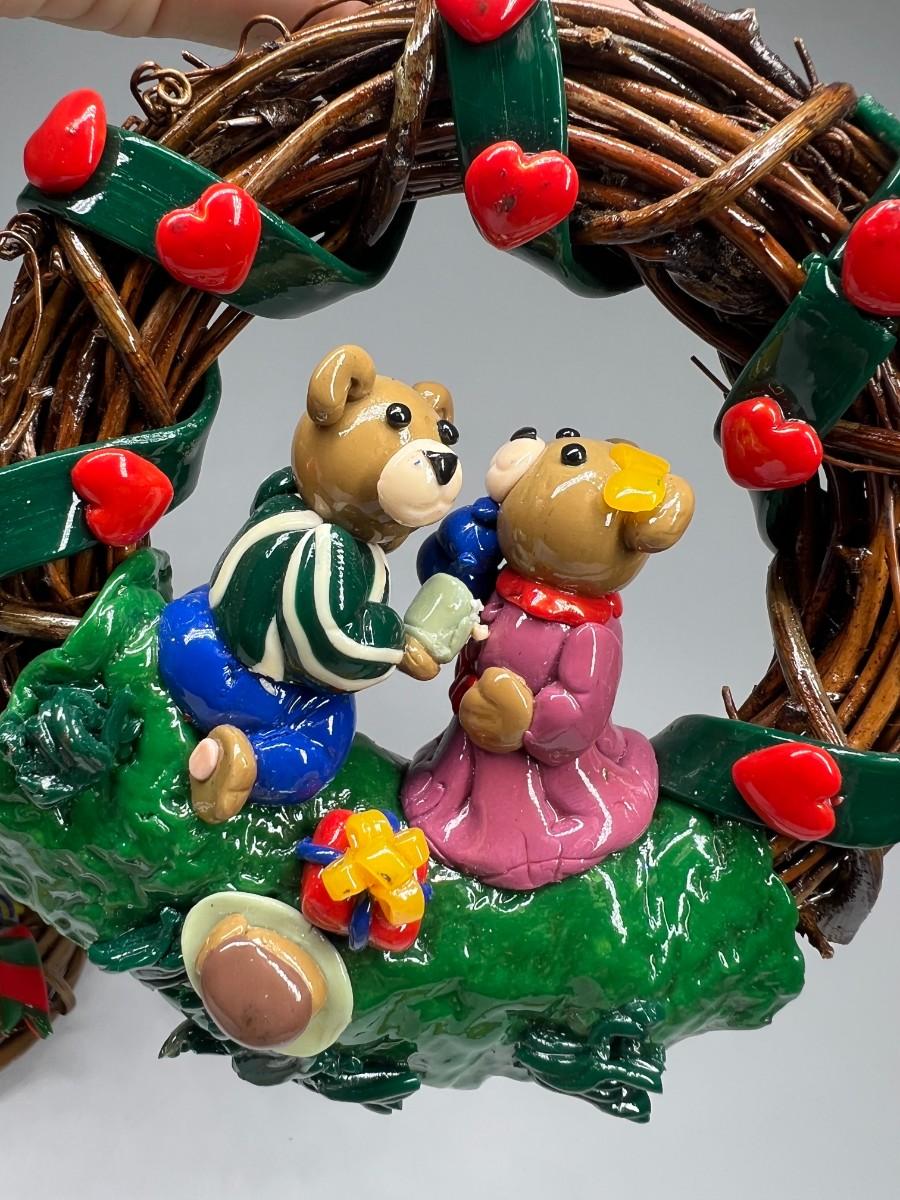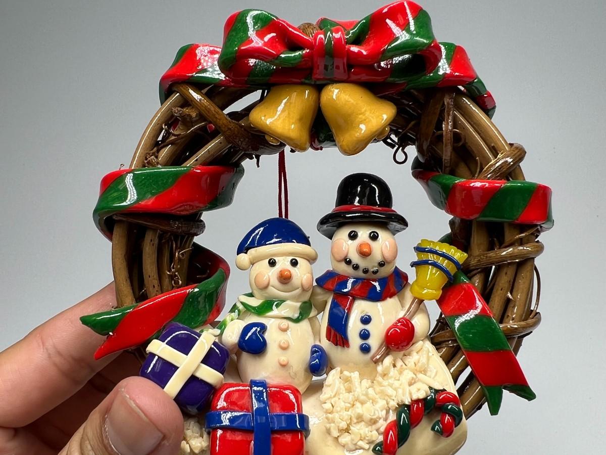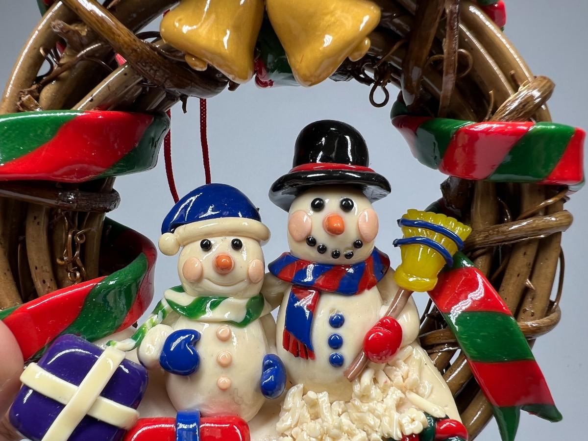 Retro Pair of Glazed Soft Gummy Plastic Resin Snowmen & Bears Holiday Wreath Ornaments