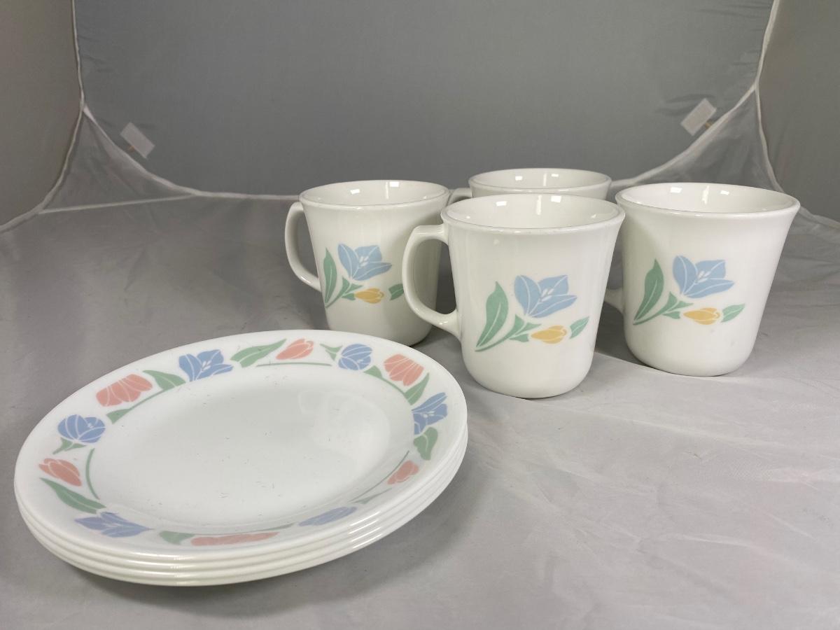 Corelle pastel floral coffee cups and small plates. 4 each (8 total pieces). Good condition.