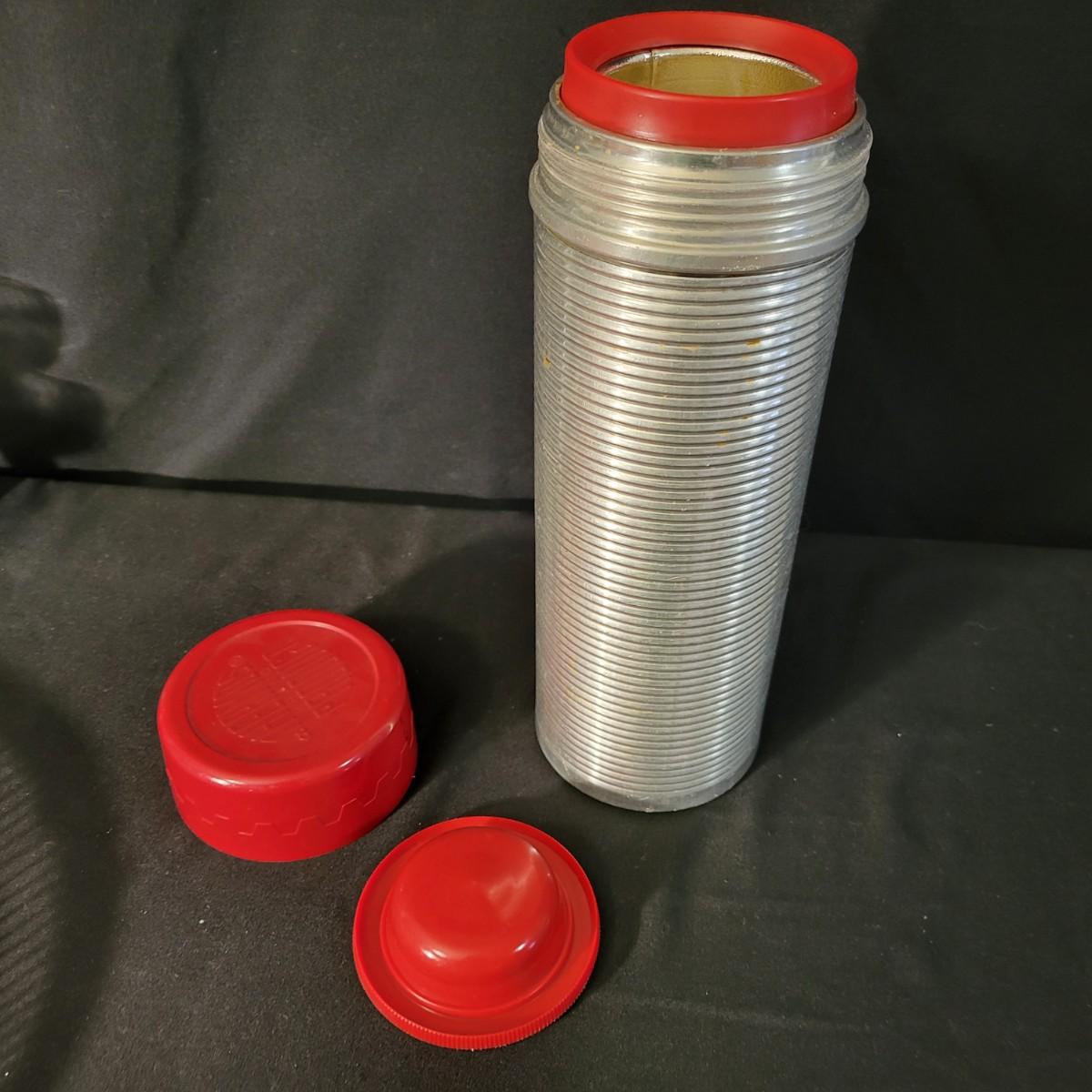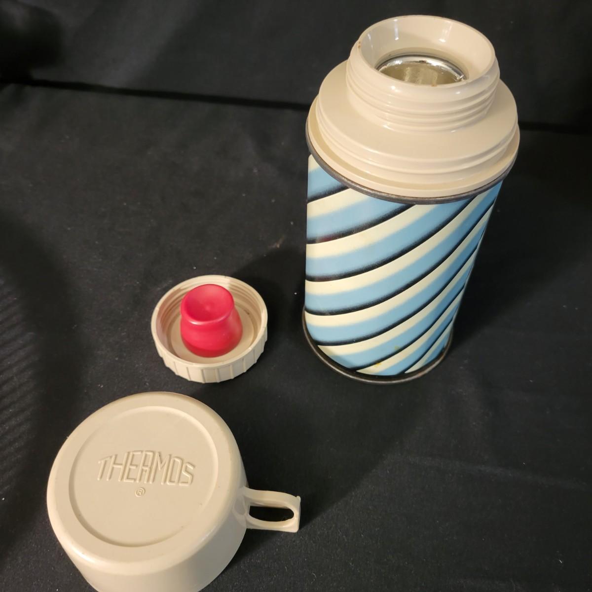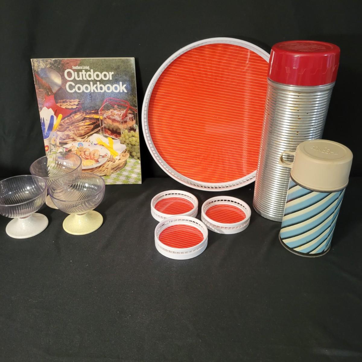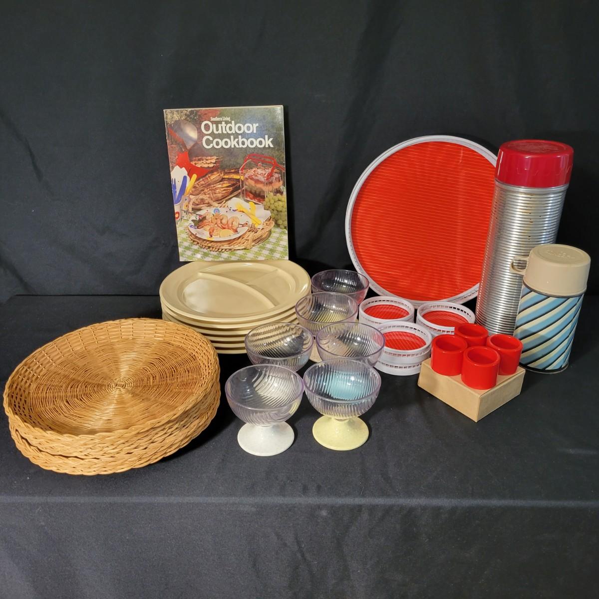 A variety of retro picnic or outdoor patio accessories in good condition. Included is a matching tray and coaster set with bamboo frames, six wicker plate holders, six Waterville Lifetime Ware plates, six desert cups, napkin rings, an outdoor cookbook and two thermos with glass interiors. Red topped thermos measures approximately 4" x 11" Shipping available