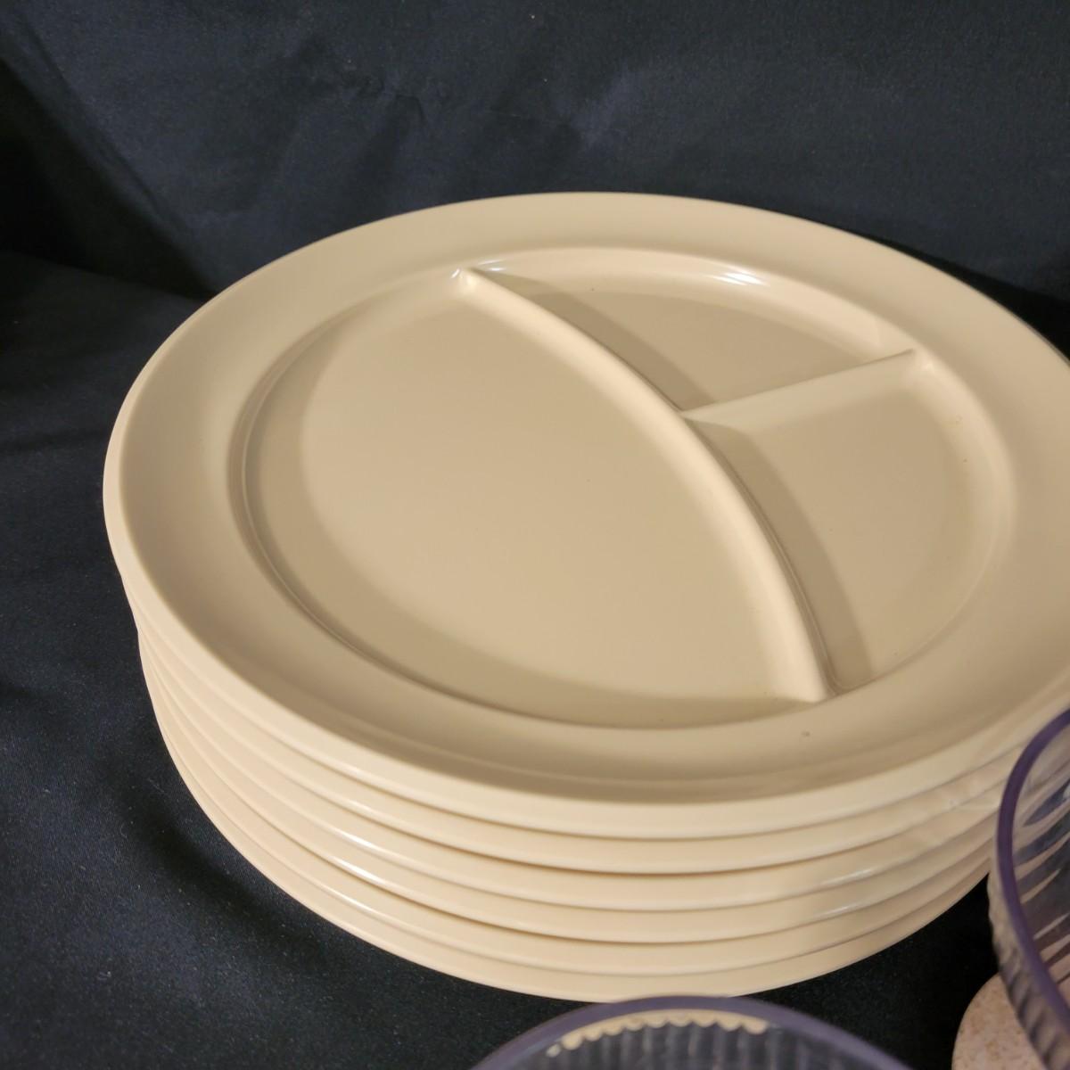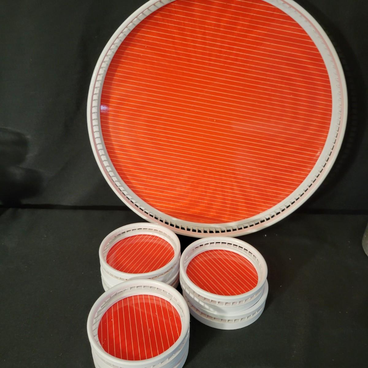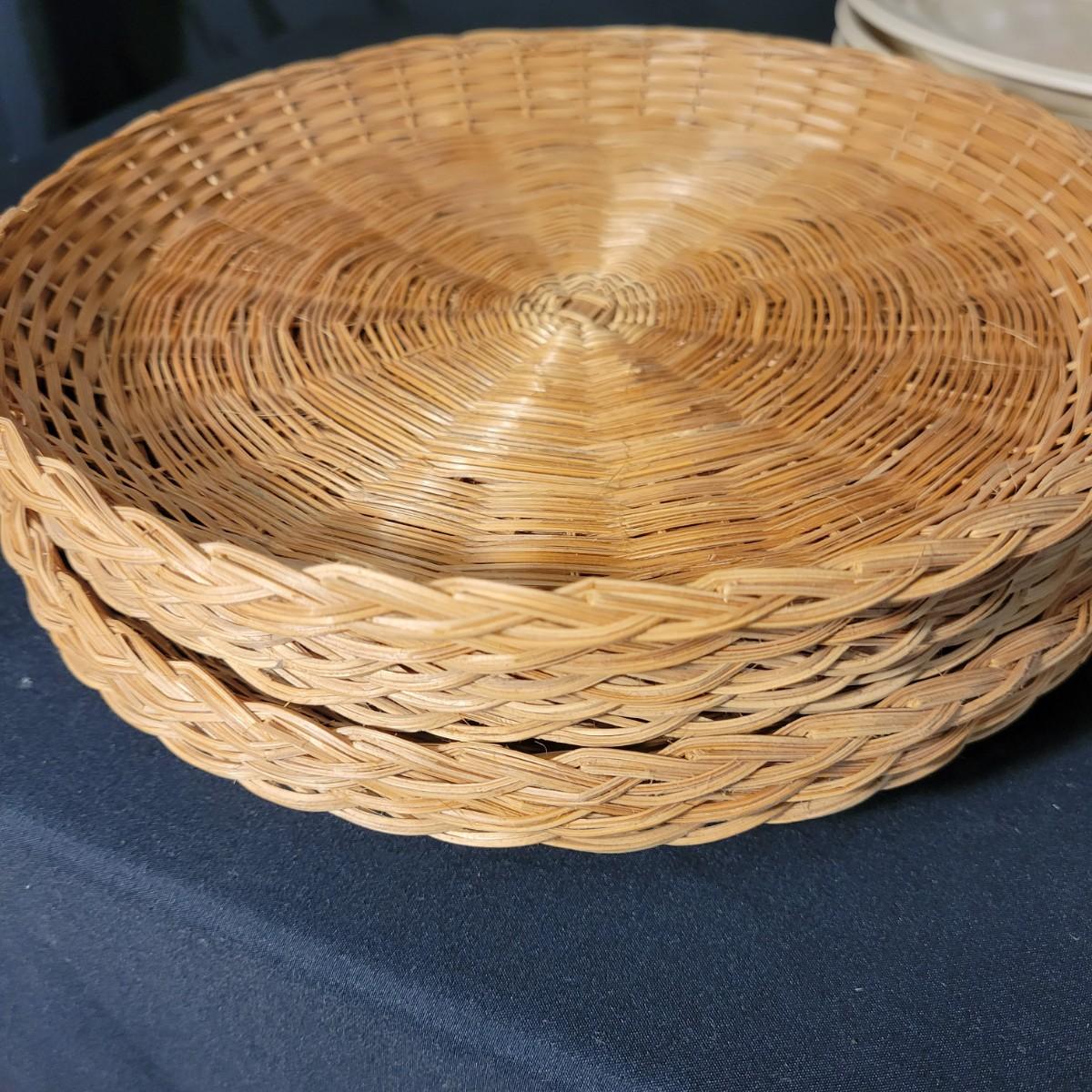 A variety of retro picnic or outdoor patio accessories in good condition. Included is a matching tray and coaster set with bamboo frames, six wicker plate holders, six Waterville Lifetime Ware plates, six desert cups, napkin rings, an outdoor cookbook and two thermos with glass interiors. Red topped thermos measures approximately 4" x 11" Shipping available