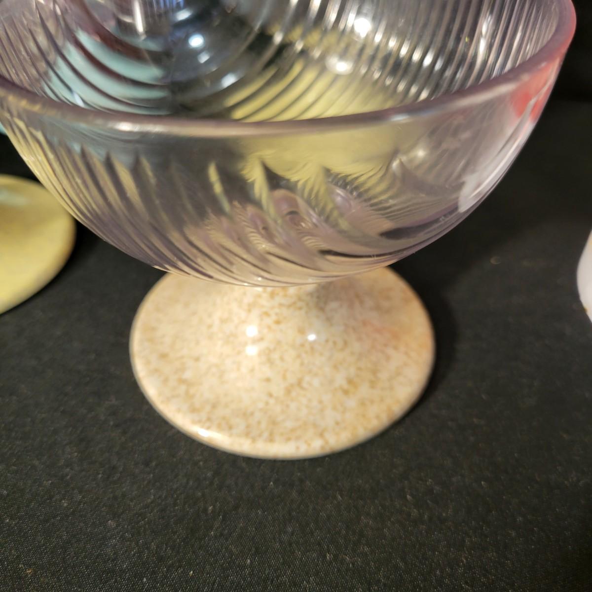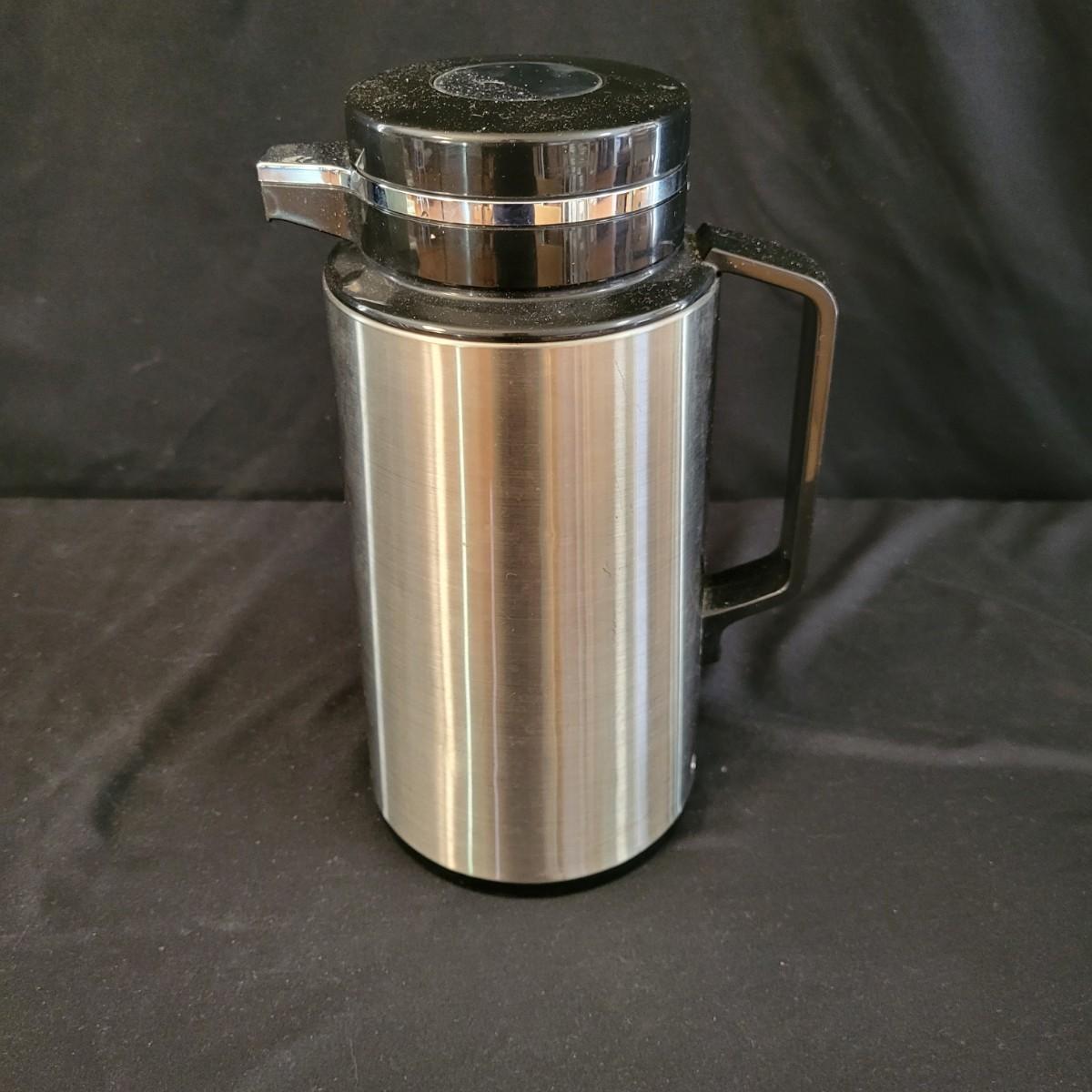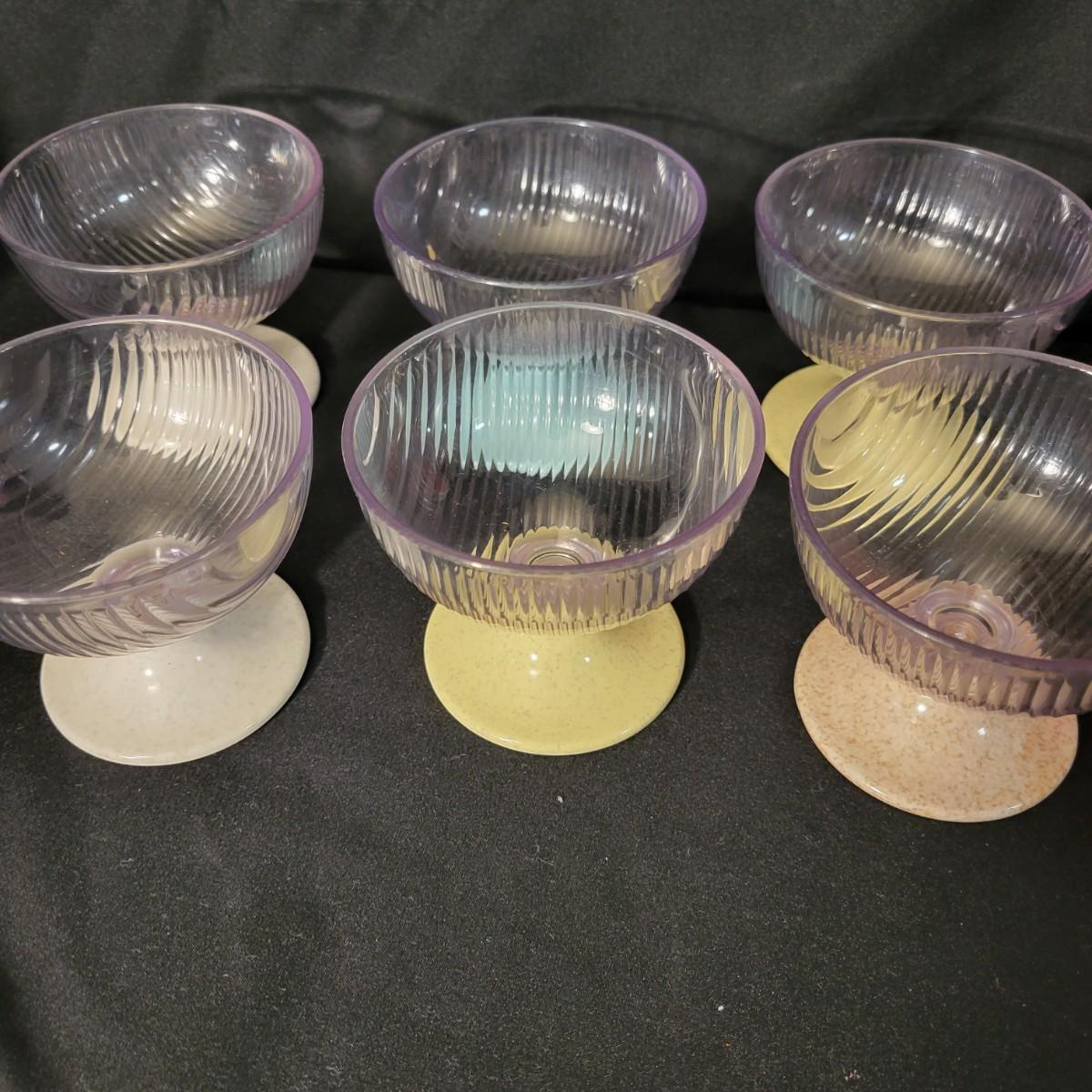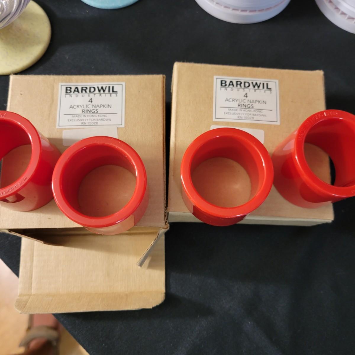 A variety of retro picnic or outdoor patio accessories in good condition. Included is a matching tray and coaster set with bamboo frames, six wicker plate holders, six Waterville Lifetime Ware plates, six desert cups, napkin rings, an outdoor cookbook and two thermos with glass interiors. Red topped thermos measures approximately 4" x 11" Shipping available