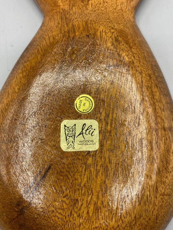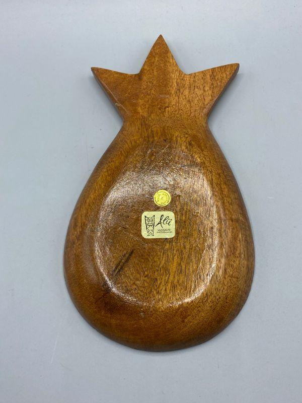 Great retro monkey pod wood dish. Pineapple shape divided bowl, great for dips & garnishes or coins & trinkets. About 10.5" size. Light signs of age, no major gouges or scratches. Has original stickers on the bottom.