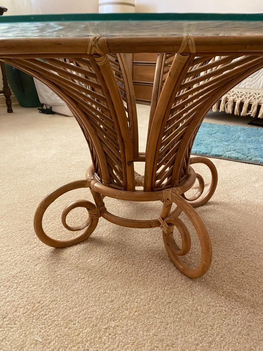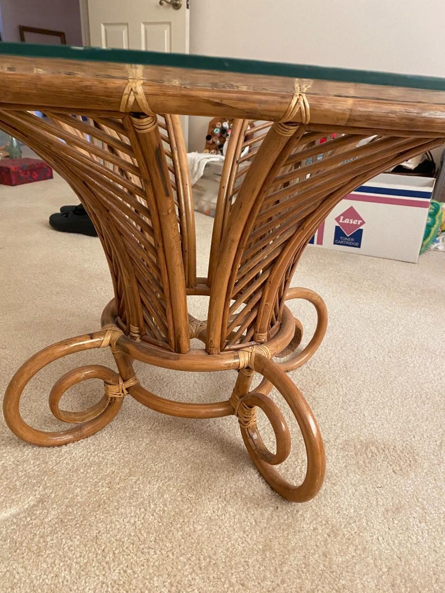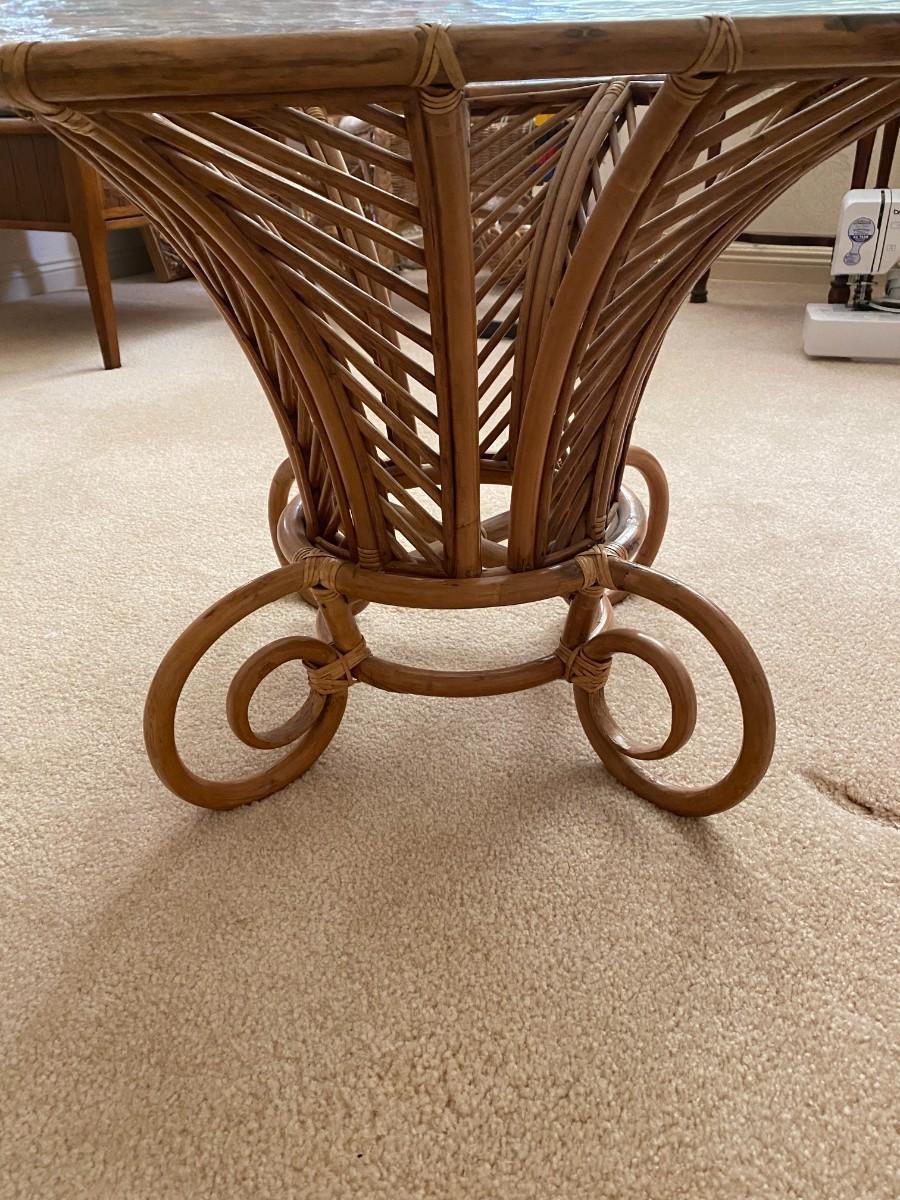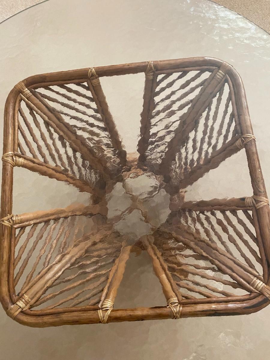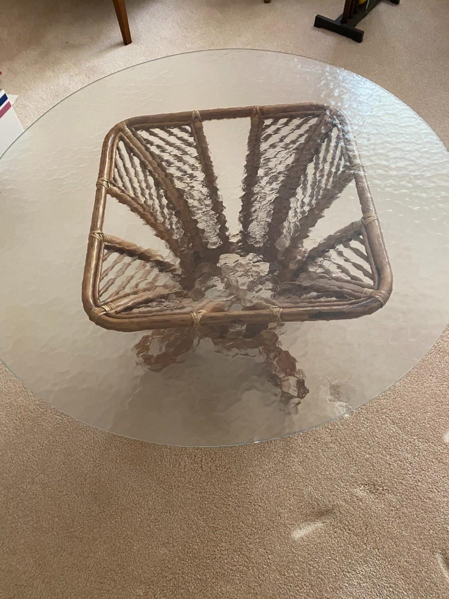 Retro rattan coffee table with round tempered glass top. Excellent cond. vintage. Approx. 35" diameter.