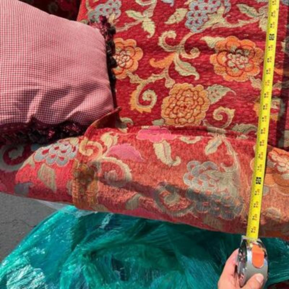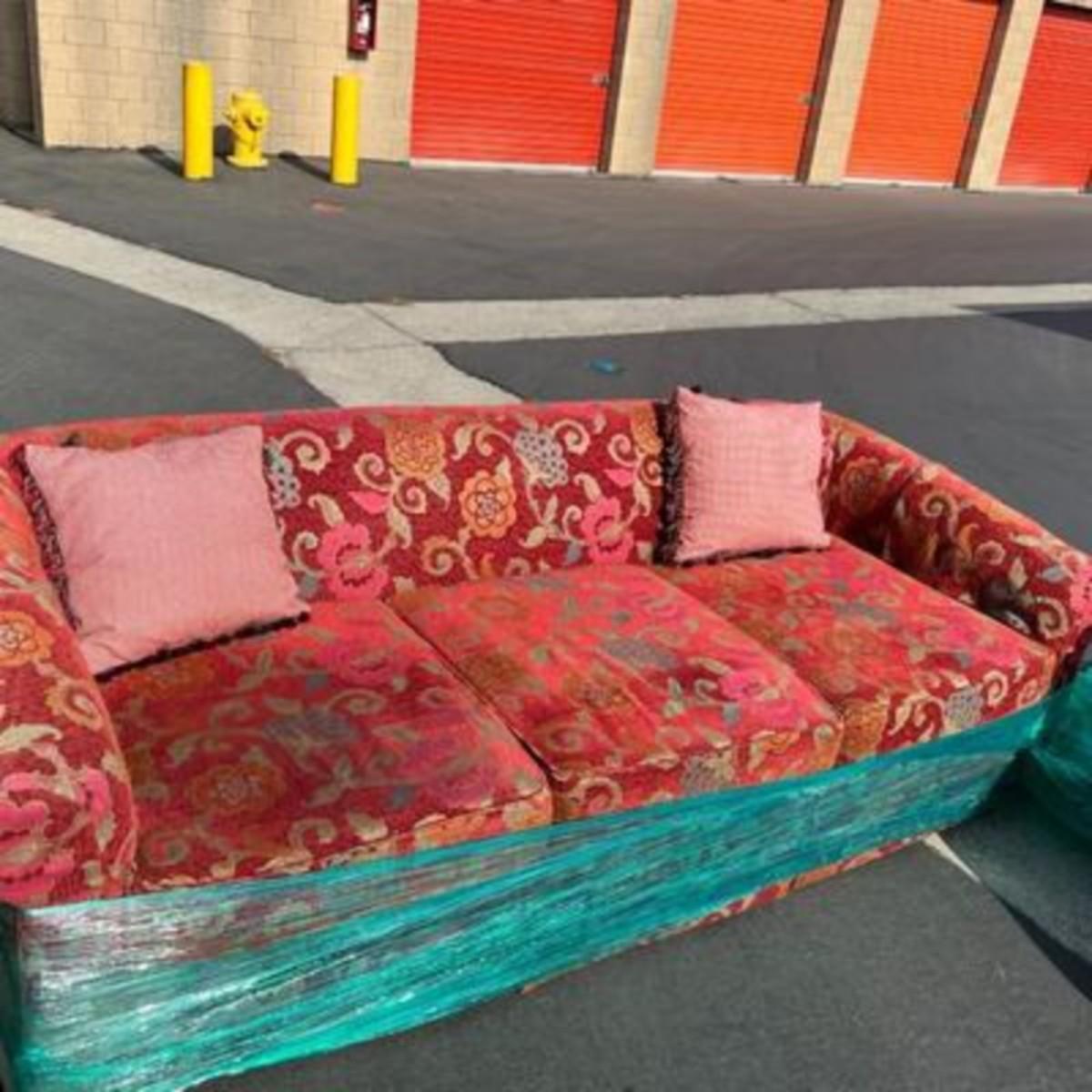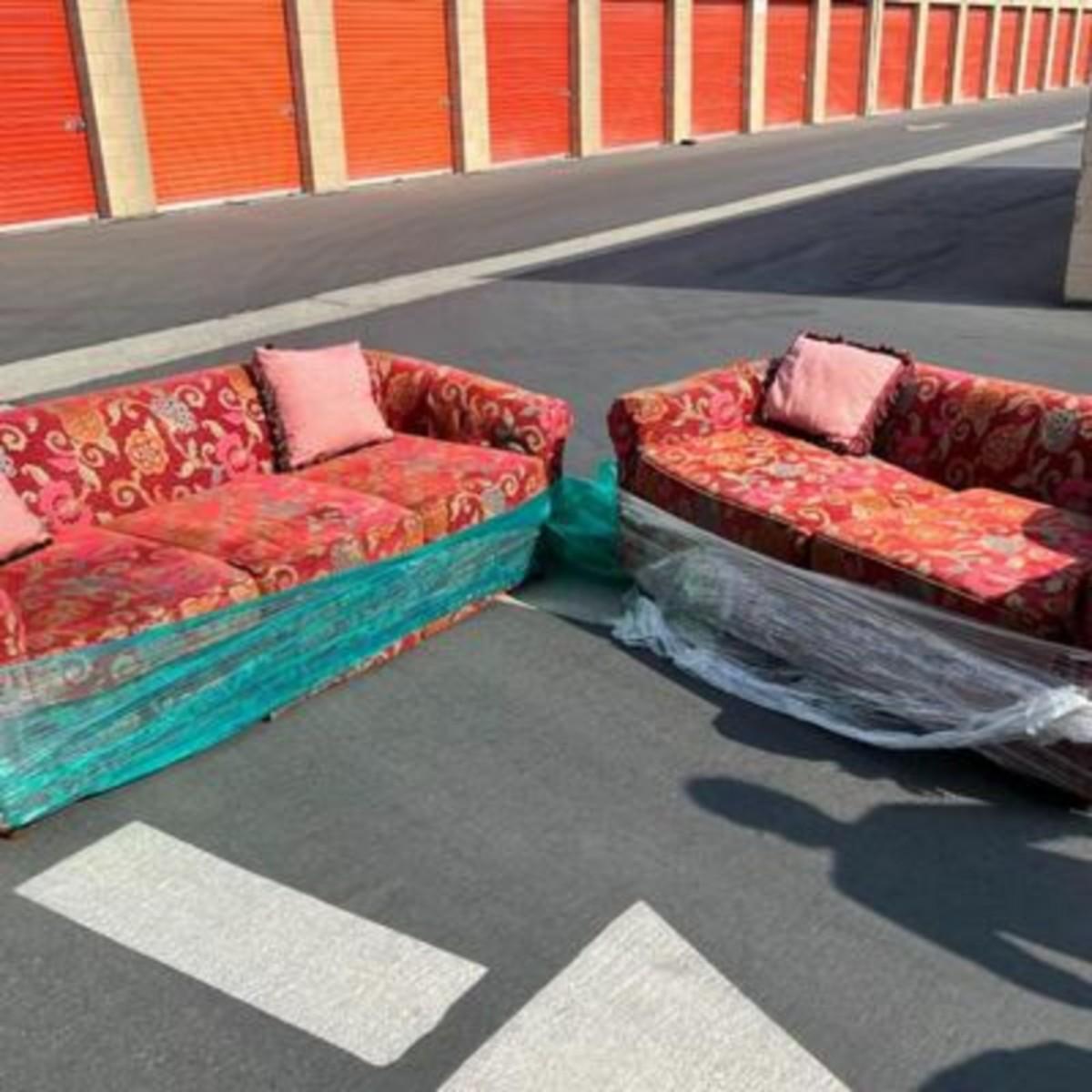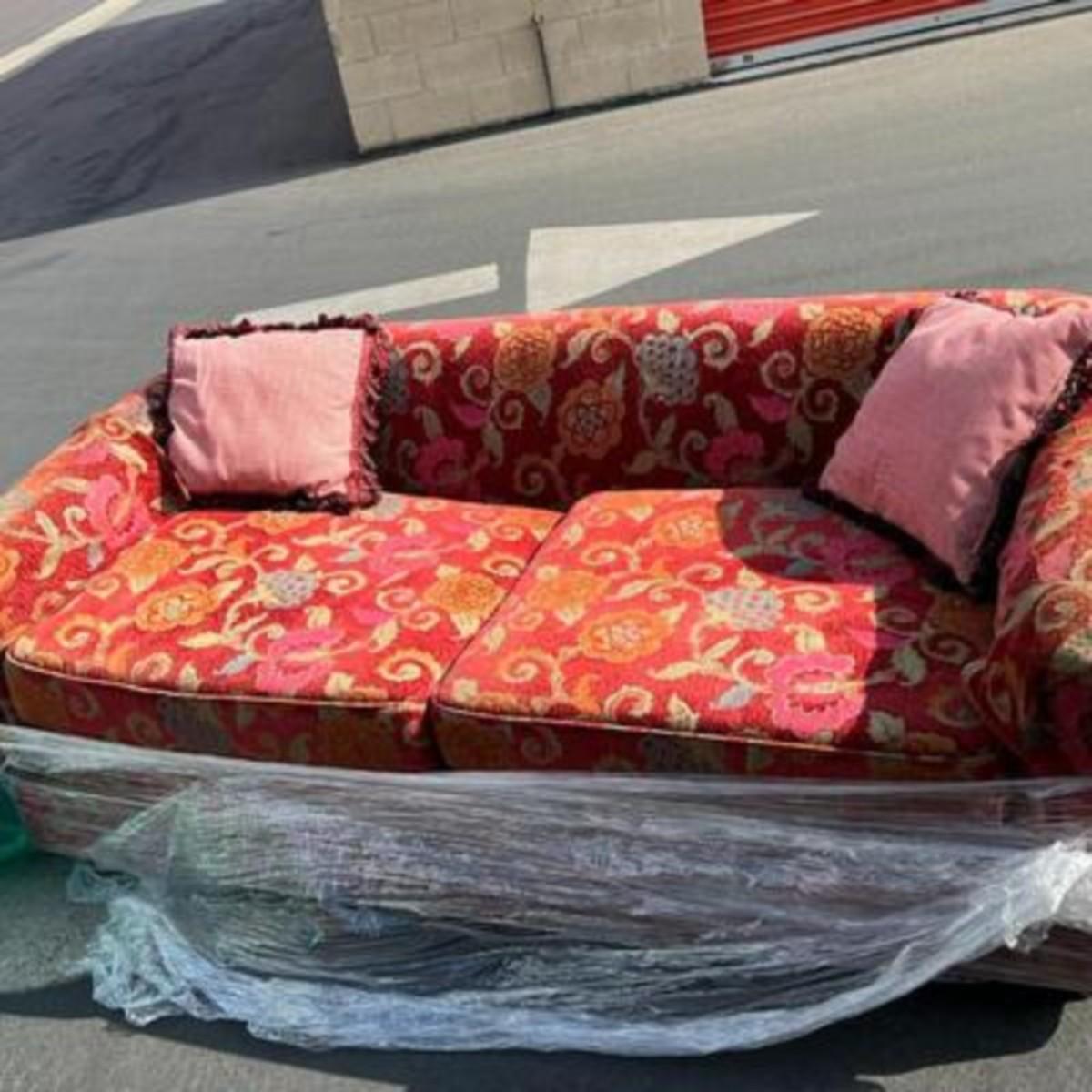 Retro Red and Gold Floral Pattern Couch & Loveseat Set There is some light wear to the sofas, but there is no significant rips or tears and is in overall good useable and displayable condition. One sofa is slightly longer than the other, check pictures for more details and for sizing. PICK UP BY 8/27 OR ITEM WILL BE FORFEITED WITHOUT REFUND. LOCATED ABOUT 1 MILE FROM OUR OFFICE LOCATION.