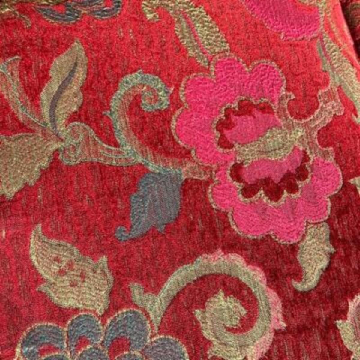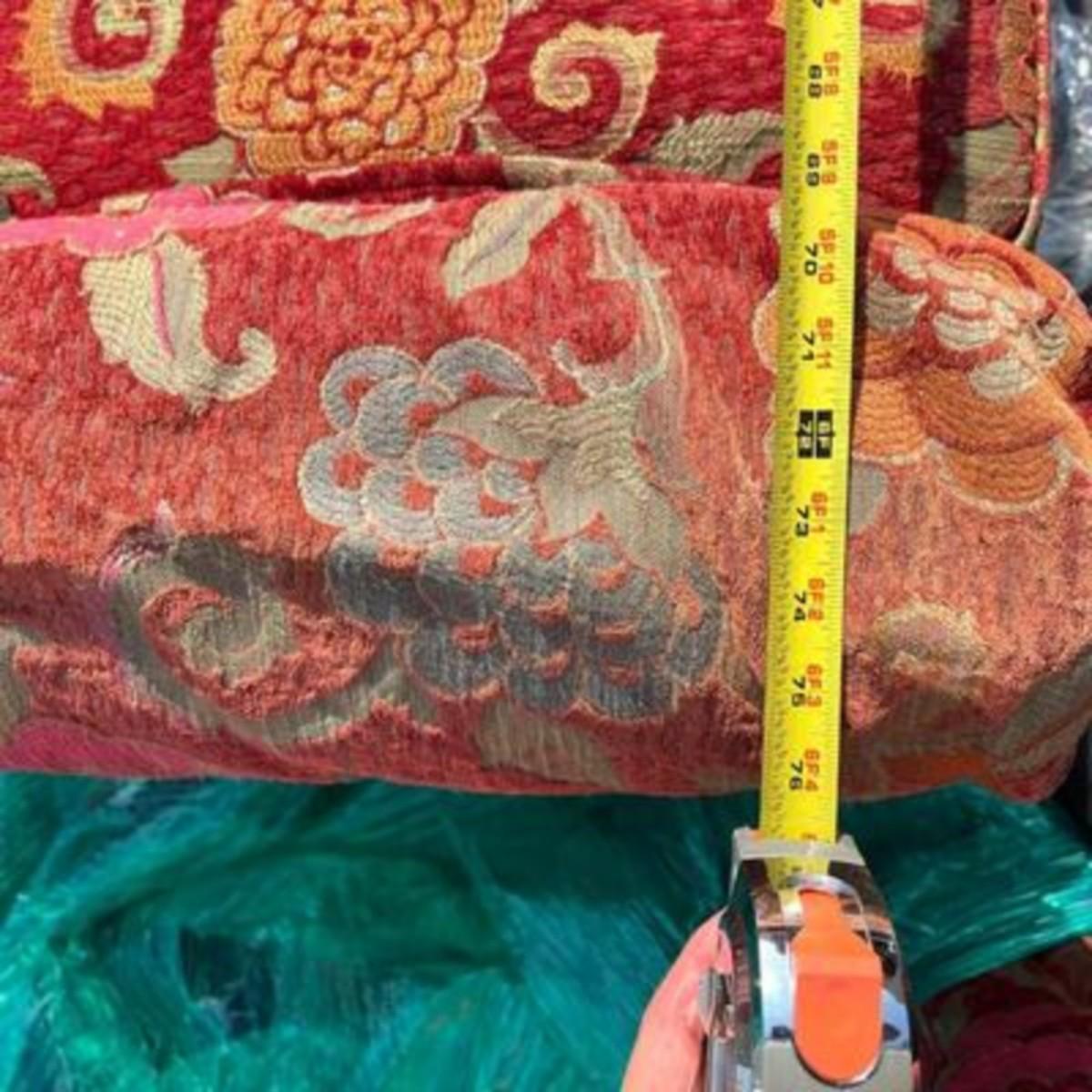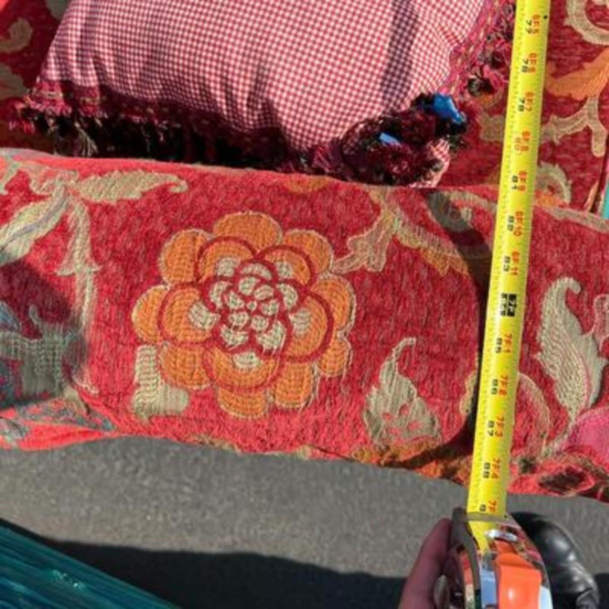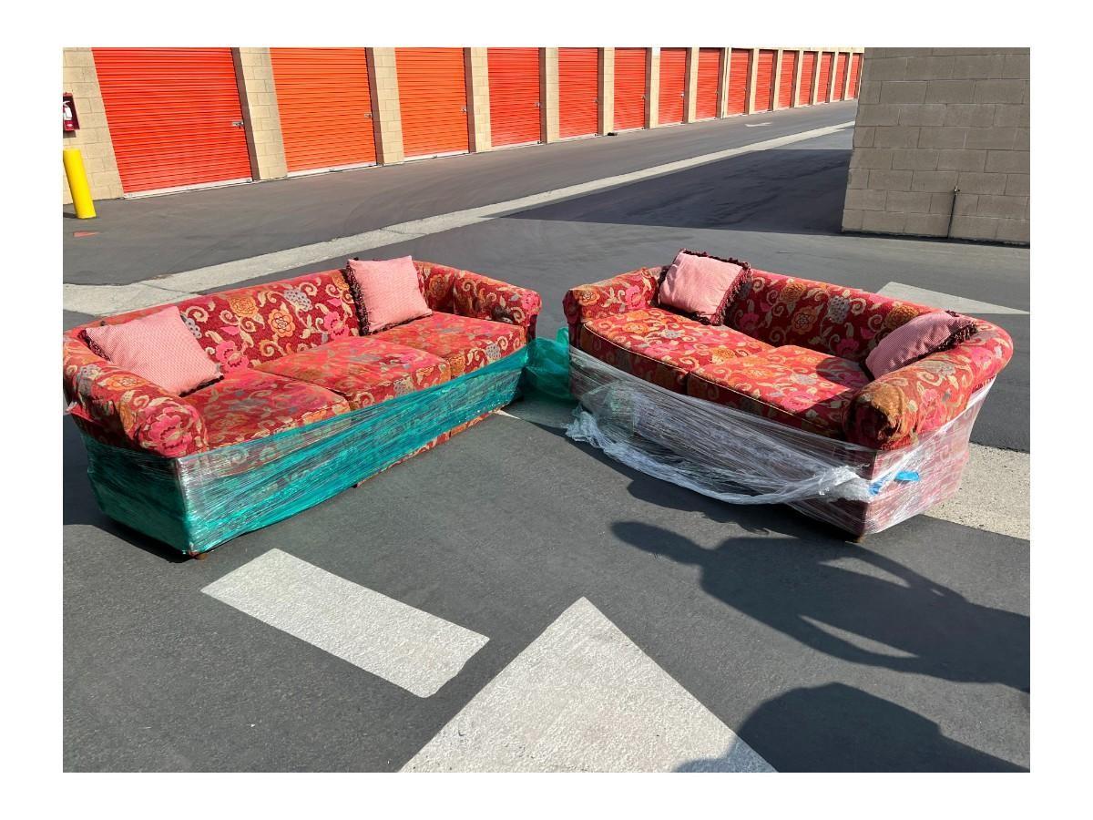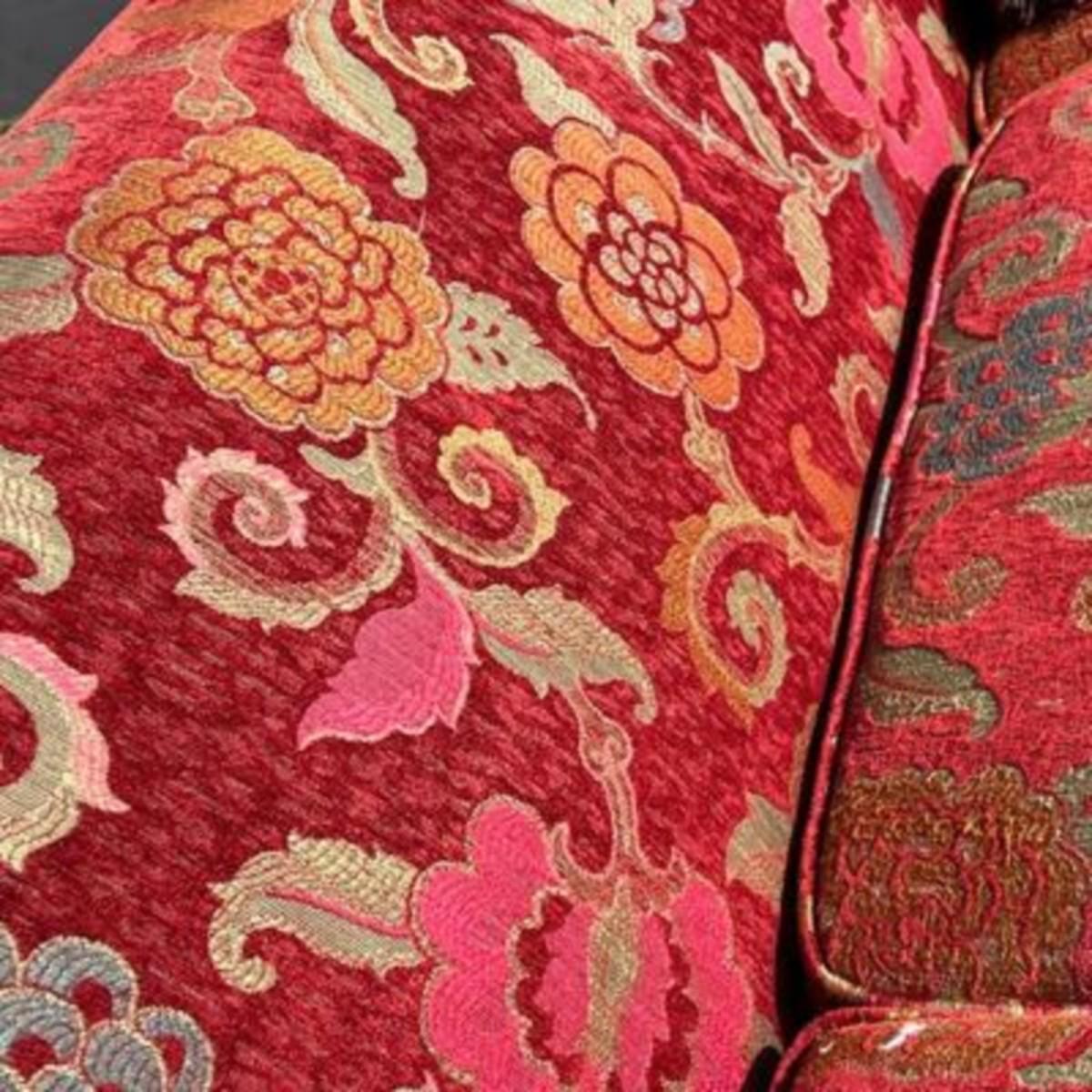 Retro Red and Gold Floral Pattern Couch & Loveseat Set There is some light wear to the sofas, but there is no significant rips or tears and is in overall good useable and displayable condition. One sofa is slightly longer than the other, check pictures for more details and for sizing. PICK UP BY 8/27 OR ITEM WILL BE FORFEITED WITHOUT REFUND. LOCATED ABOUT 1 MILE FROM OUR OFFICE LOCATION.