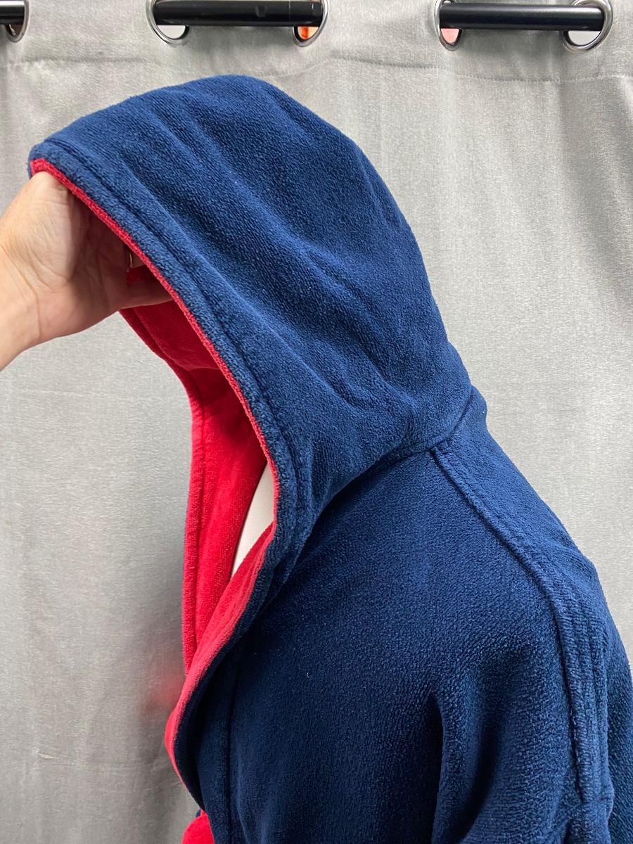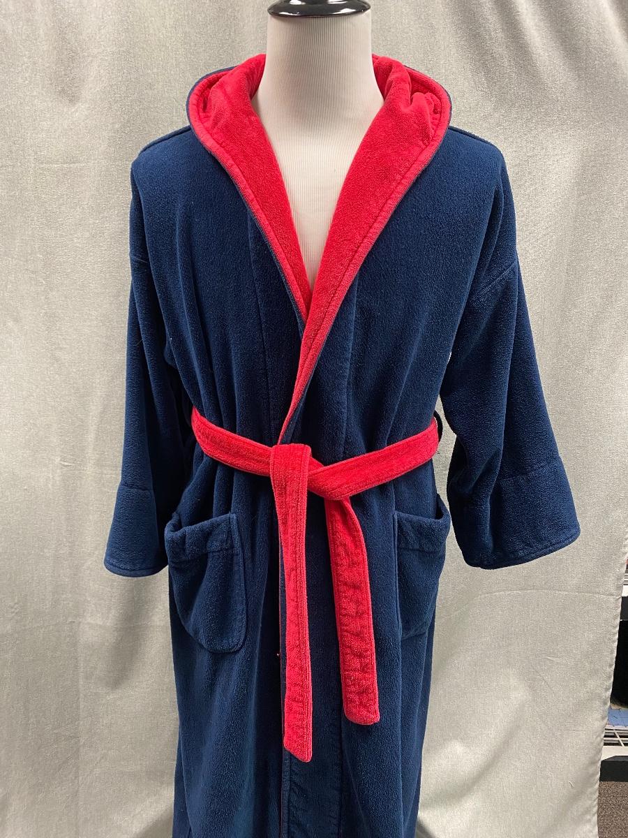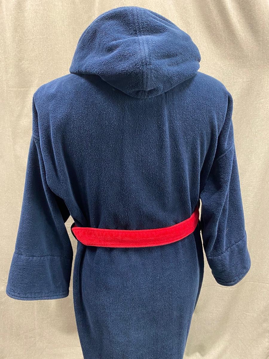 Retro Red & Blue Heavy Weight Terry Cloth Bath Robe with Hood. Front pockets and belt. Good used condition. No size tag, probably a men's medium.