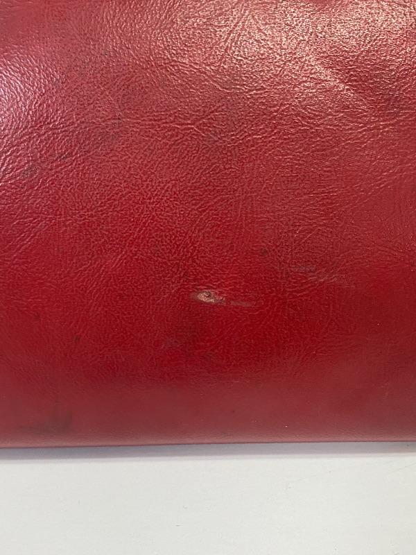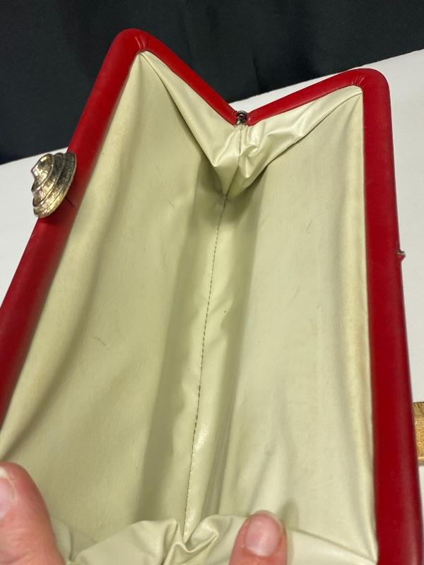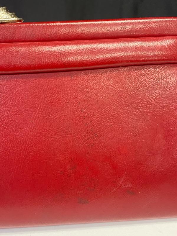 Retro 1980s red faux leather clutch. Has signs of use, scuffs on outside. No inside pockets. About 14" length.