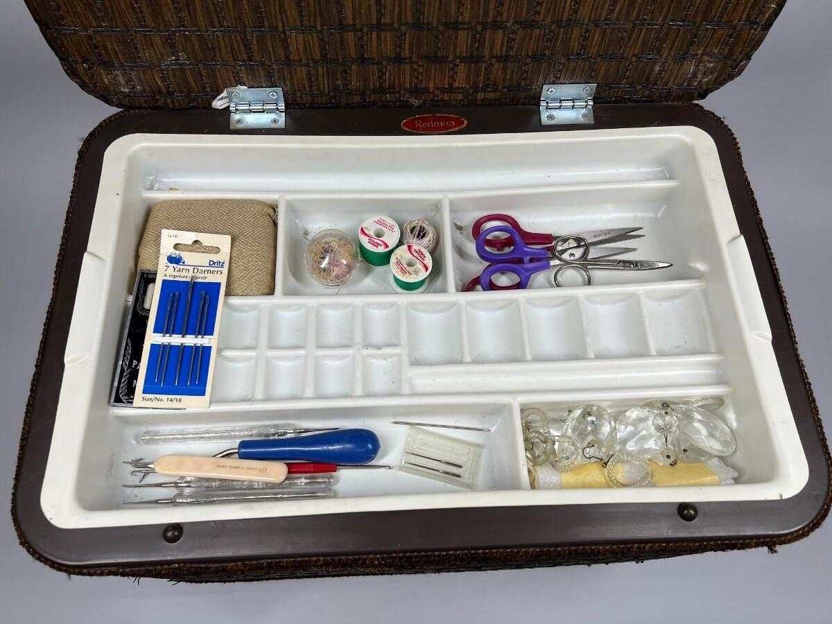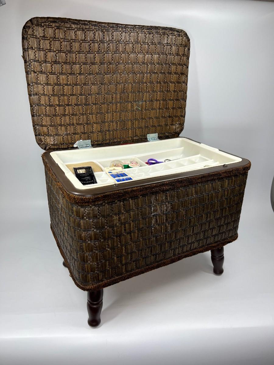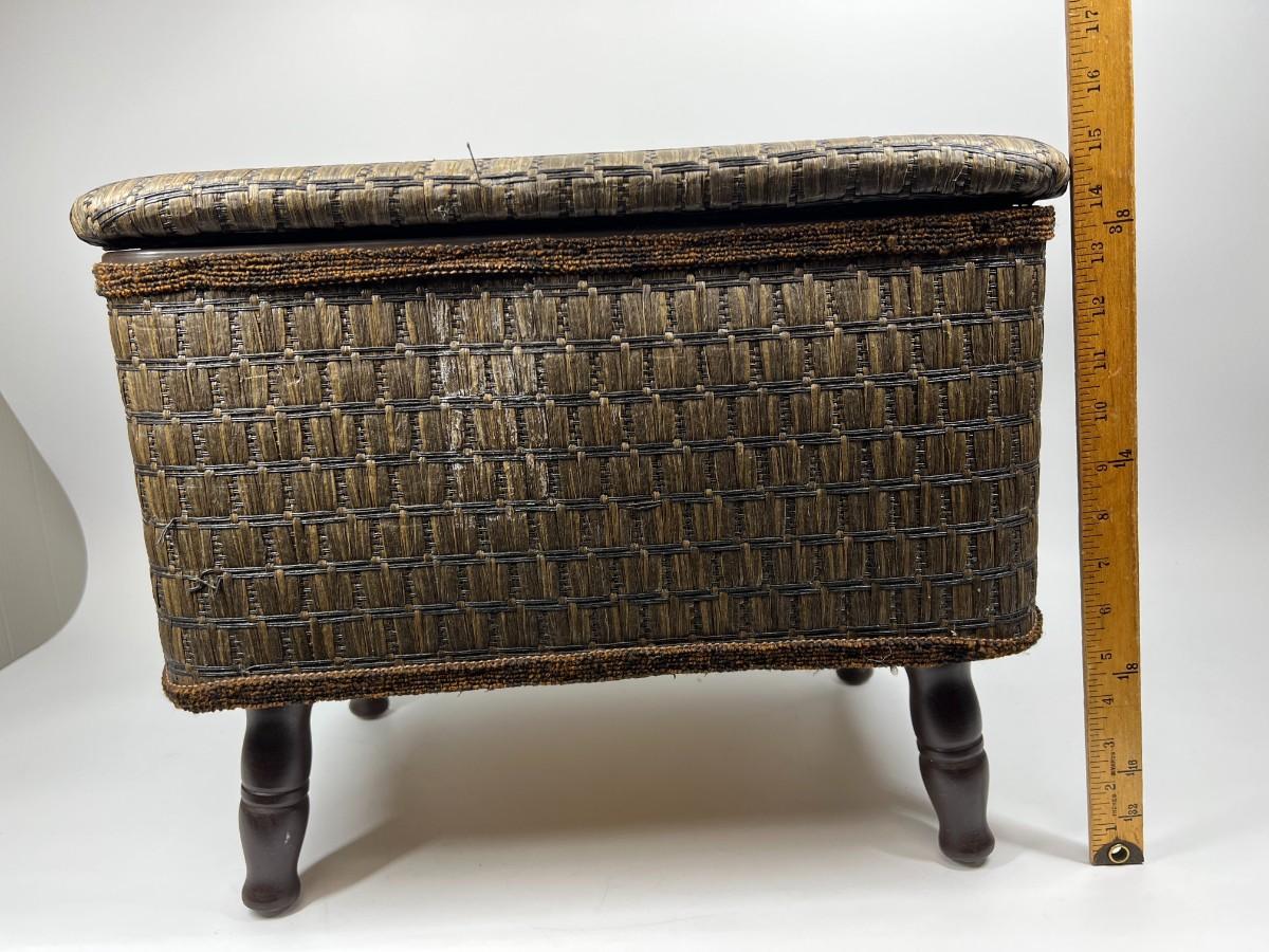 Retro Redmon Arts & Crafts Sewing Materials Storage Seat Stool with Yarn, Crochet Needles, Scissors and More, there is no significant damage to the stool and is in good useable condition. Check pictures for more details and for sizing.