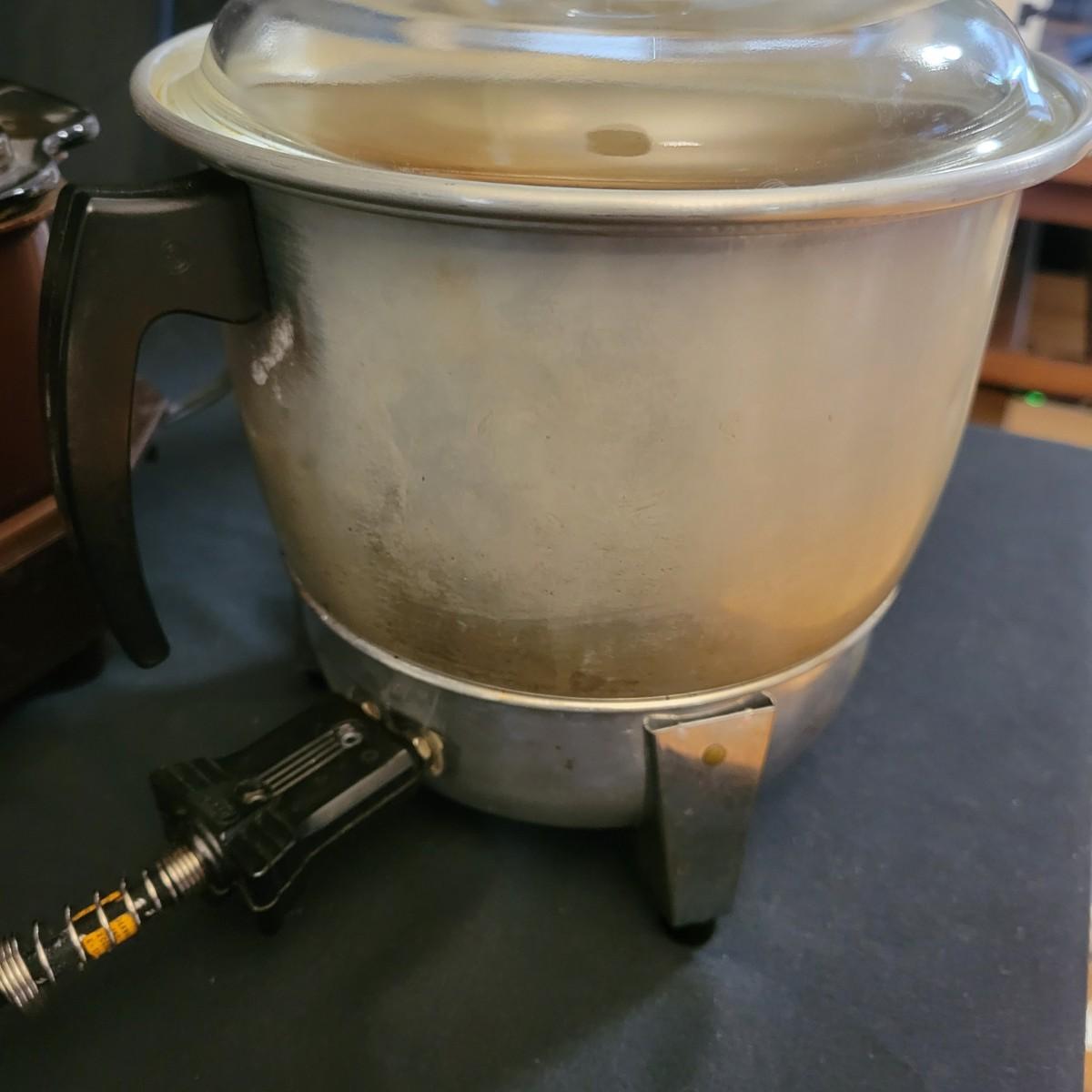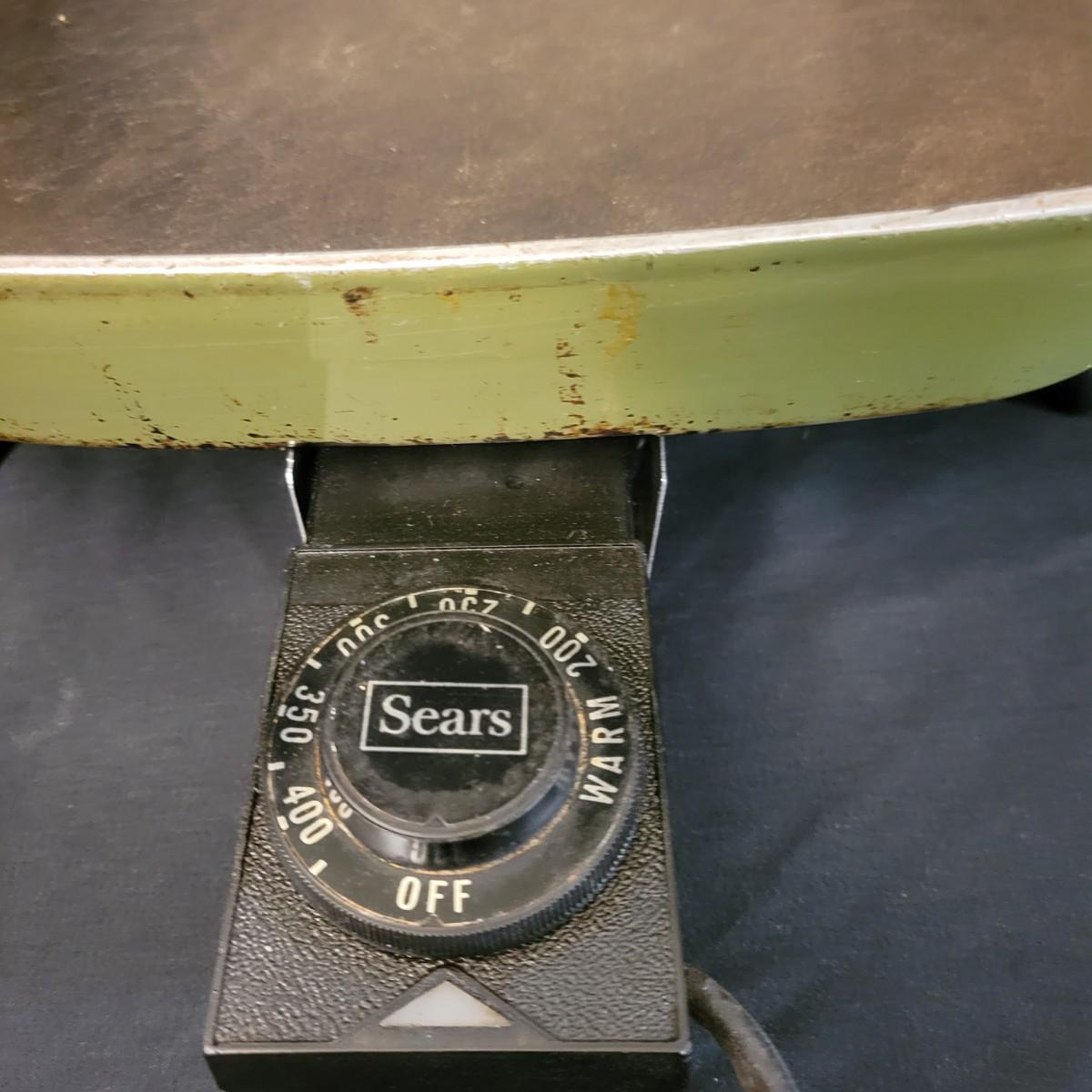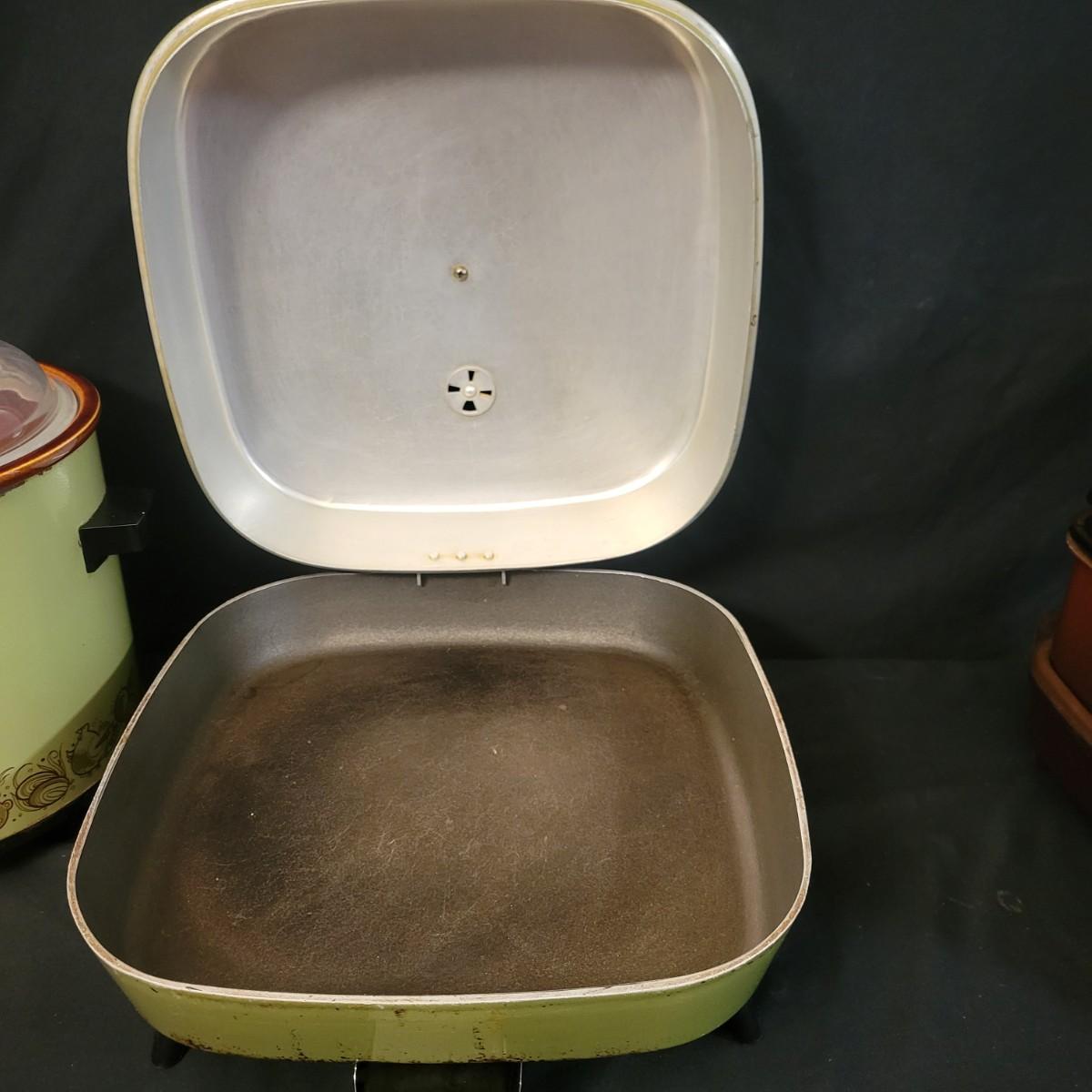 An assortment of four retro kitchen counter top appliances in good condition. All items were tested and work. Included is a Rival crockpot that appears unused, a West Bend slow cooker with a metal pan and Pyrex lid, a Sears electric skillet with lid and a Peer electric pot with a glass lid. Sears electric skillet measures approximately 12" x 12" x 7" Local pickup only