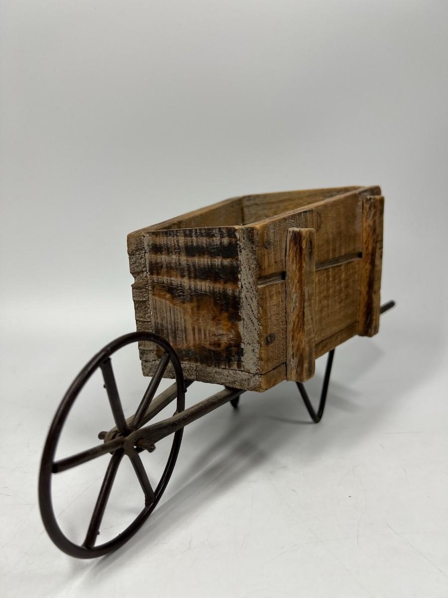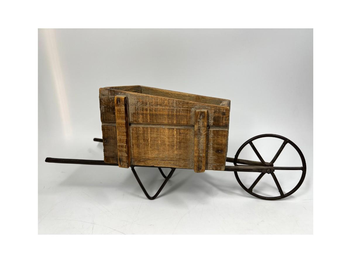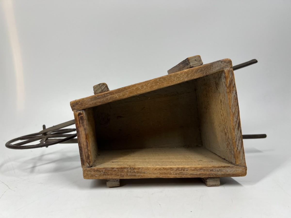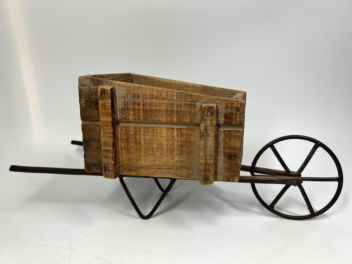 Retro Rustic Miniature Wooden & Metal Garden Yard Art Wheelbarrow, there is some light wear to the wood and metal, but there is no significant damage to the overall piece and is in good displayable condition. Check pictures for more details and for sizing.