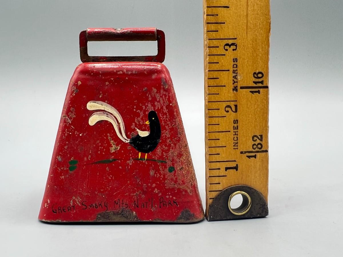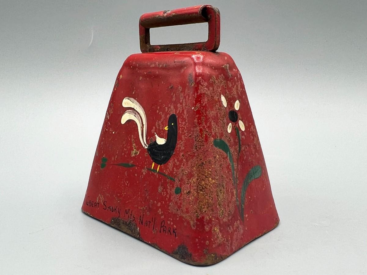Retro Rustic Small Rooster Chicken Farm Decor Cowbell, there is some retro wear to the cowbell, but there is no significant damage and is in good displayable condition. Check pictures for more details and for sizing.
