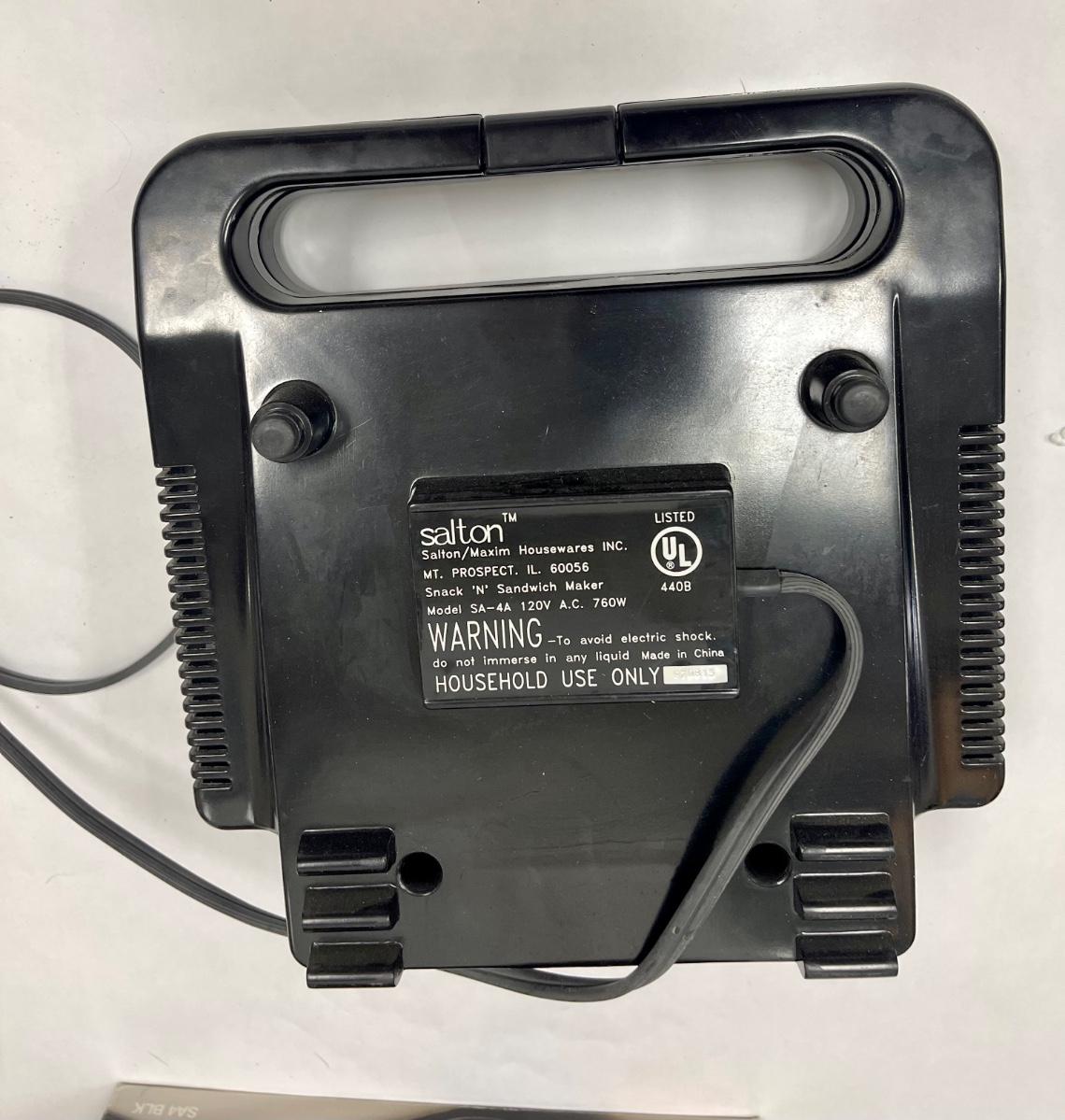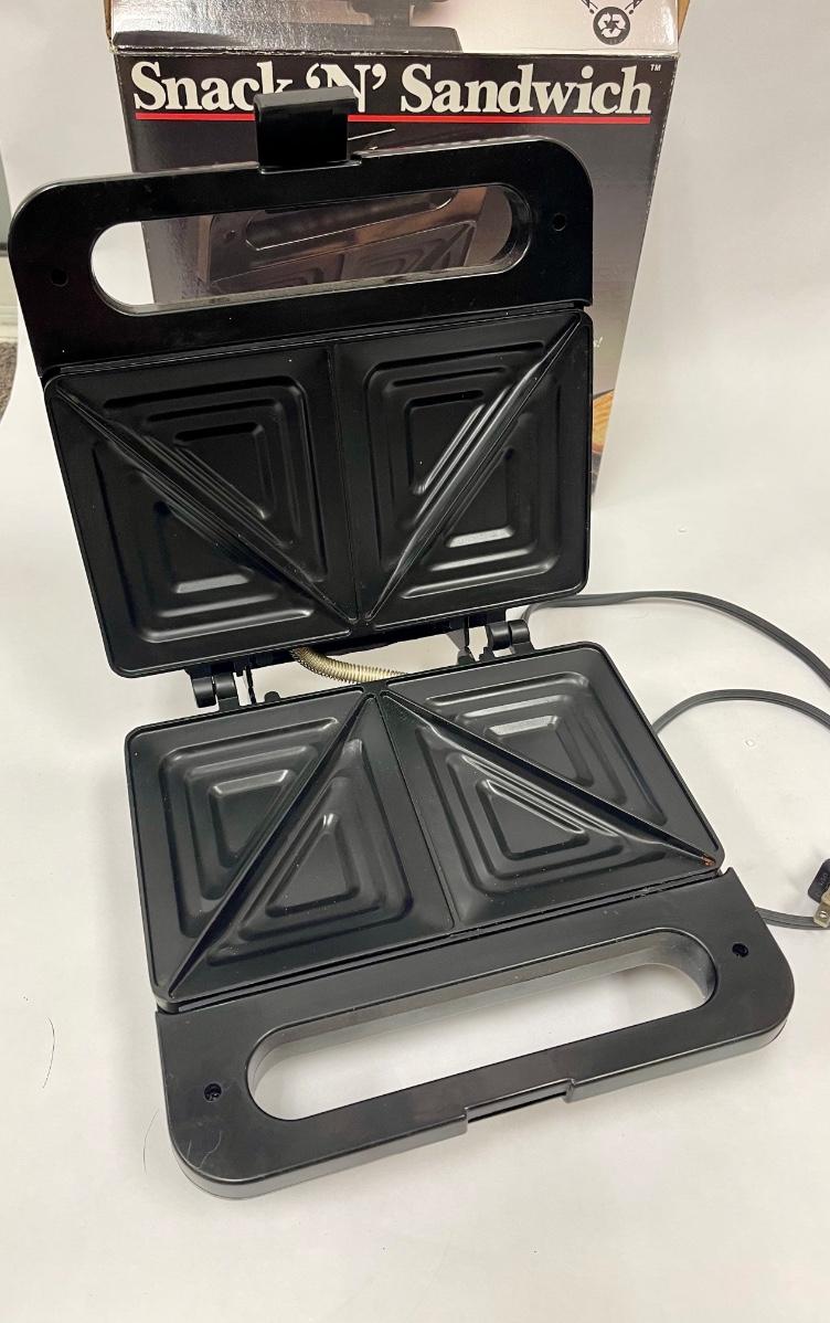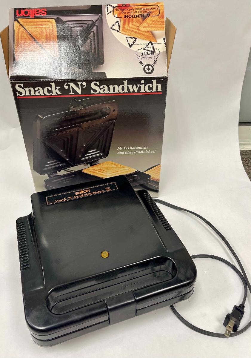 Retro Salton Snack 'n' Sandwich Electric Toaster Grill with Box, there is no significant damage to the toaster and is in overall good retro condition. Has not been tested, check pictures for more details and for sizing.