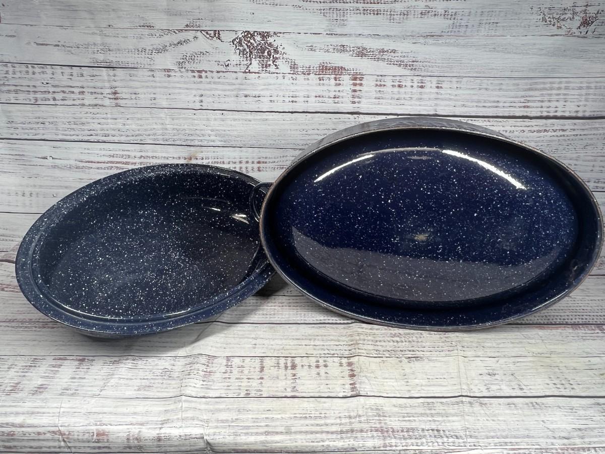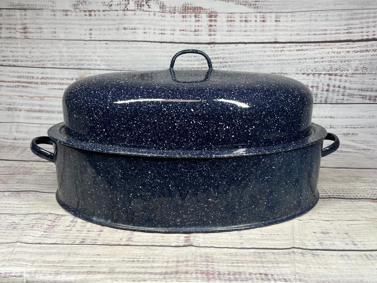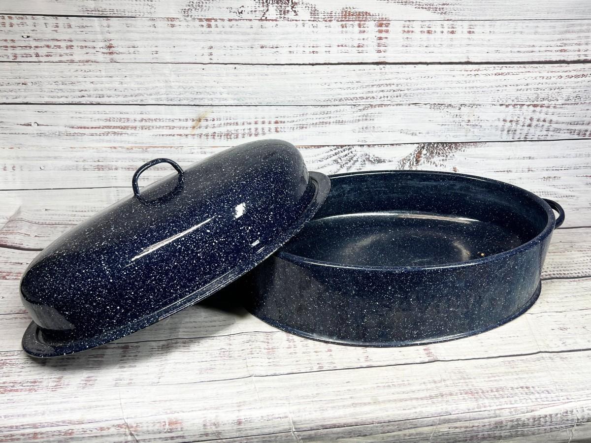 Retro Savory Blue Kitchenware Enamelware Chicken Roaster, there is no significant damage to the roaster and is in good useable condition. Check pictures for more details and for sizing