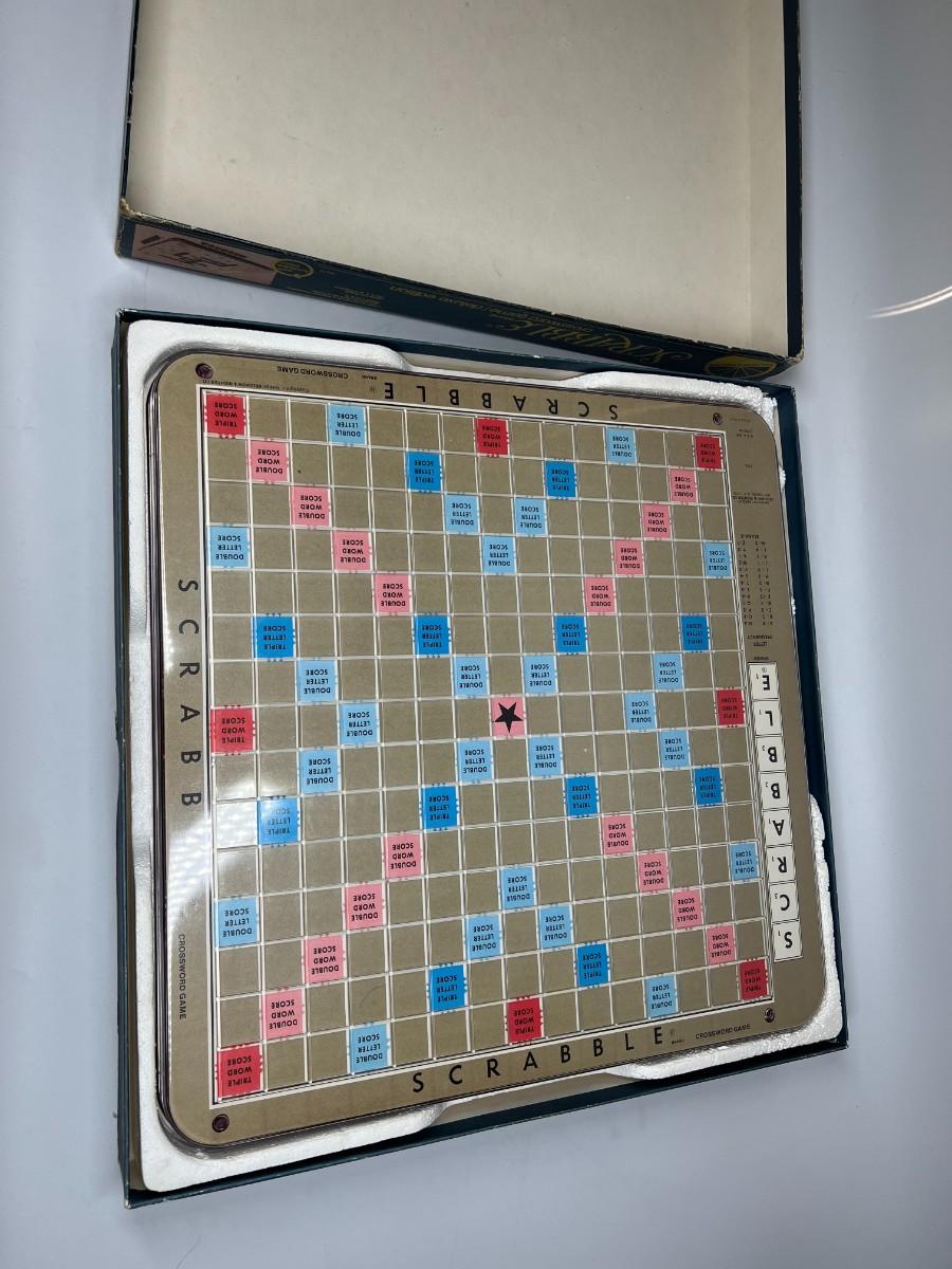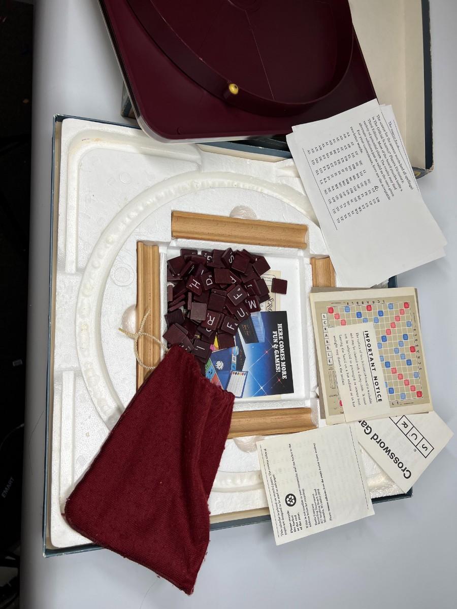 Retro Scrabble Deluxe Edition with Turntable Base by Selchow & Righter, there is some light wear, but there is no significant damage to the game set and is in good useable condition. The game set looks to be completed to mostly complete, check pictures for what is included in the lot.
