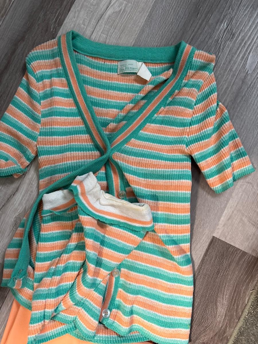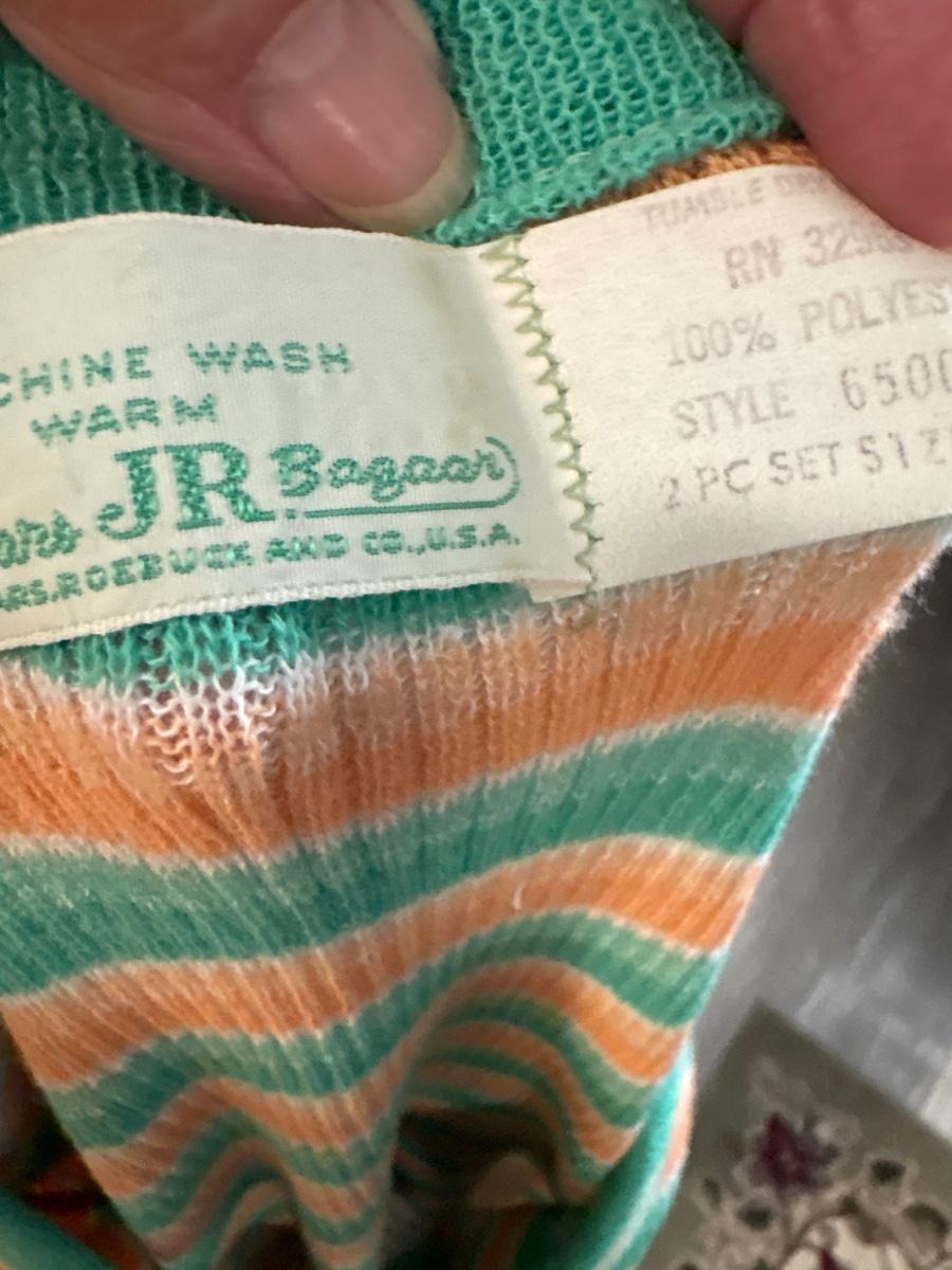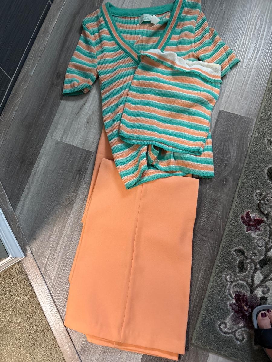 Great retro pants with a flare, and striped knit button, top and halter top, very cool! Size small