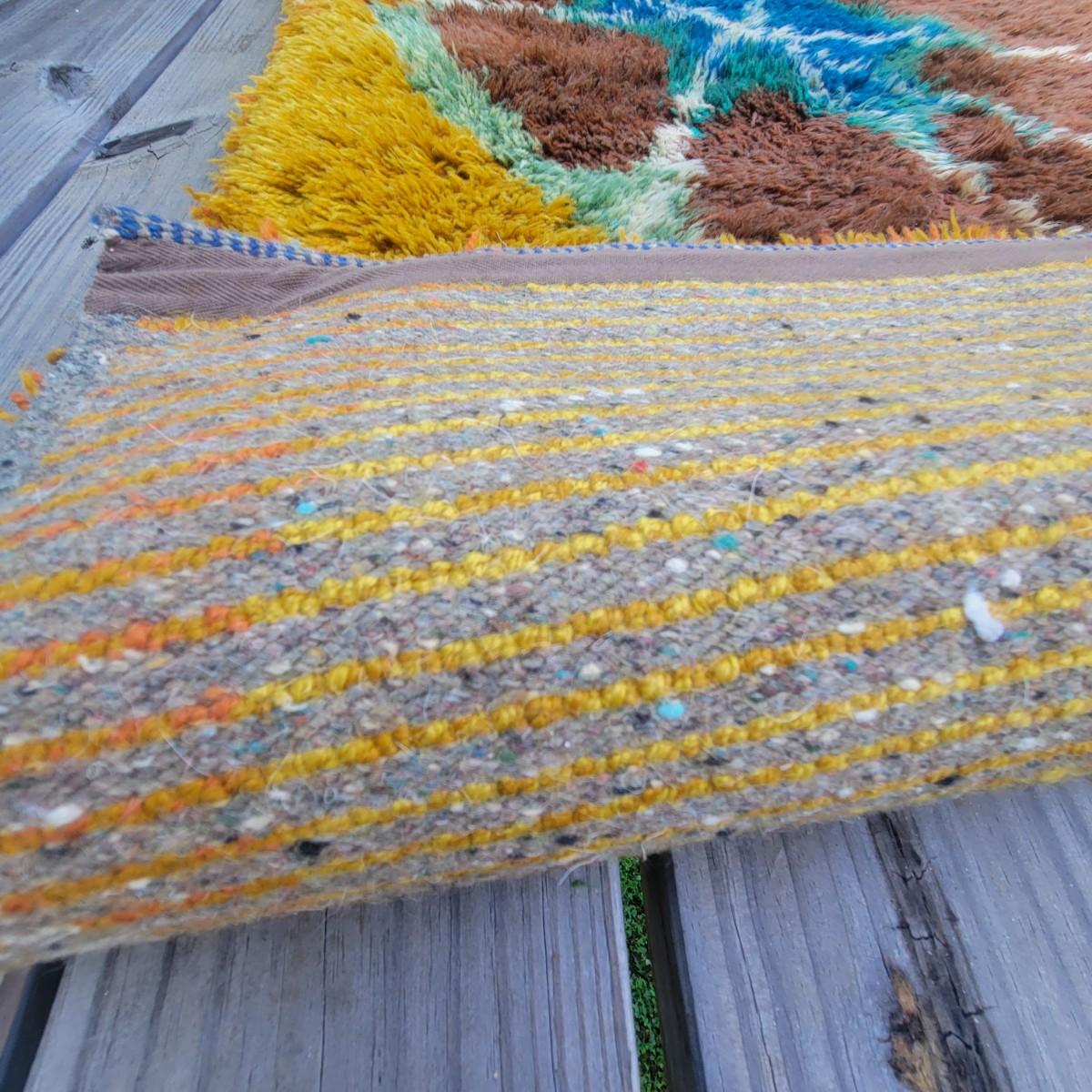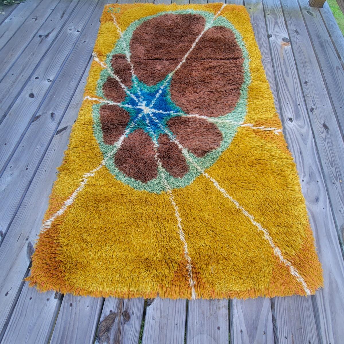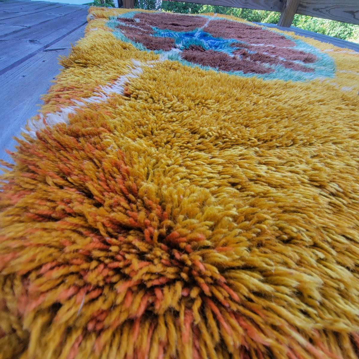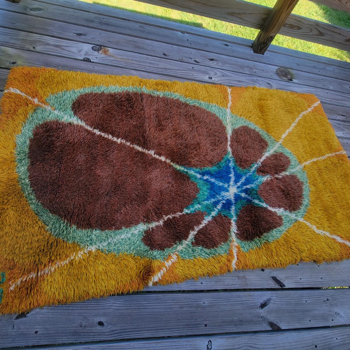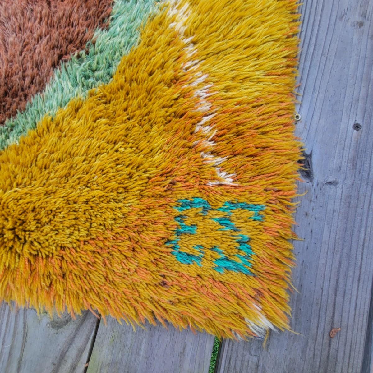 Retro shag rug with a vivid color scheme. Appears to be handmade based on initials and backing. Rug measures approximately 76" x 42" Shipping available. Shipping may be costly, we suggest calling our local UPS with dimensions and getting an estimate prior to bidding. 828-252-6930.