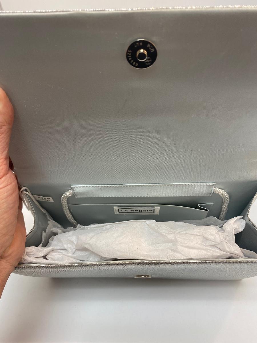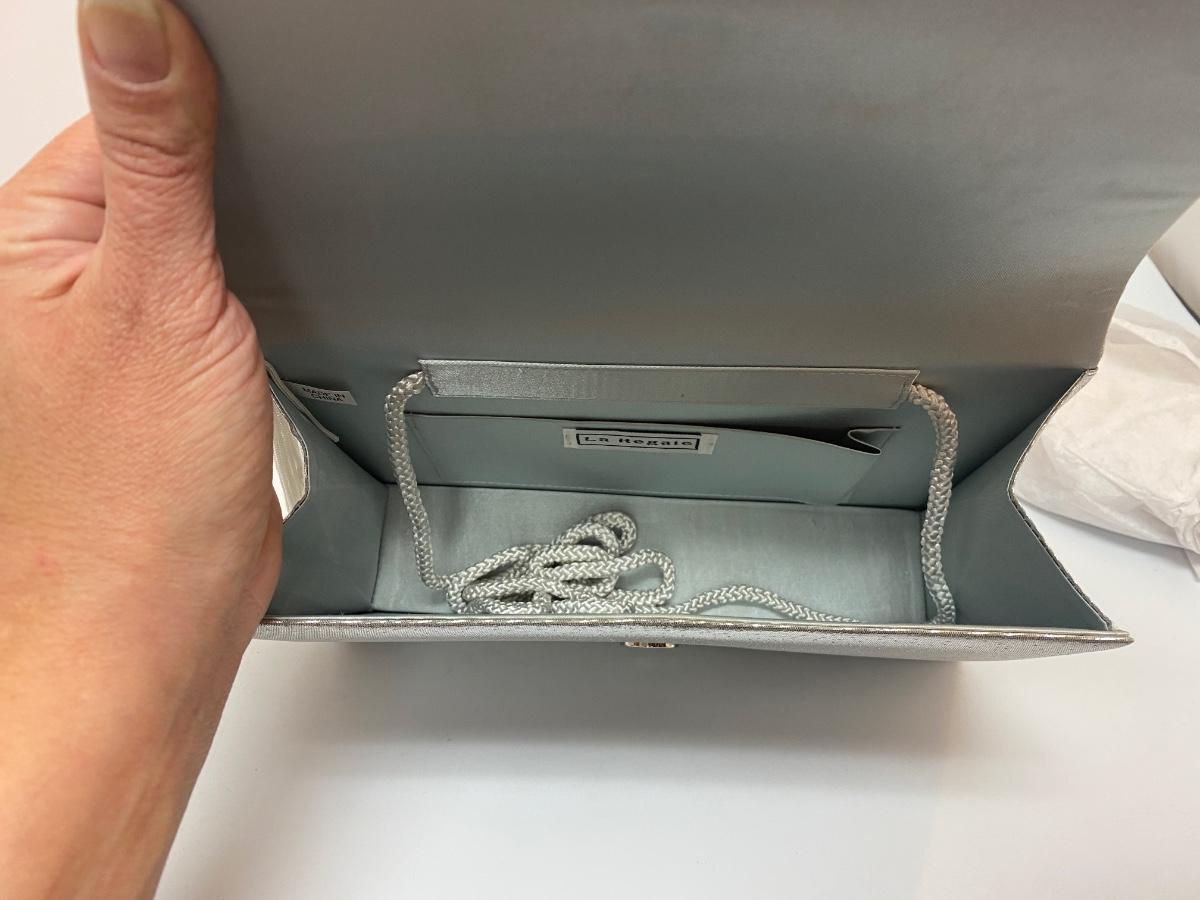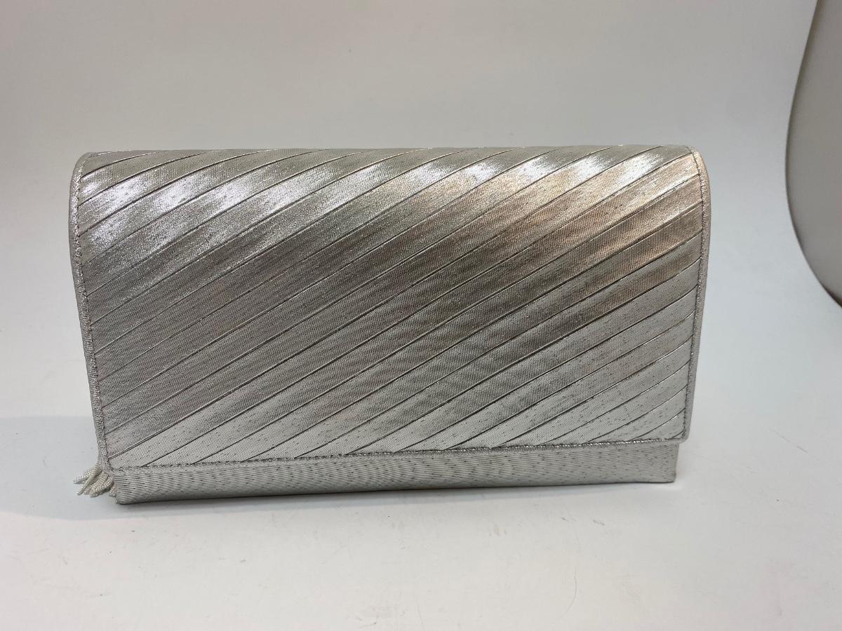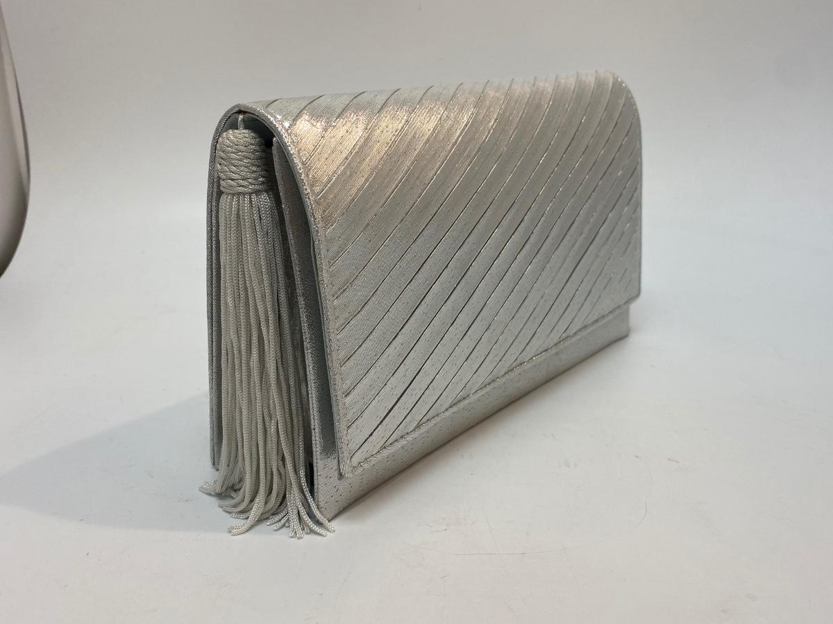 Retro Silver Clutch Purse. Has a thin rope strap to make it a shoulder bag. In good condition, looks unused.