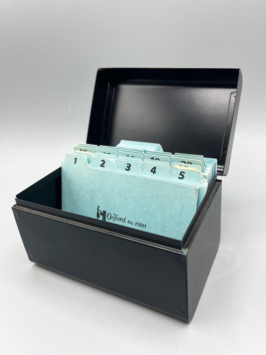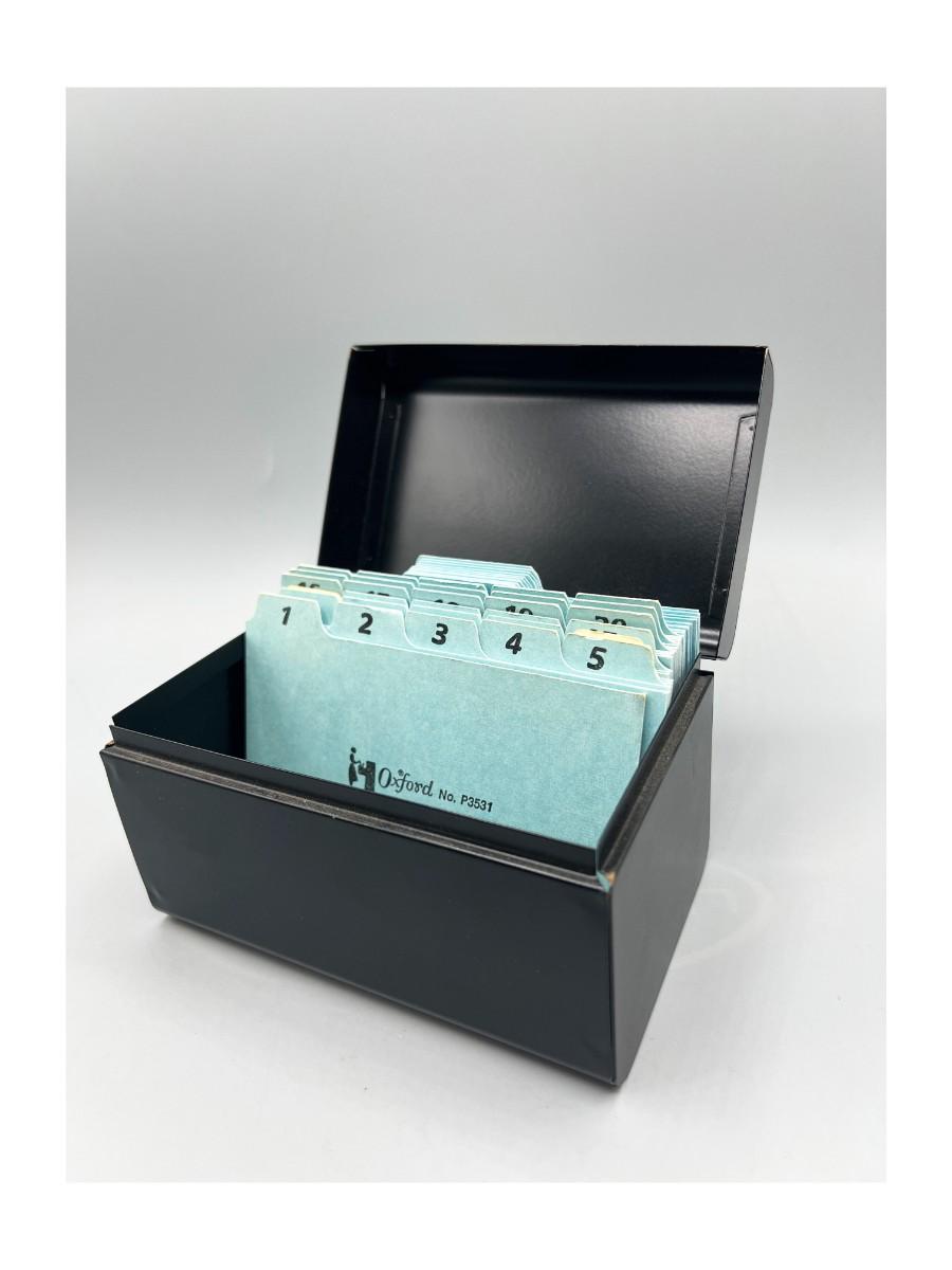 Retro Steelmaster Steel Index Card Desktop Organizer with Oxford Dividers, there is no significant damage to the piece and is in good retro useable condition. Check pictures for more details and for sizing.