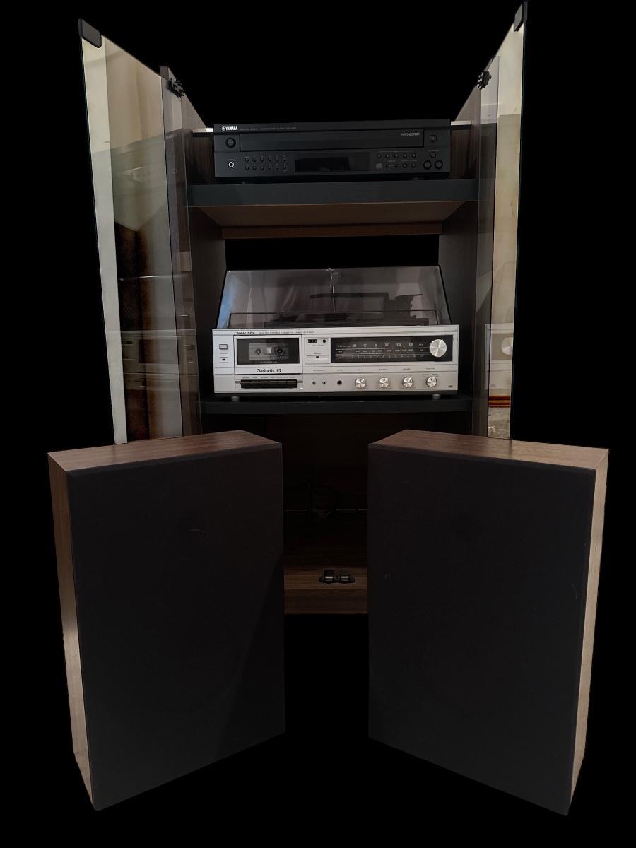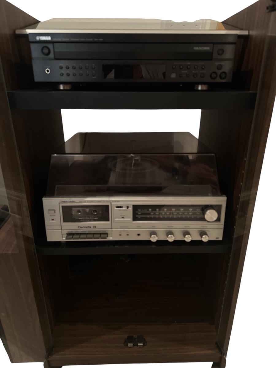 This setup is ideal for vinyl collectors or retro audio enthusiasts, offering cassette playback, radio tuning, and CD functionality in a cohesive vintage presentation.