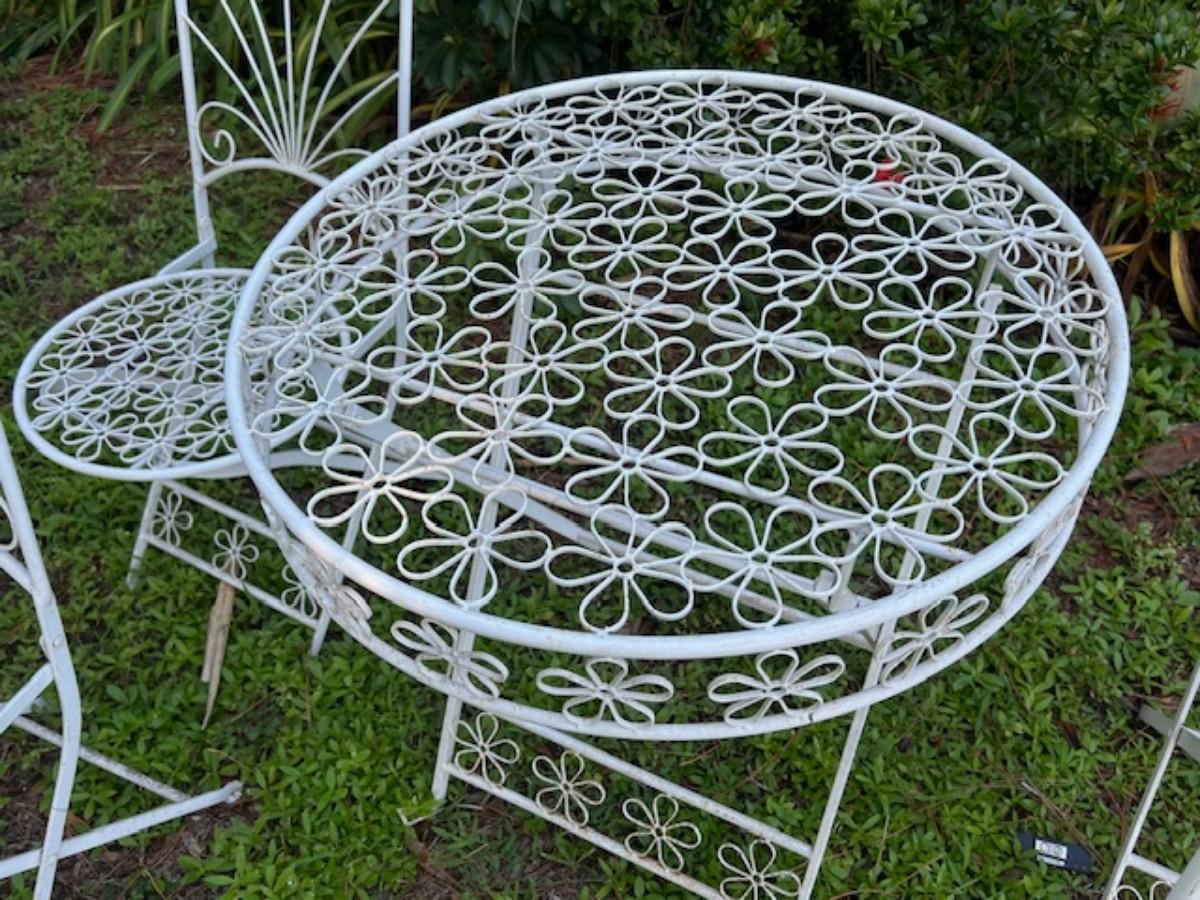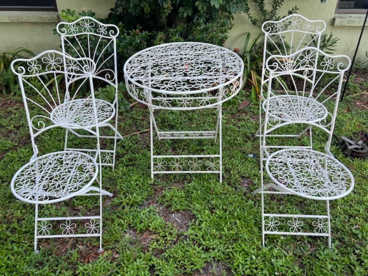 Chairs are collapsible. Total of 4 chairs and a table. Age related wear. Measurement: 37"H (table); 31"H (chairs).