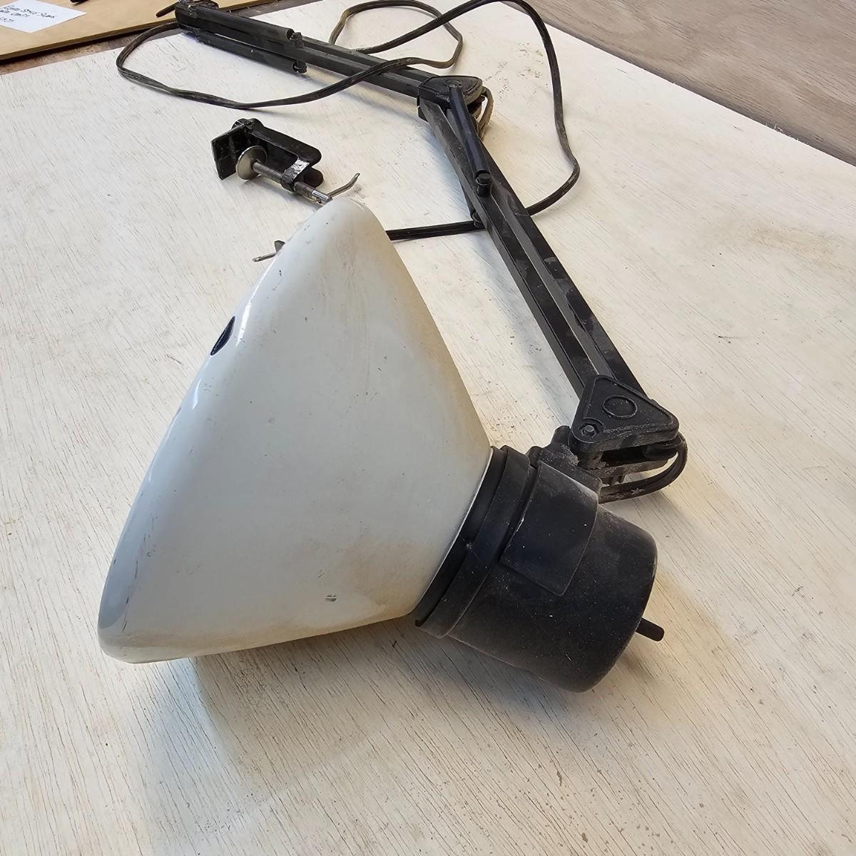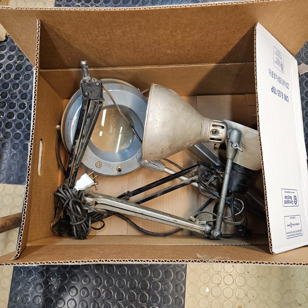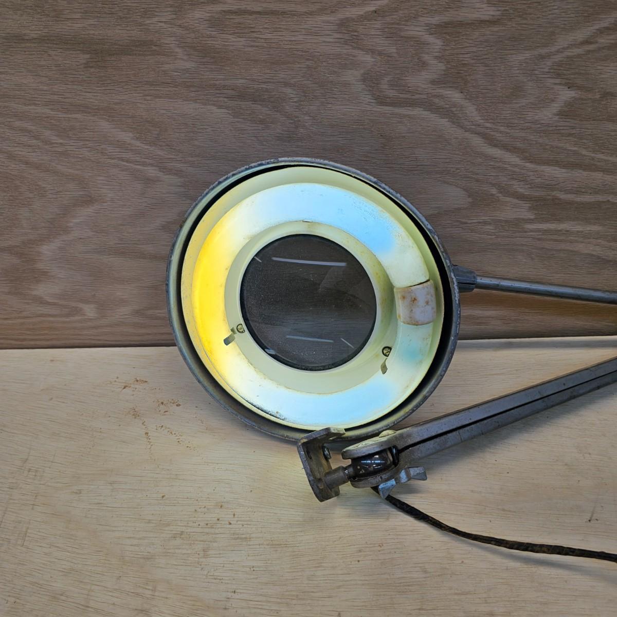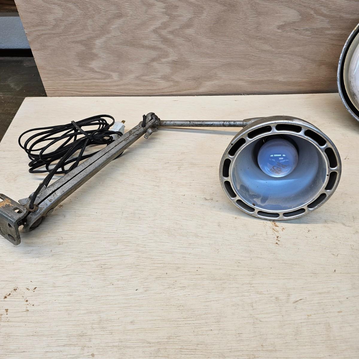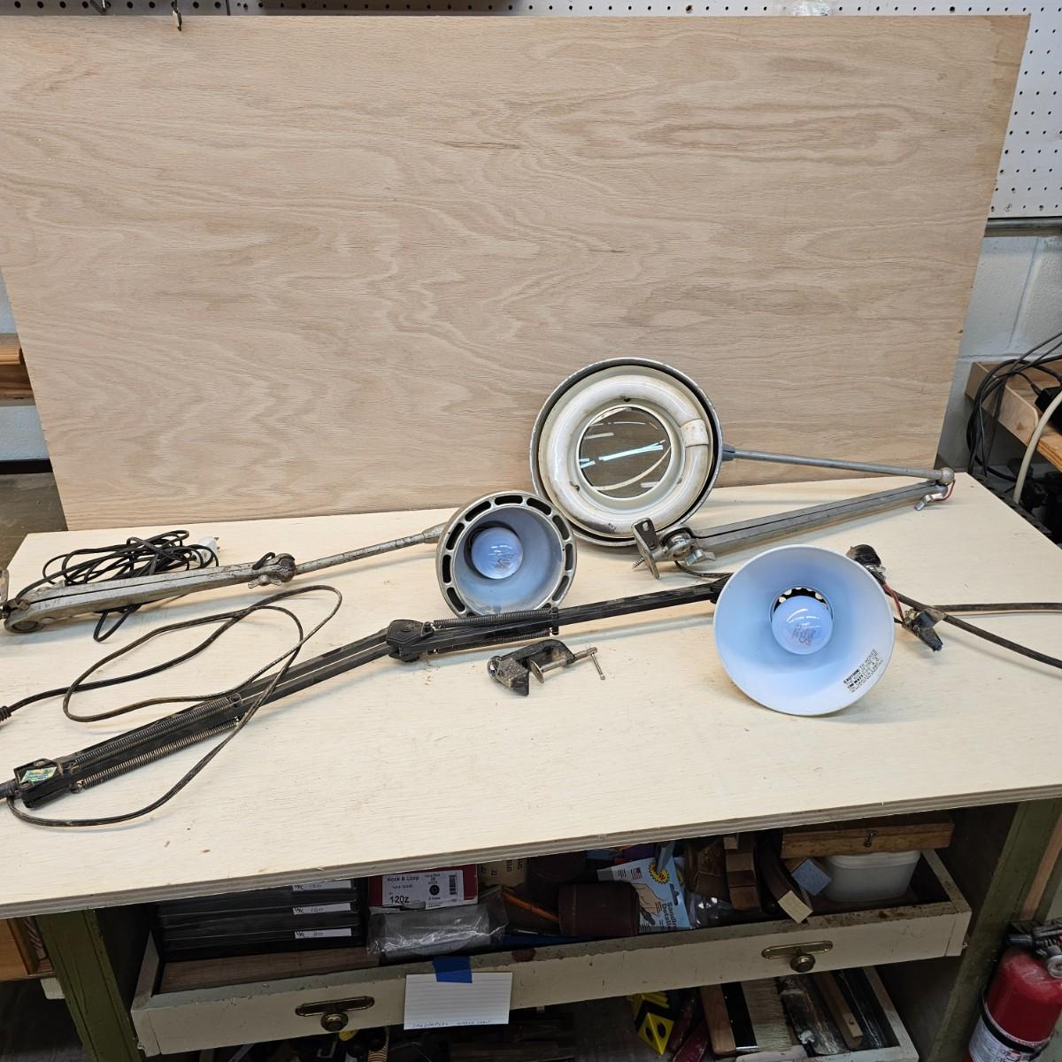 Three older style swing arm lamps, one with magnifier in the center. Designed to be mounted or clamped on work surface. Small silver lamp is 8"D x 25"H. Black/white item is 8"D x 35"H. Magnifying light is 10" D x 42"H, may need some rewiring for safety. All items powered on when plugged in. See photos for details. Local pickup only.