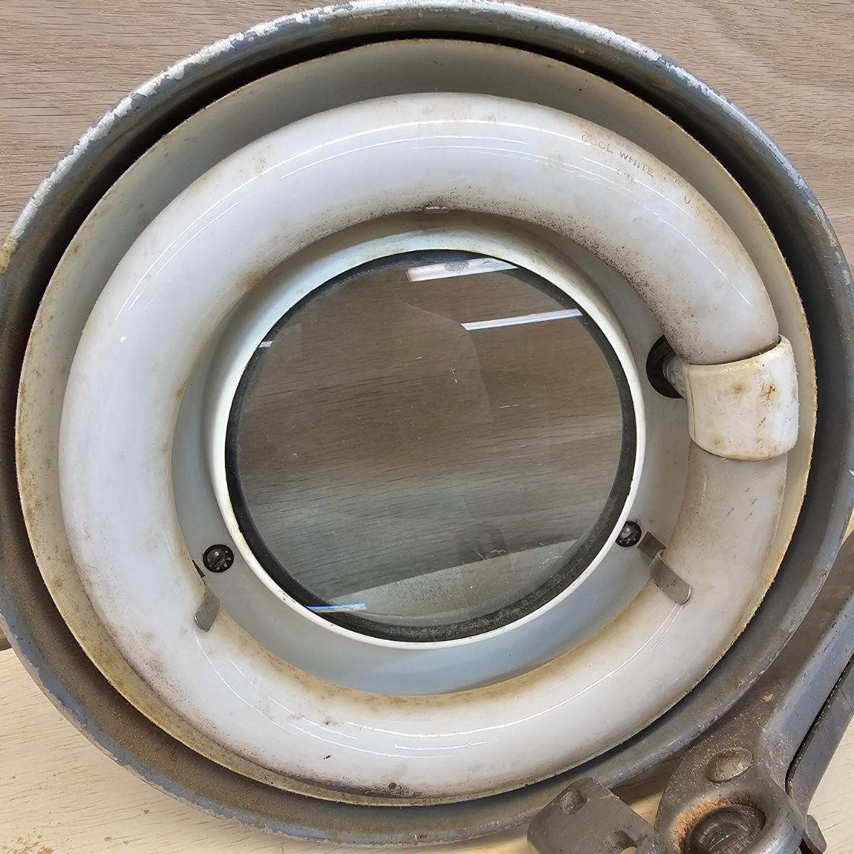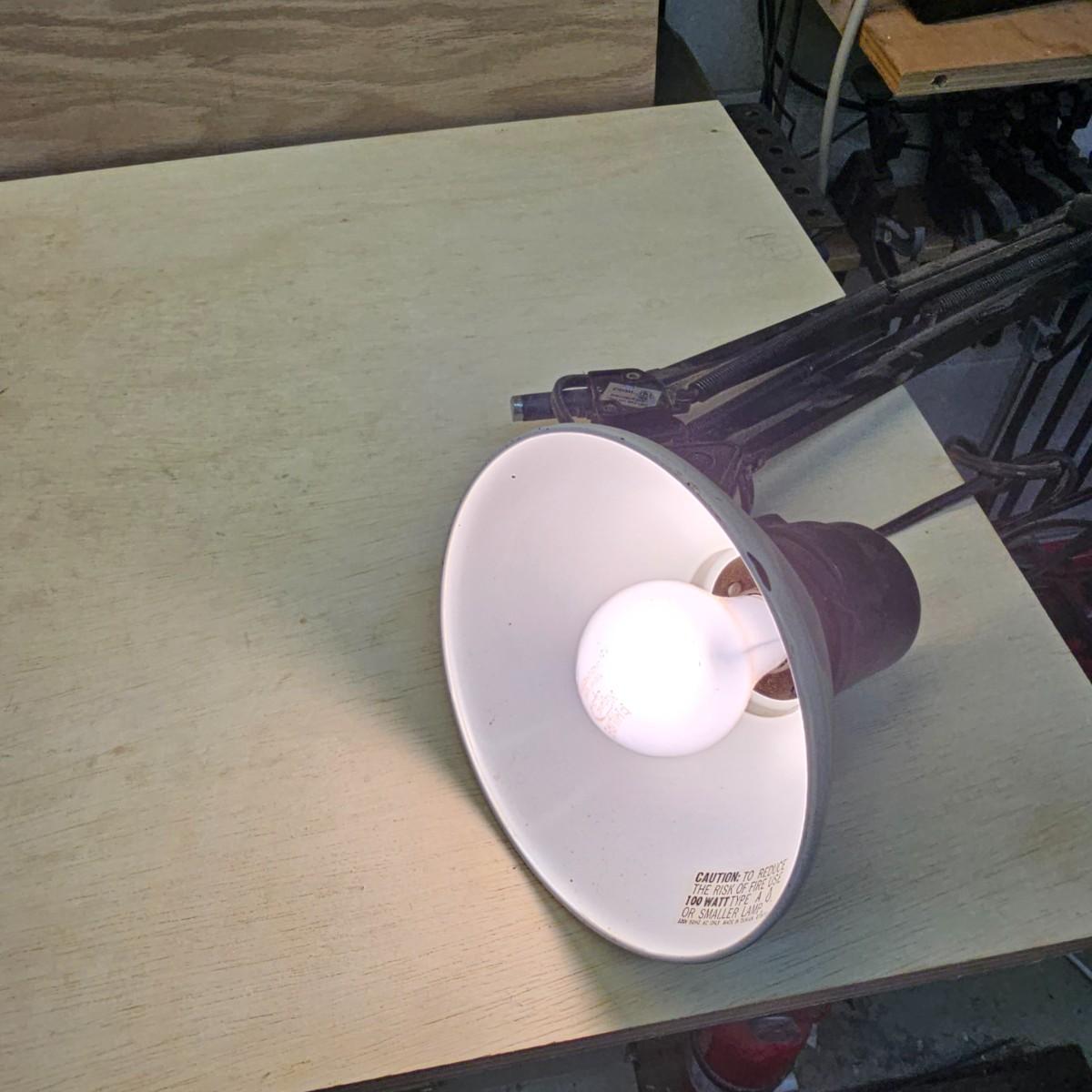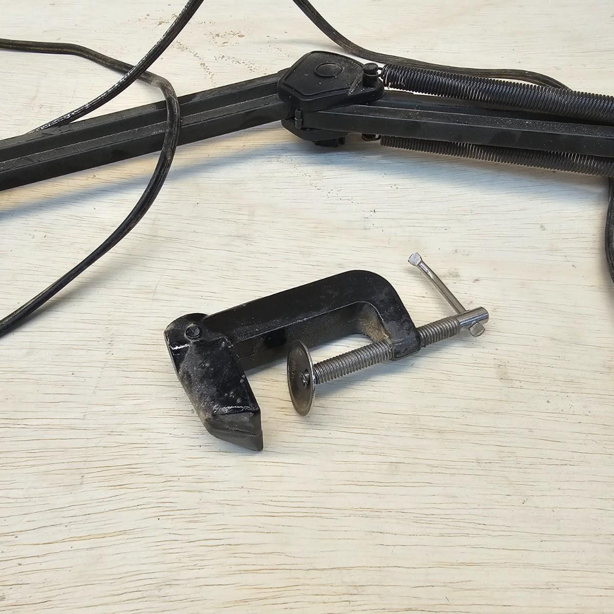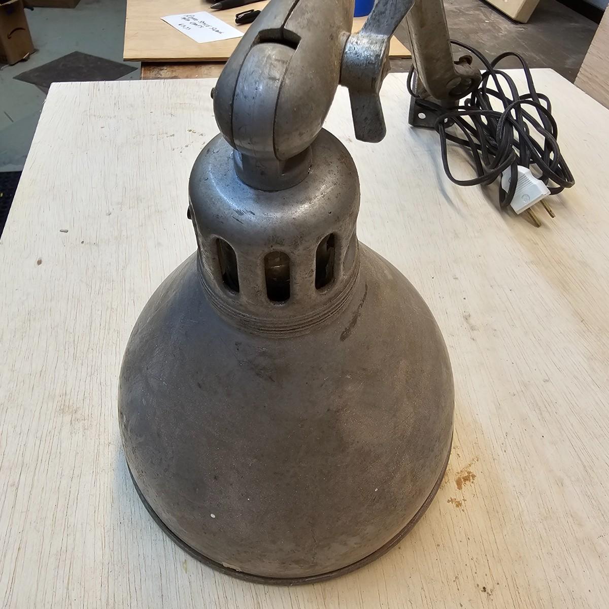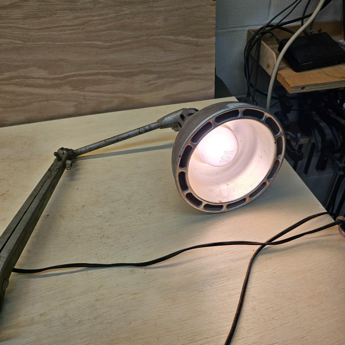 Three older style swing arm lamps, one with magnifier in the center. Designed to be mounted or clamped on work surface. Small silver lamp is 8"D x 25"H. Black/white item is 8"D x 35"H. Magnifying light is 10" D x 42"H, may need some rewiring for safety. All items powered on when plugged in. See photos for details. Local pickup only.