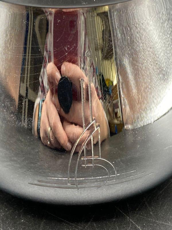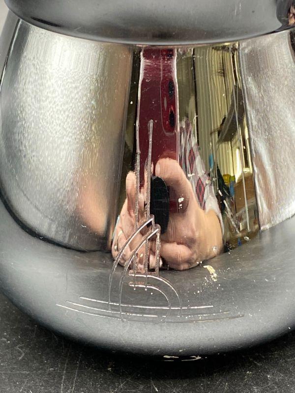 Retro Sunbeam cream and sugar set. High shine stainless steel with an art deco stamped design. About 3.5" tall. Hard to photograph due to reflectiveness.