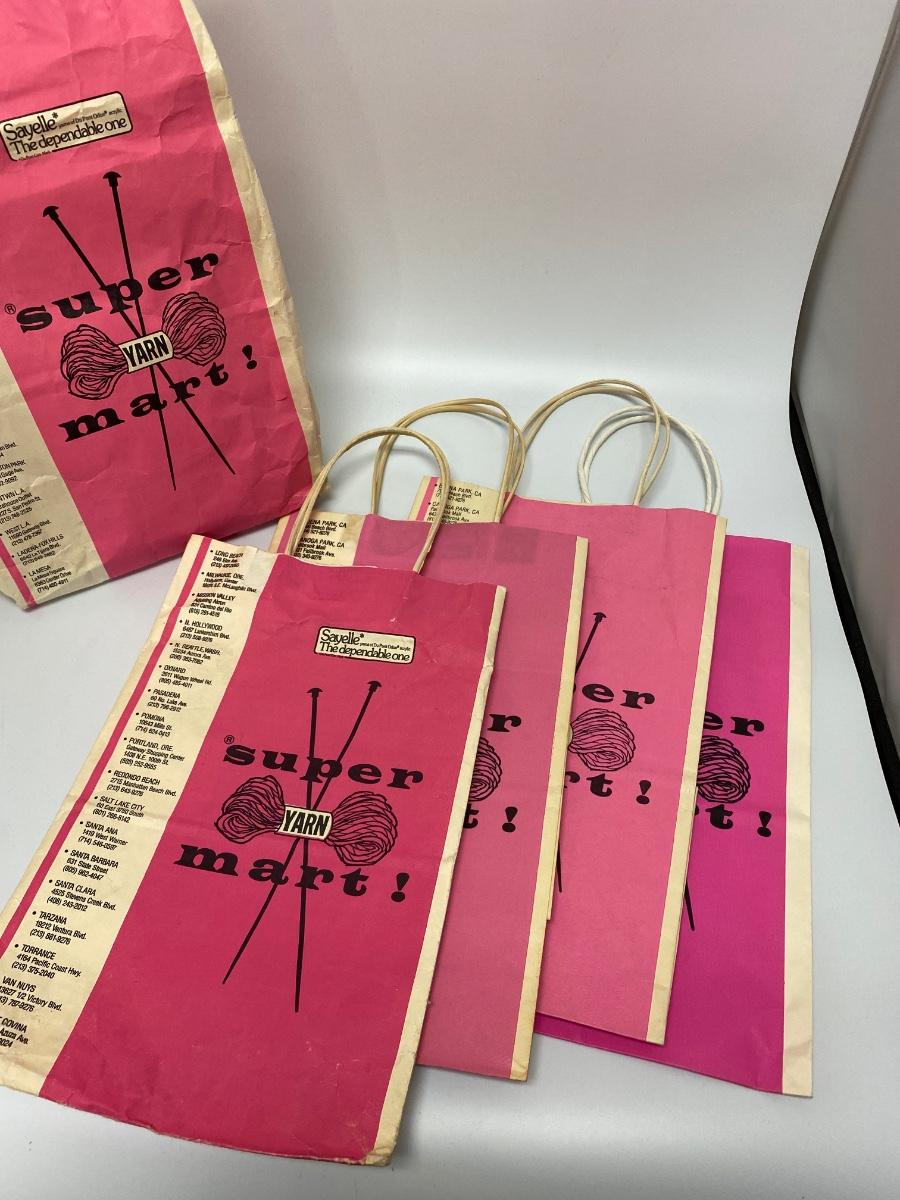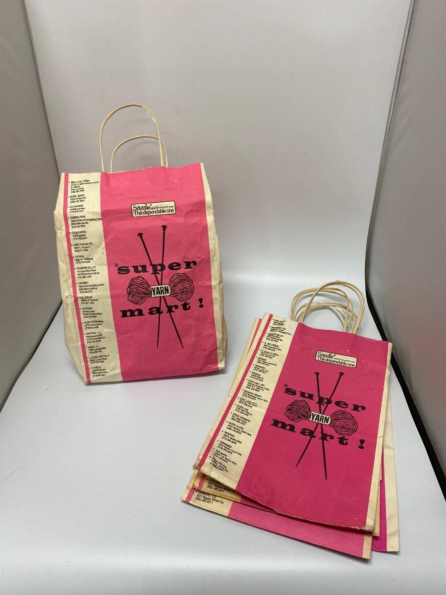 Lot of retro paper bags from Super Yarn Mart. One has a small unfinished crochet project in it, with needles and yarn.