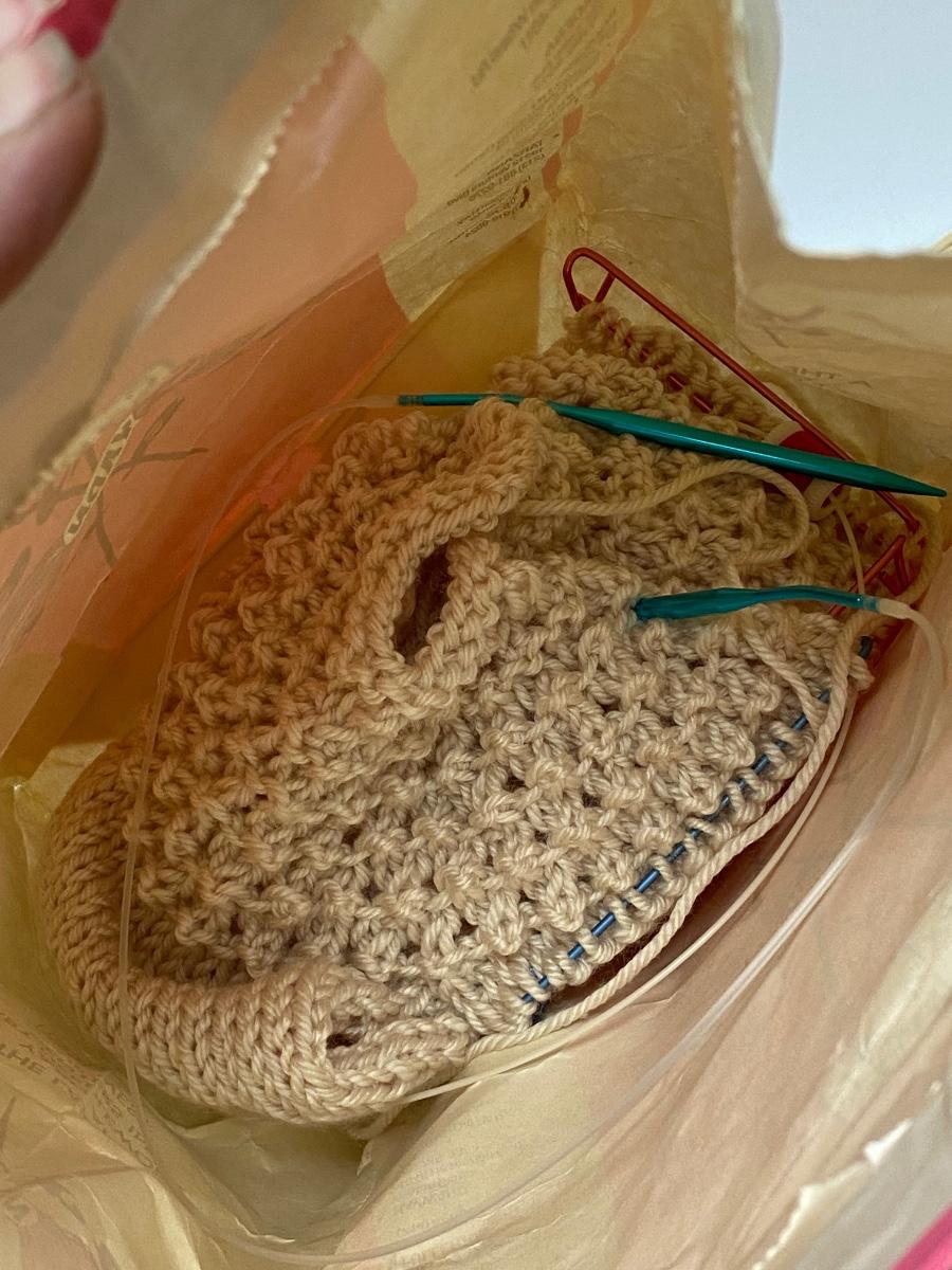 Retro Super Yarn Mart Handled Paper Bags & Unfinished Crochet Project