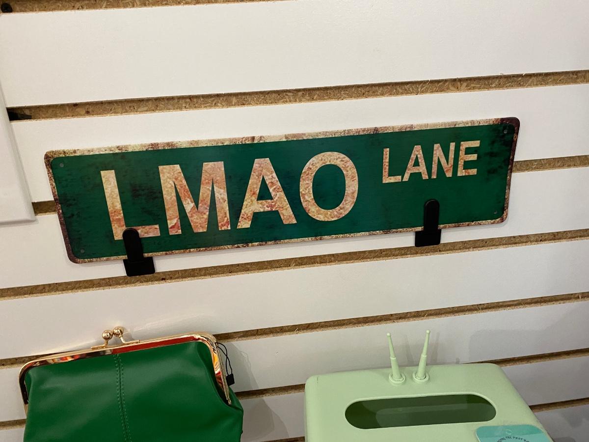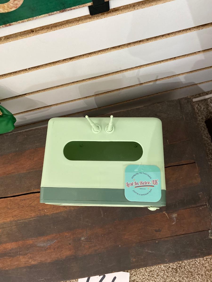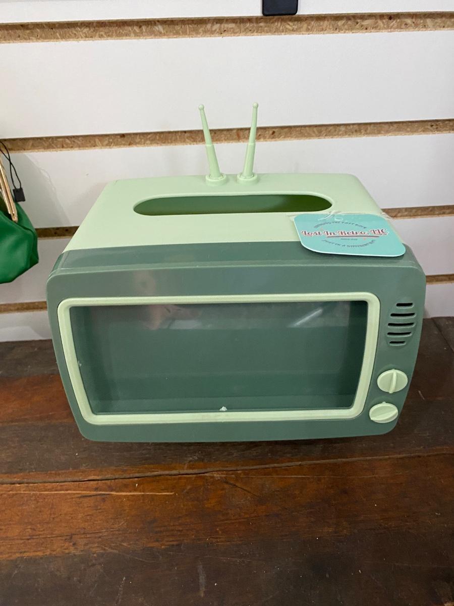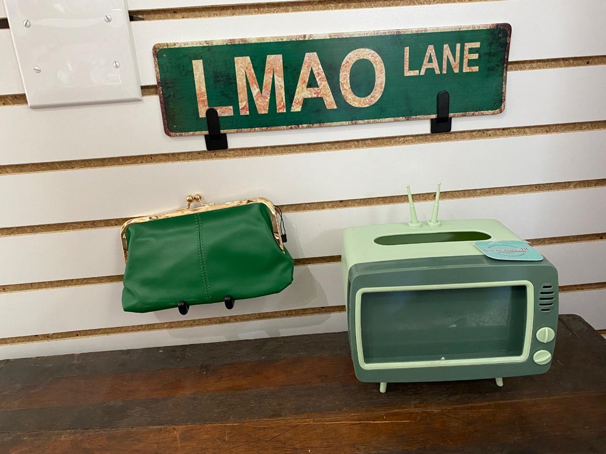 RETRO LOOK TELEVISION TISSUE HOLDER/PHONE HOLDER COMBO, GREEN CLUTCH AND LMAO LANE. SIGN