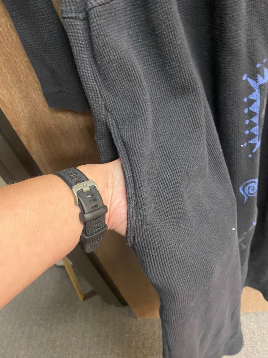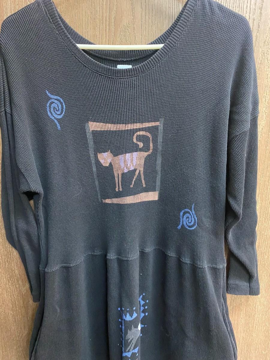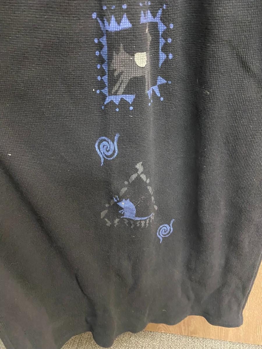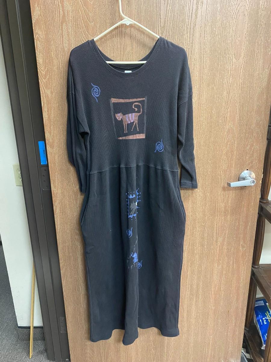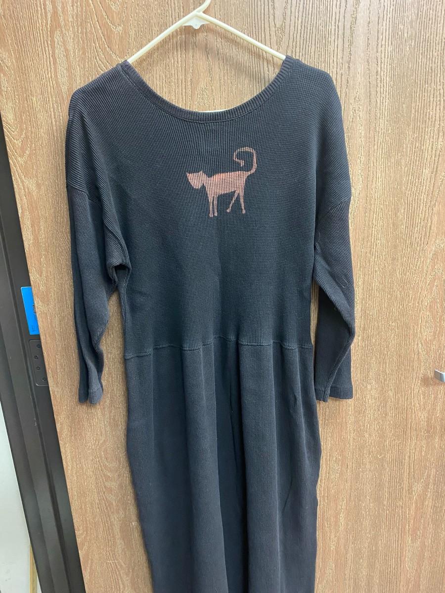 Retro Thermal Waffle Weave Black Loungewear Dress Stamped Pattern Design. In good condition. Does have some fade from age but nothing to obvious. Has pockets. No size, guessing it is a large.